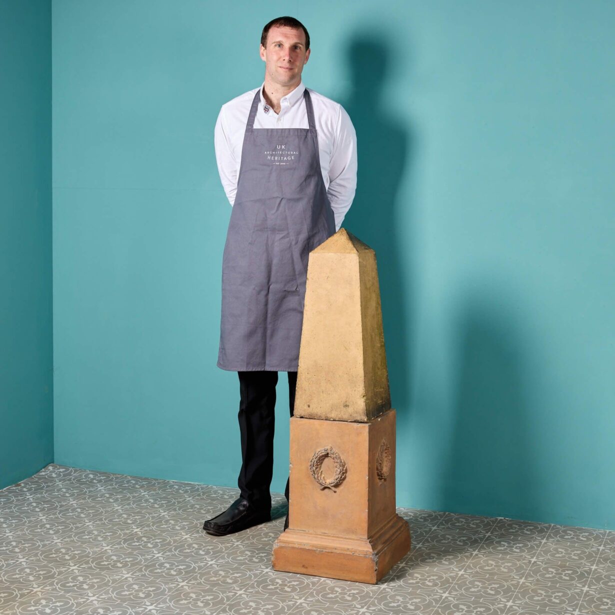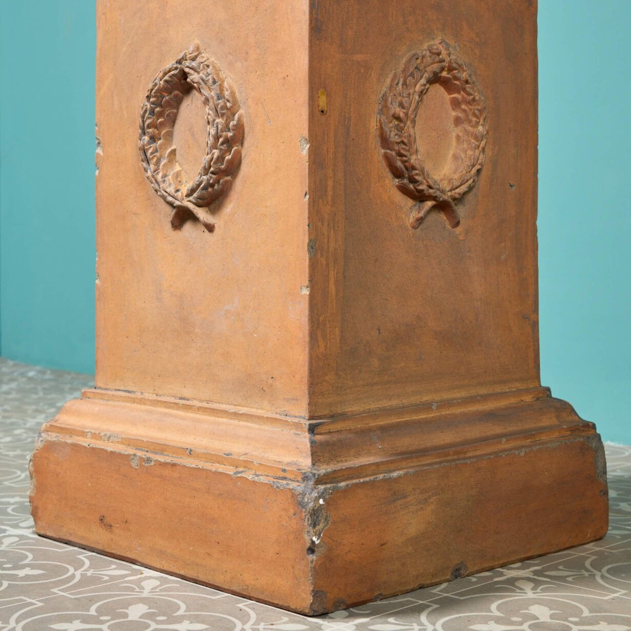 back to topThis mid-late 19th century antique garden obelisk brings prestige and grandeur to any outdoor setting. Made in buff terracotta, it has an almost golden tone with one side unusually painted with simulated marble effect finish. The striking obelisk sits upon a terracotta plinth decorated on all four sides with a wreath. There is no makers mark, but this design is akin to the styles of Blanchard or Blashfield.