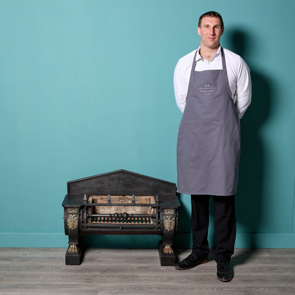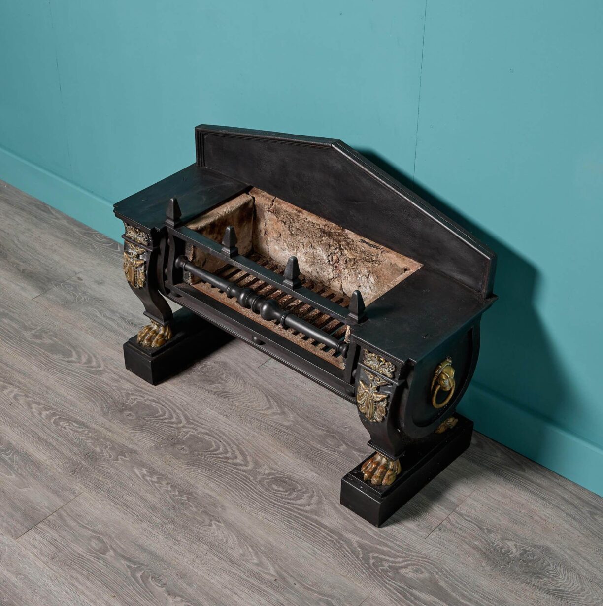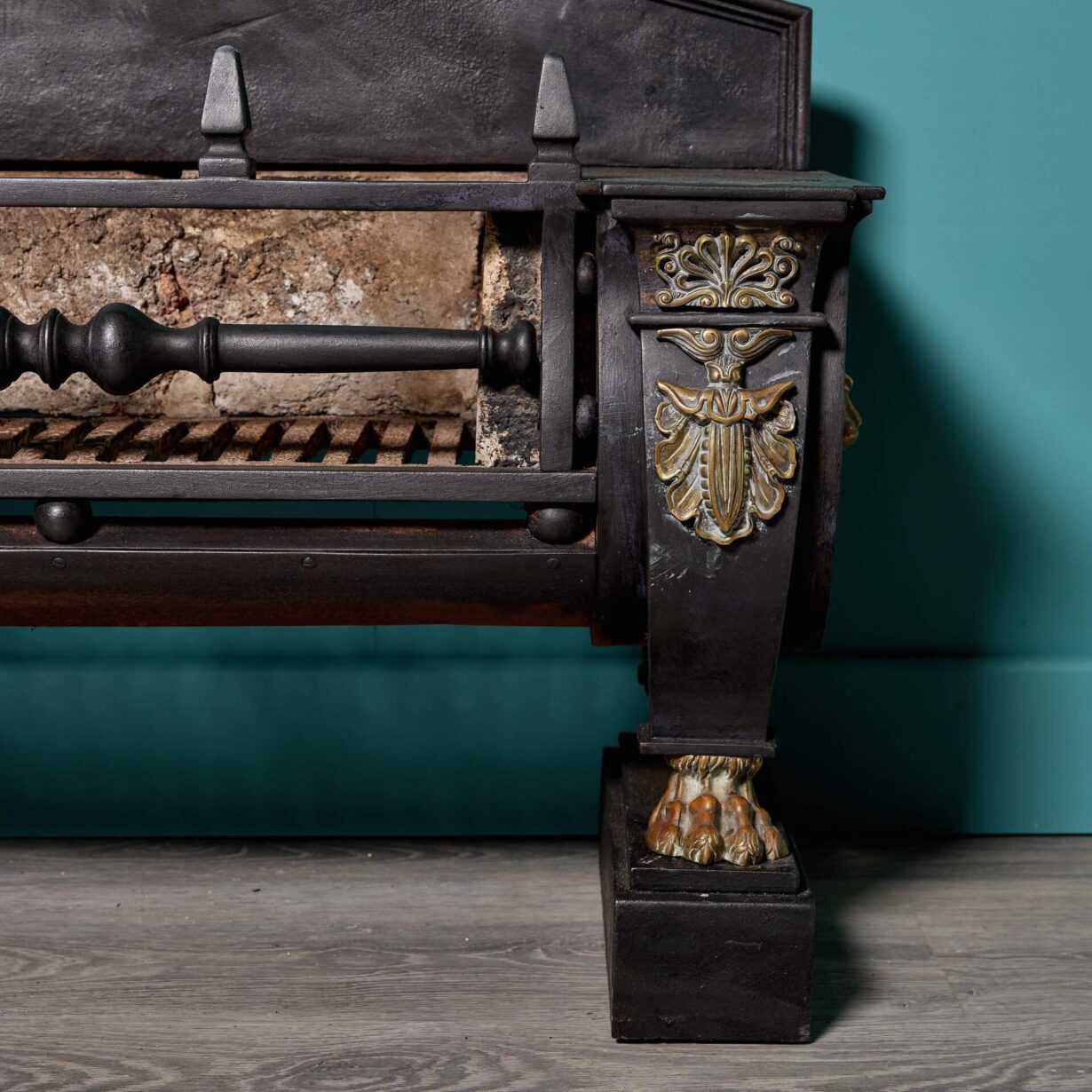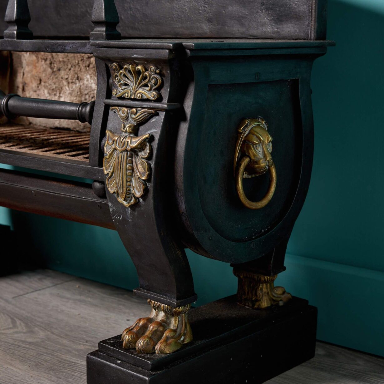 The original brass decorative elements include front and rear lion paw feet, a lion mask with ring handles to the sides, Anthemion and Palmettes to the front. The perfect pairing for a large Georgian era fire surround.
