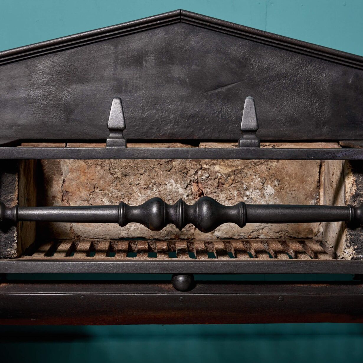 back to topAn antique sarcophagus hob grate in the manner of George Bullock. This English Regency period grate is constructed in striking cast iron and brass and finished in black graphite polish.
