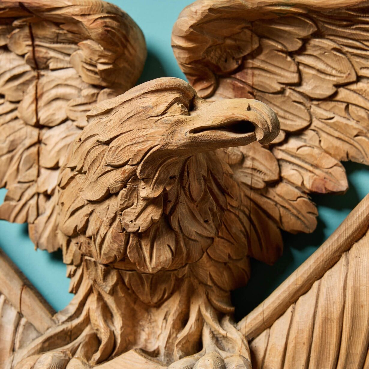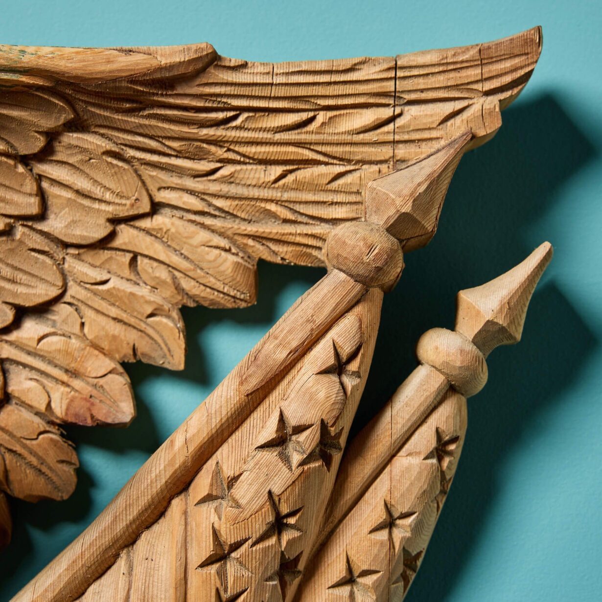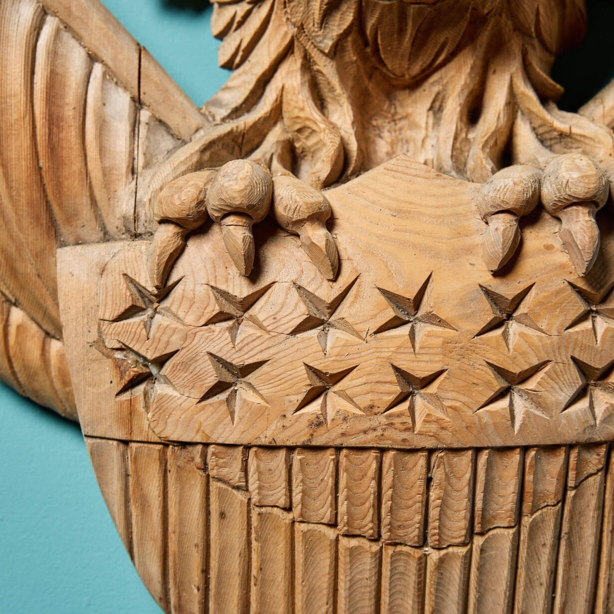 This superbly carved sculpture exudes might and influence, the bald eagle carved with wings outspread, its mighty talons perched atop a carved American shield.