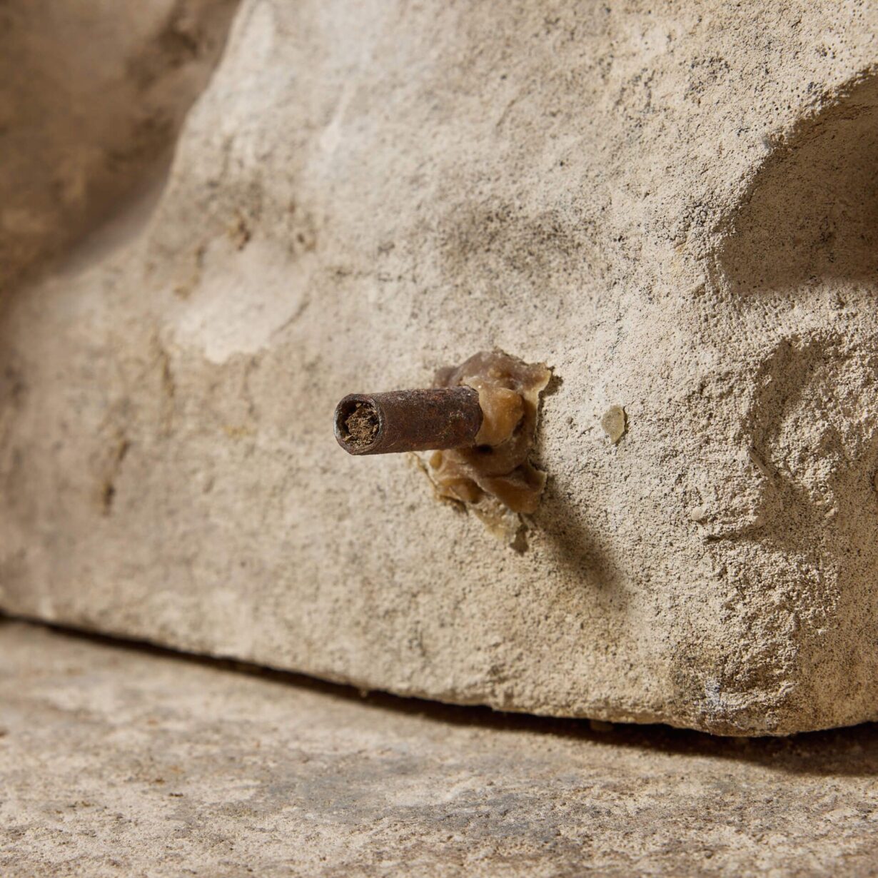 Three heads are showcased to the sides and front, with tails spirting from the top. This magnificent structure sits on top of a thick stone slab.