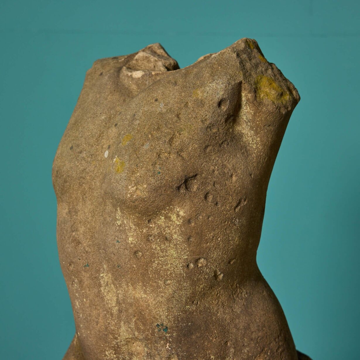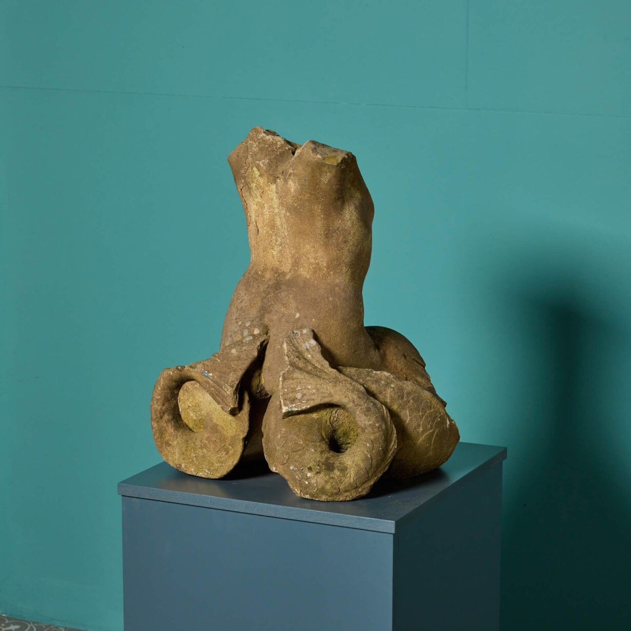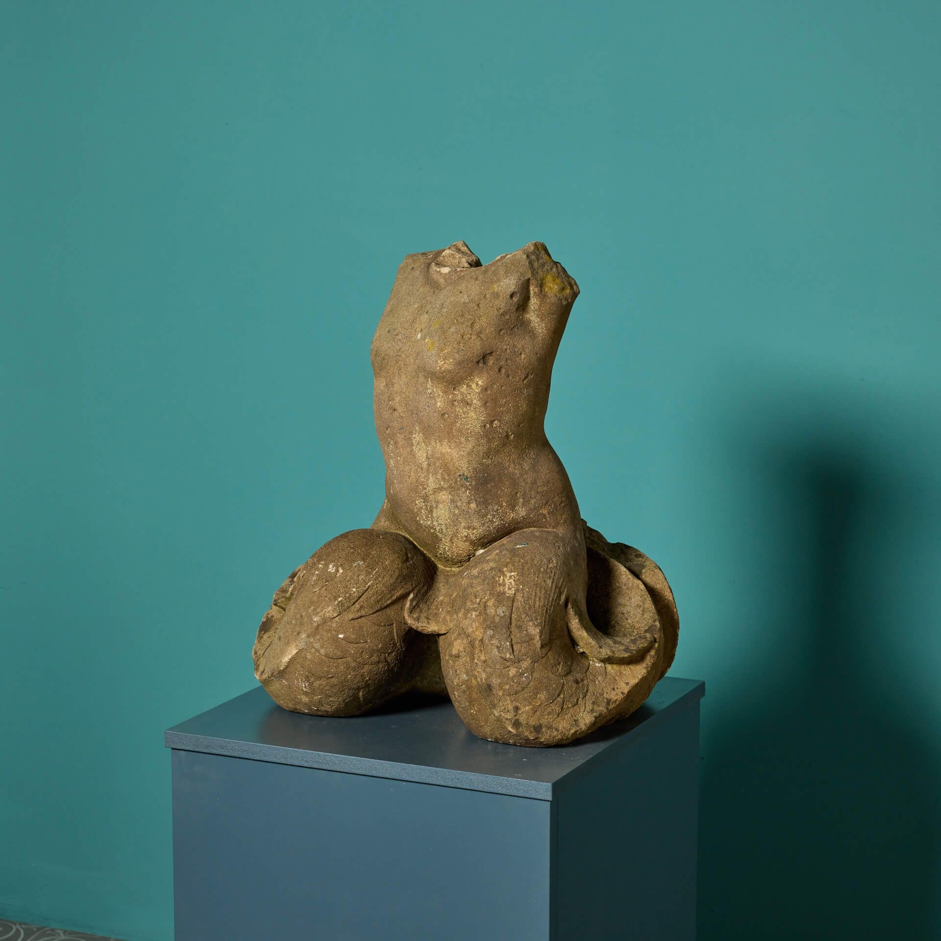 back to topAn antique carved York stone statue in the form of Triton. This mid 19th century English piece now stands as a hand carved torso, which was once part of a fountain. It could be used in an array of different ways for exterior or interior use, such as a garden water feature, lamp, or statue.