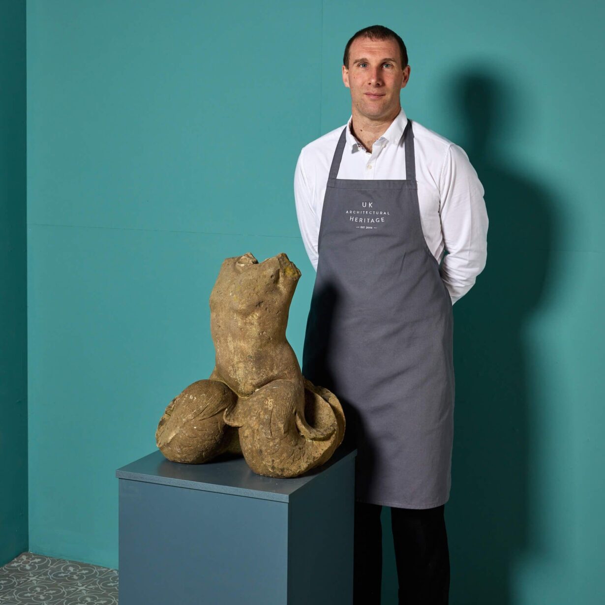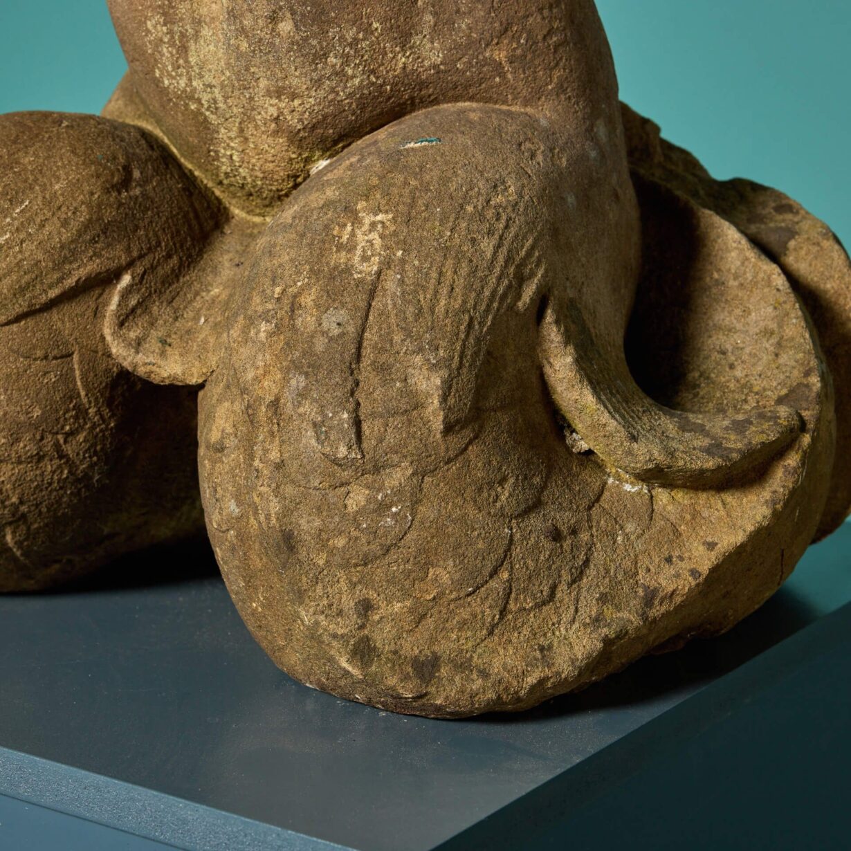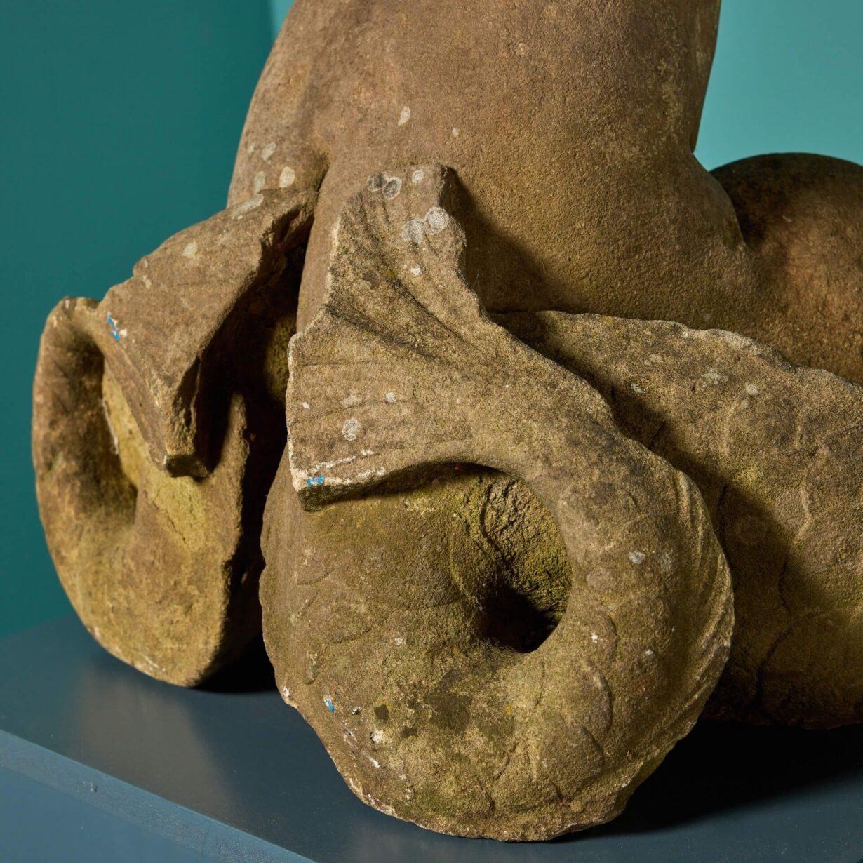 back to topAn antique carved York stone statue in the form of Triton. This mid 19th century English piece now stands as a hand carved torso, which was once part of a fountain. It could be used in an array of different ways for exterior or interior use, such as a garden water feature, lamp, or statue.