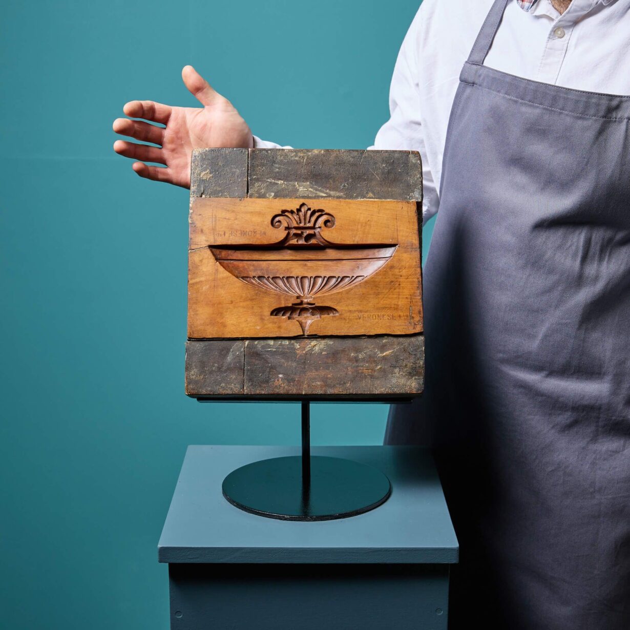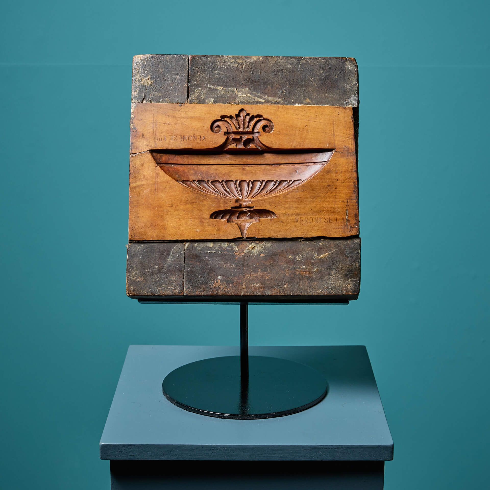 This mould features a beautiful urn design, carved deeply into the wood. This results in a highly ornate and precise compo embellishment that appears as though it has been carved rather than cast. The wooden mould comes with an accompanying custom-made steel display stand.