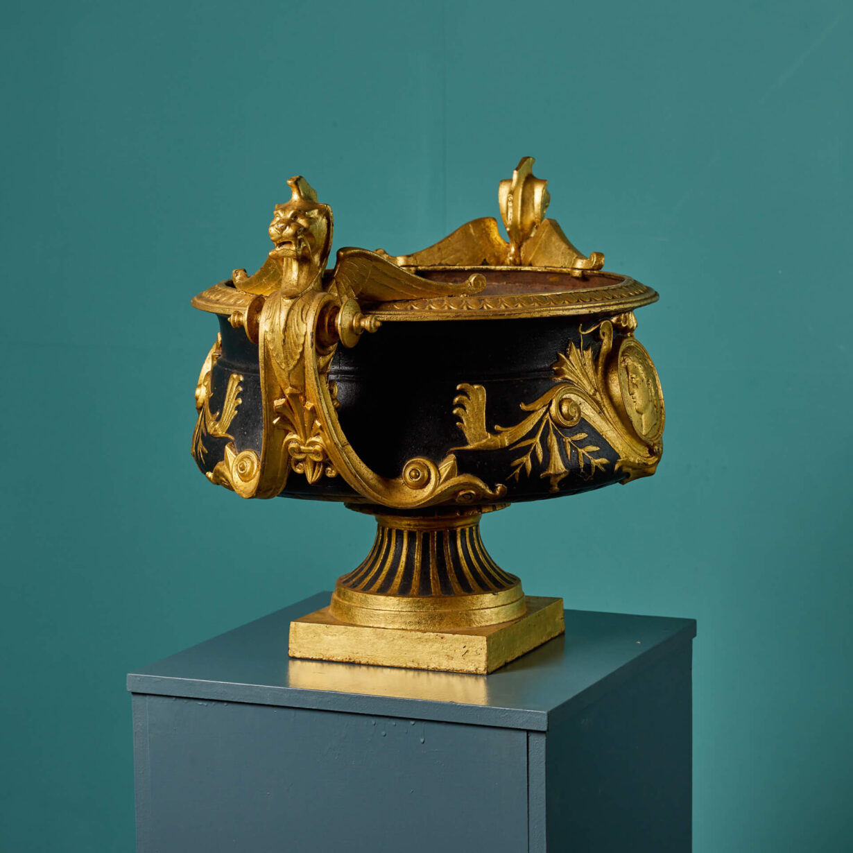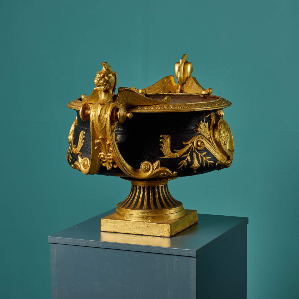 back to topA striking antique cast iron centrepiece urn dating from the late 19th century. Originating from France, this 150-year-old, gilded urn is a showstopping piece with its bold black paint and gold colour contrasts. The design brings a sense of grandeur to any setting, detailed with masks among foliage and scrolls to both the front and the back and a pair of handles with stylised winged lion heads. This French urn makes an impressive display piece, the vibrant colours certain to draw any eye.