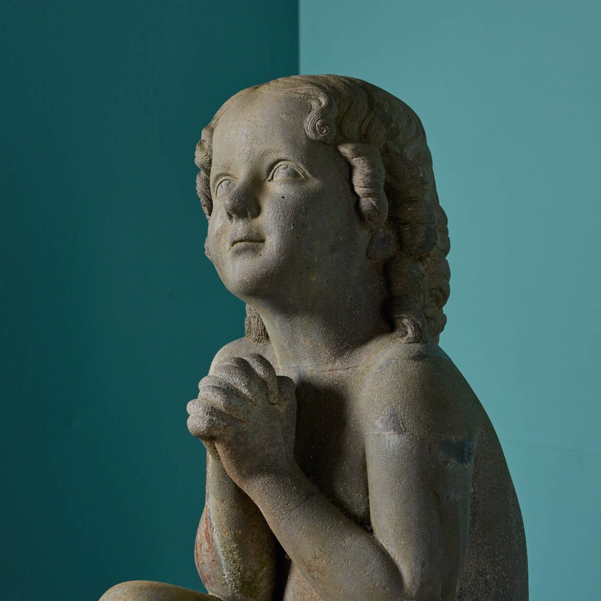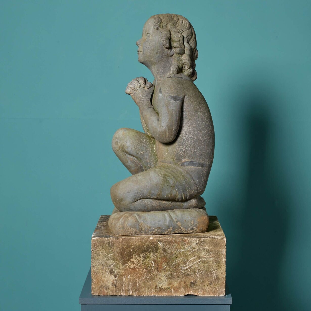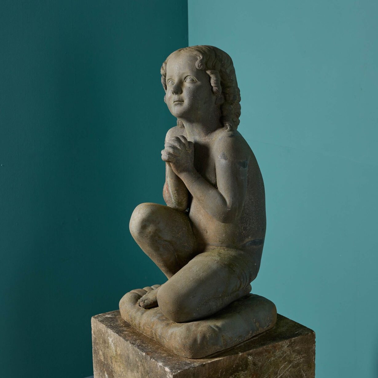 Made in several sections then leaded together, this statue depicts a child with locks of curling hair kneeling on a cushion with hands together and raised as if praying. The cast is further elevated by a weathered stone base. Over 150 years old, the entire piece has an attractive timeworn look, telling the story of its age and history.