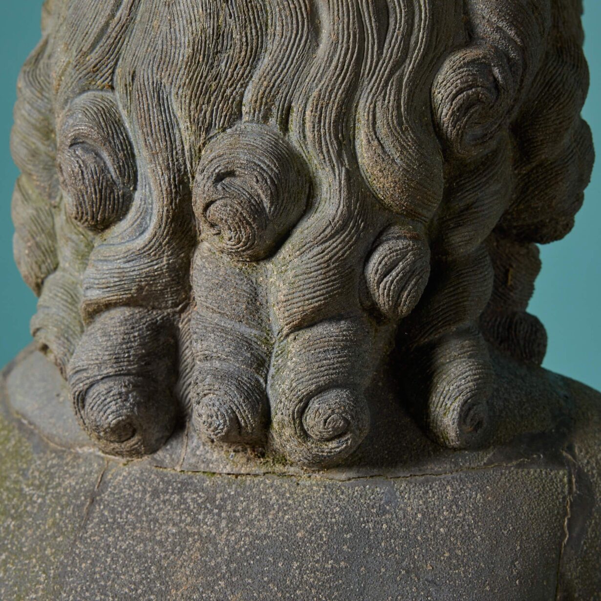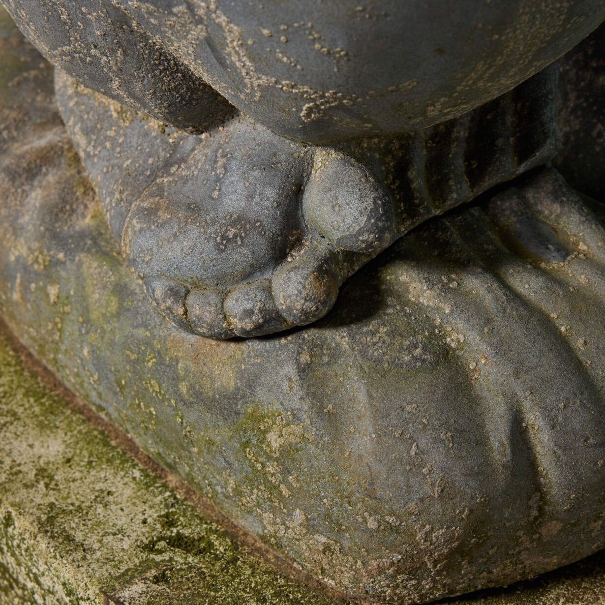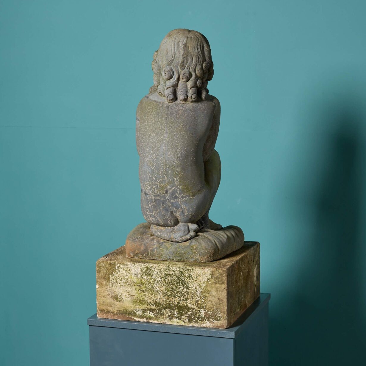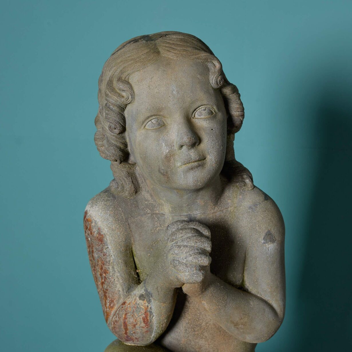 Made in several sections then leaded together, this statue depicts a child with locks of curling hair kneeling on a cushion with hands together and raised as if praying. The cast is further elevated by a weathered stone base. Over 150 years old, the entire piece has an attractive timeworn look, telling the story of its age and history.