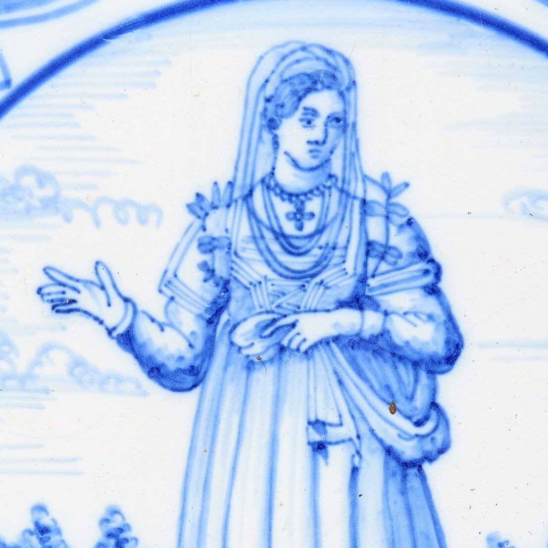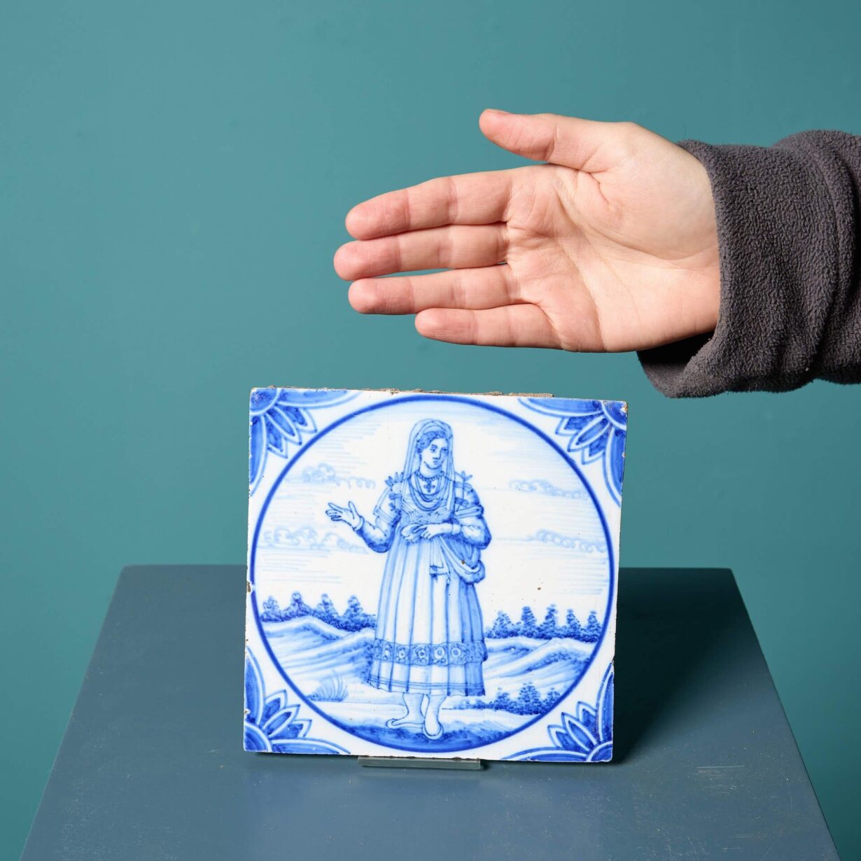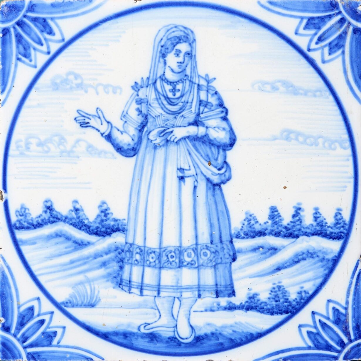 back to topAn antique Delft tile of a woman in Turkish dress, circa 1870, by Ravesteijn of Utrecht, after the original drawing by Nicolas De Nicolay dating to circa 1551.