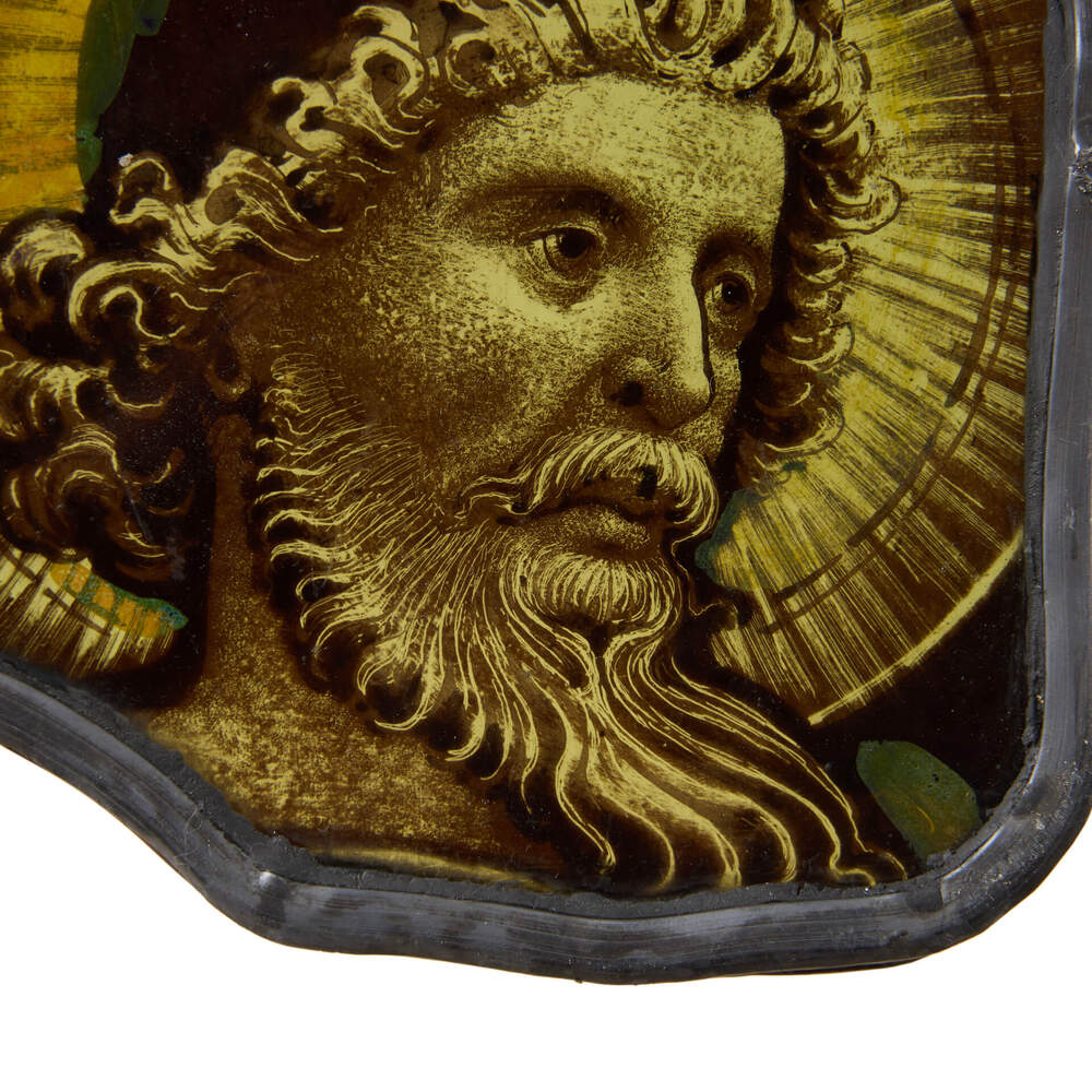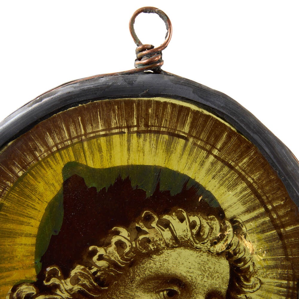 back to topA small antique painted and stained glass window hanging of a saintly figure in a green cap before a halo, dating to circa 1850.