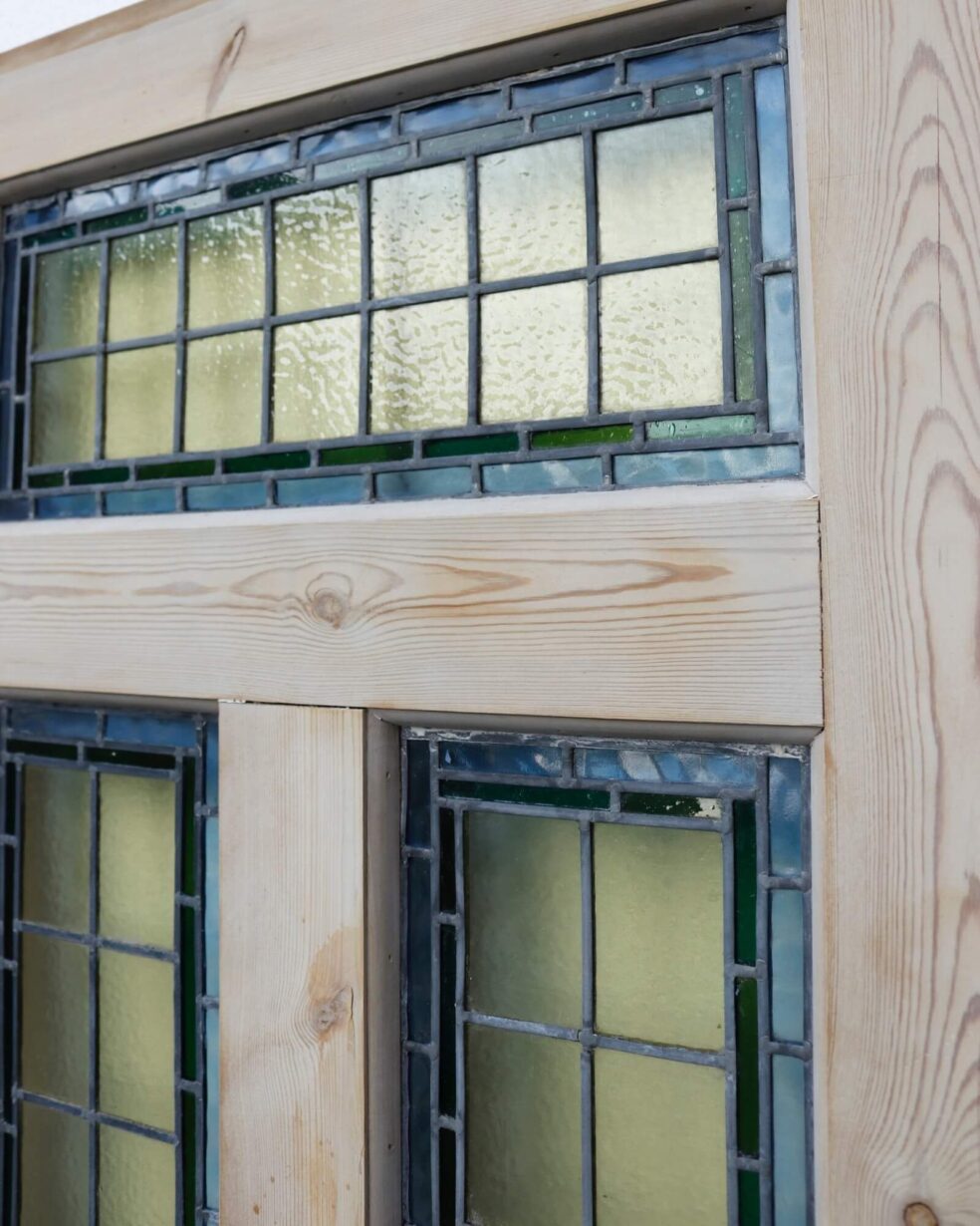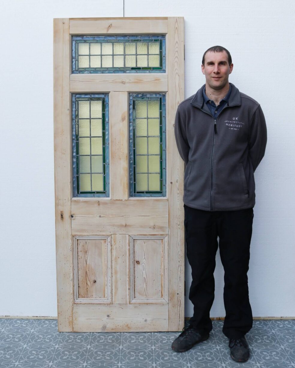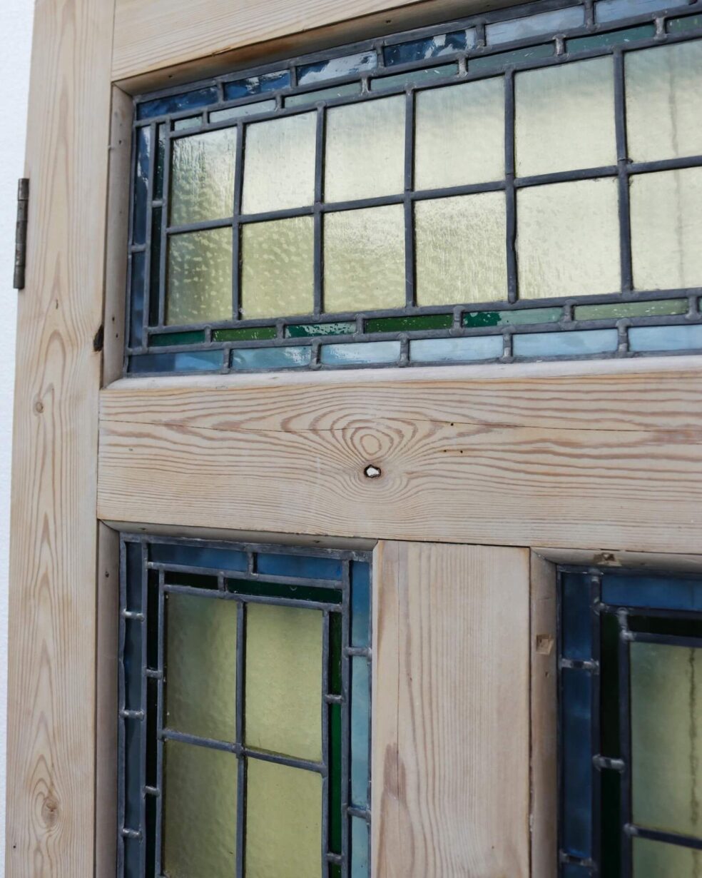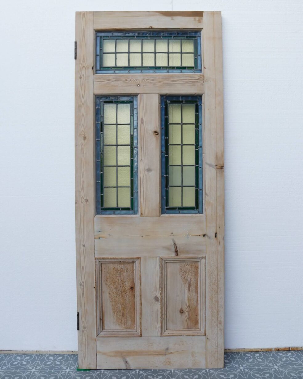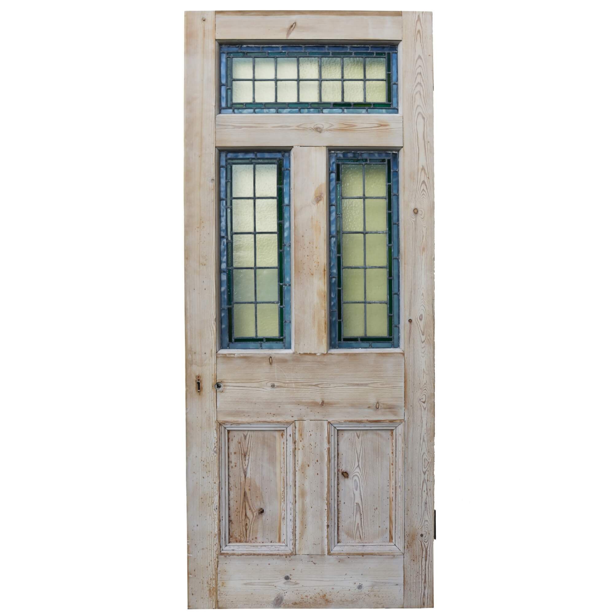 back to topAn antique stained glass front door or internal door, perfect for the entrance to a traditional Edwardian era property or Victorian townhouse. Made in pine, this reclaimed door features three intricate leaded glass panels with yellow stained glass outlined with green and blue for a simple yet timeless look. The pine is stripped and sanded, ready for custom finishing in a desired paint, stain or wax.