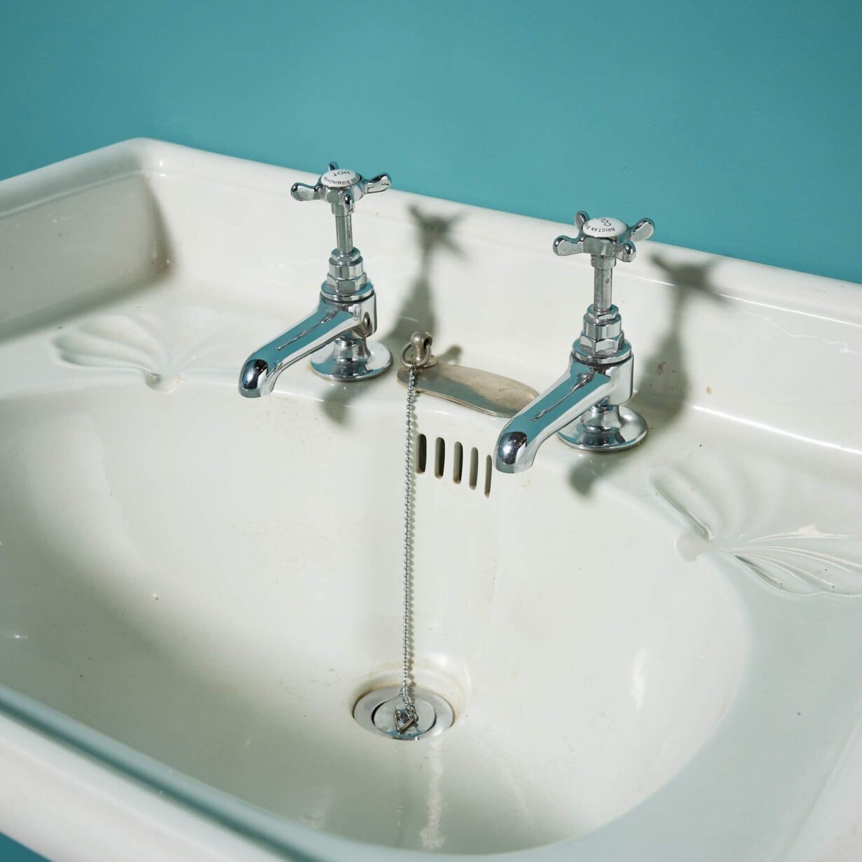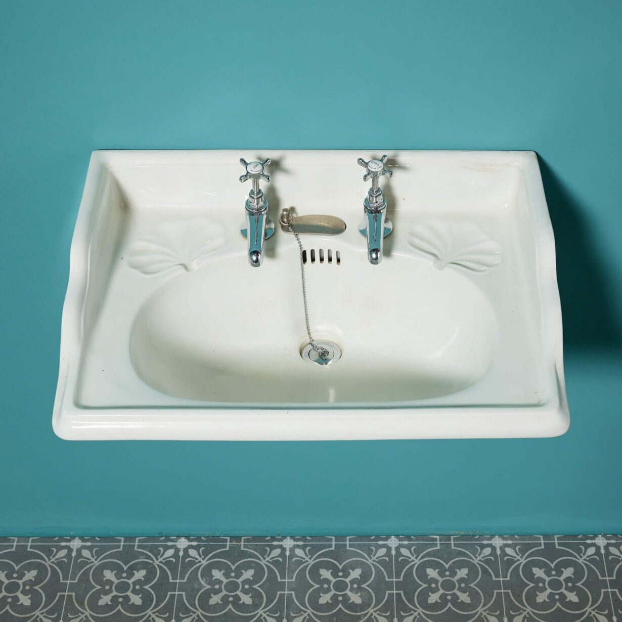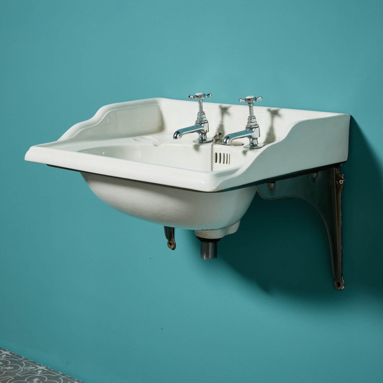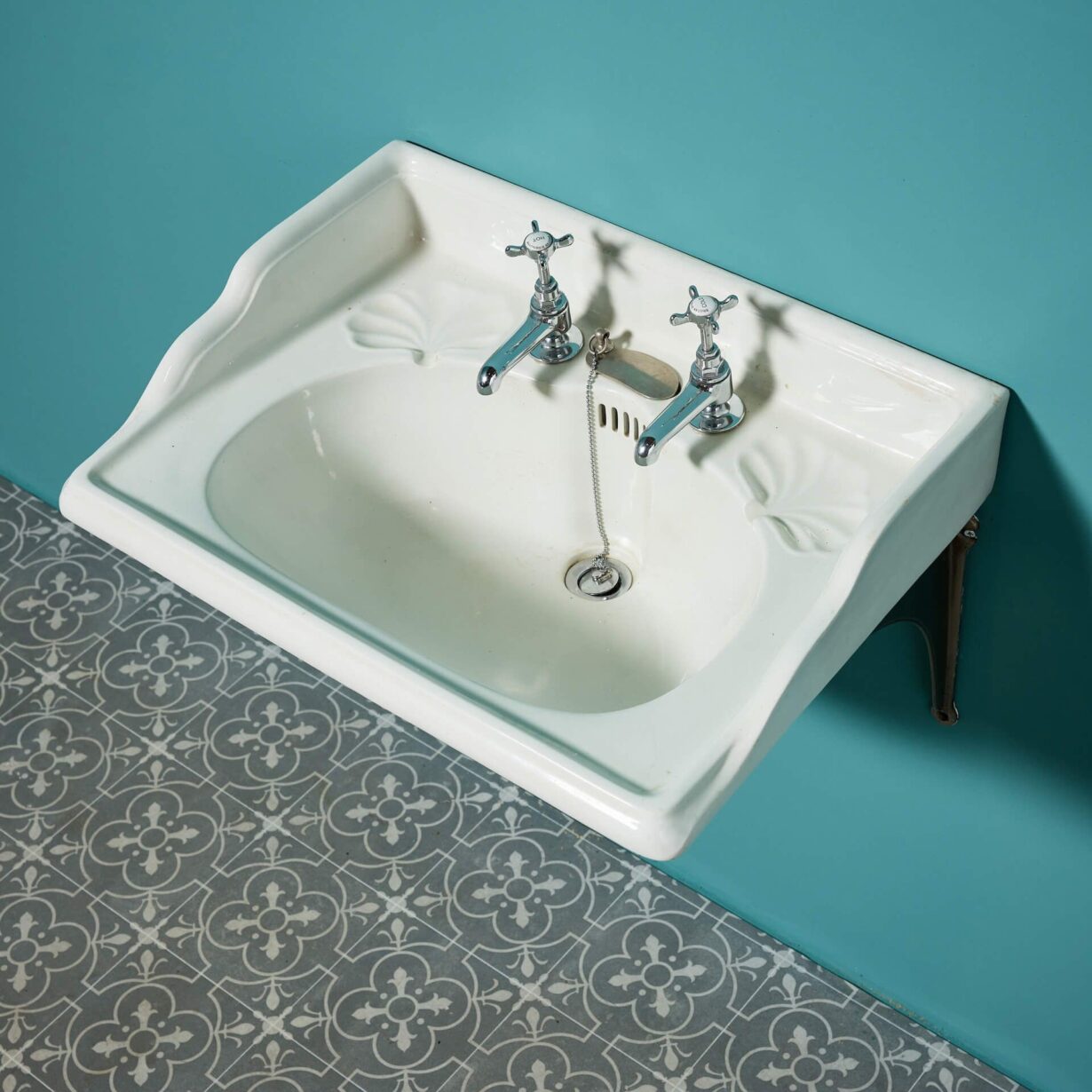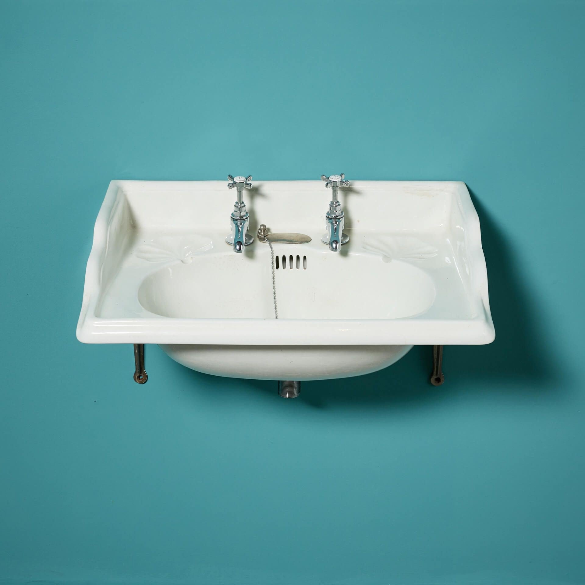 back to topA classic early 20th century antique Edwardian style ceramic sink with modern, traditional style taps and silvered cast iron bracket for affixing to a wall. This reclaimed basin will make an elegant sink in a vintage-inspired bathroom as well as a period ensuite or cloakroom, complete with beautiful leaf-shaped soap dishes.