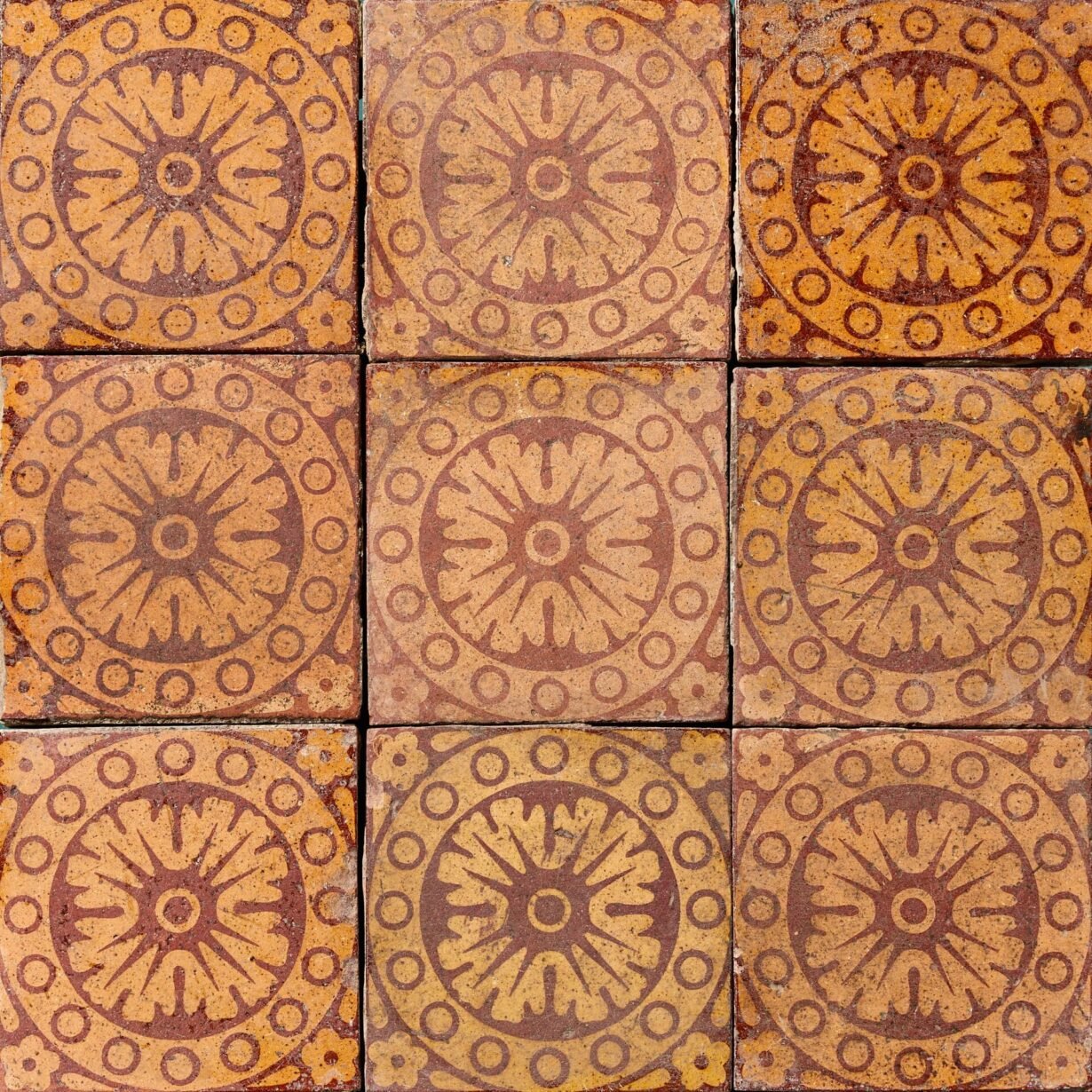 back to topThese mid 19th century antique encaustic tiles were reclaimed from a local Herefordshire church. We have around 125 tiles in the same design available, available for purchase in panels of 9 as pictured. Please enquire for more details.