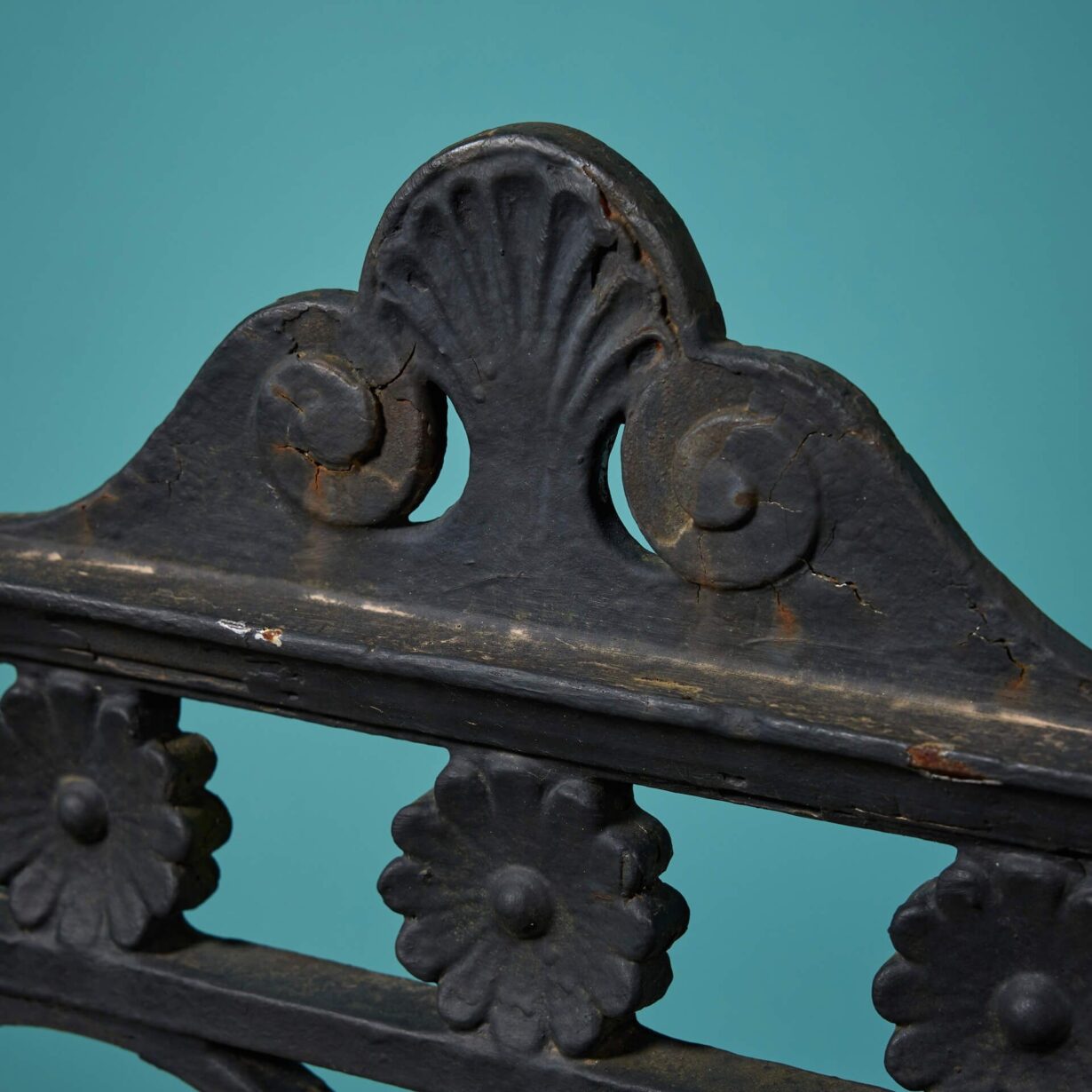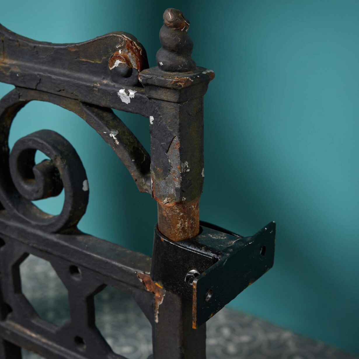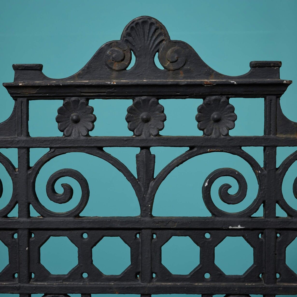 back to topAn ornate antique English cast iron garden gate with an old black paint finish.