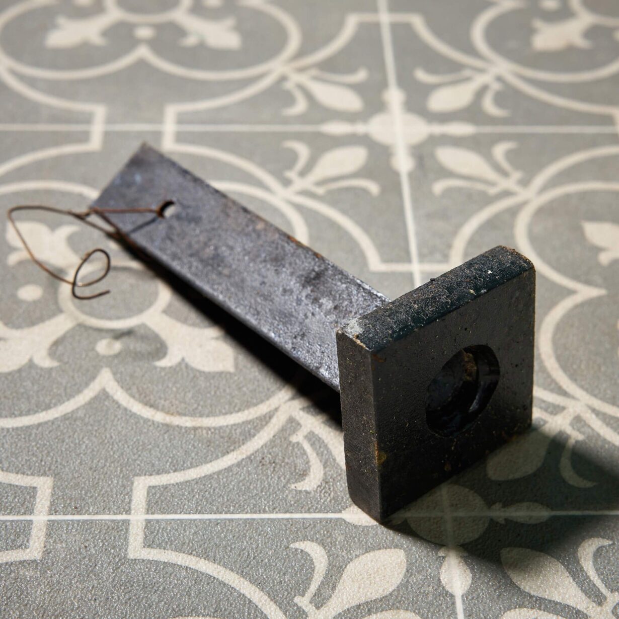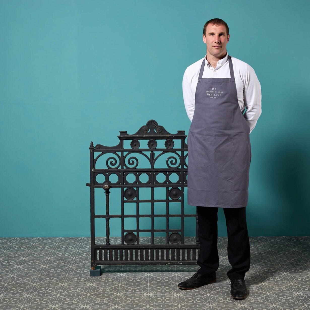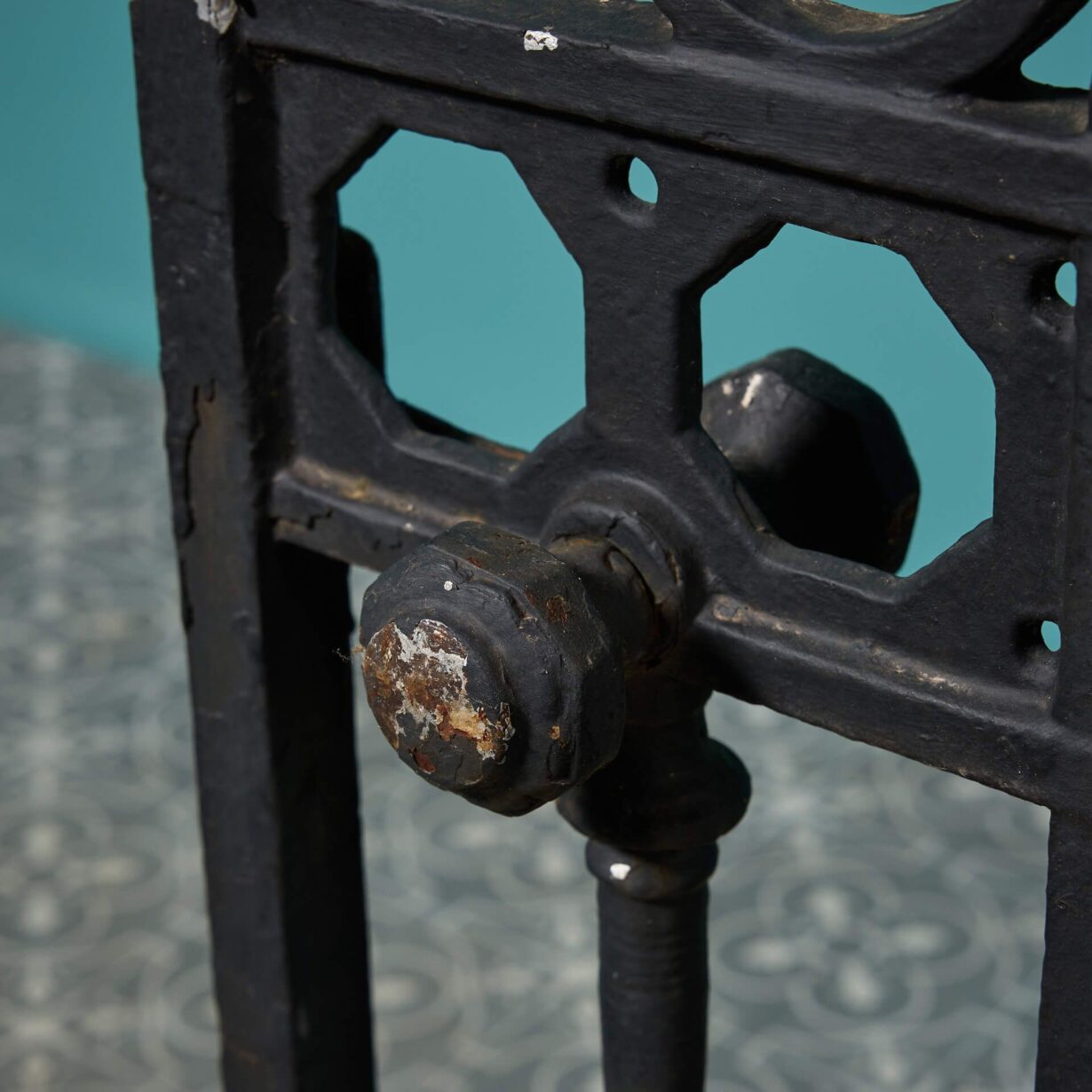 back to topAn ornate antique English cast iron garden gate with an old black paint finish.