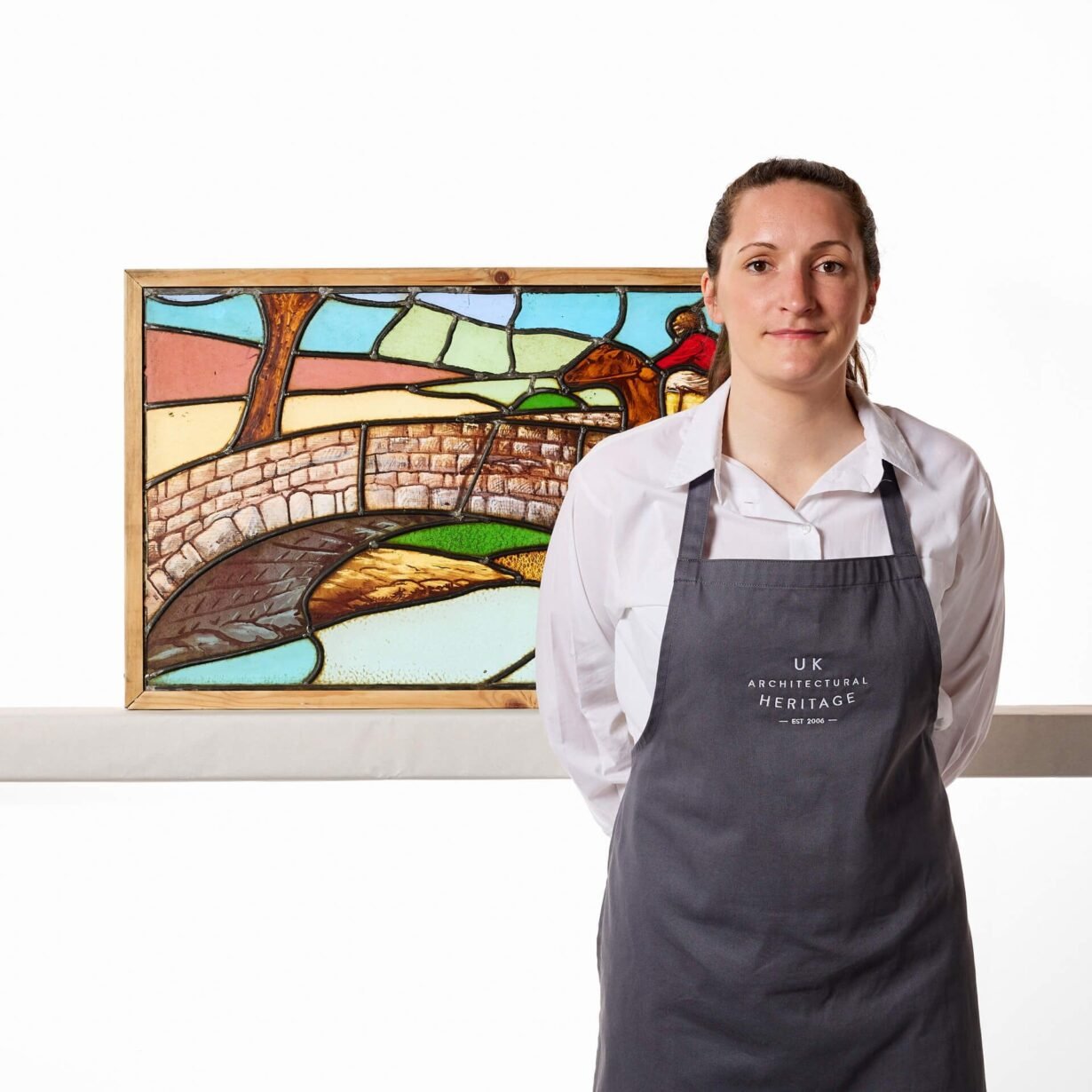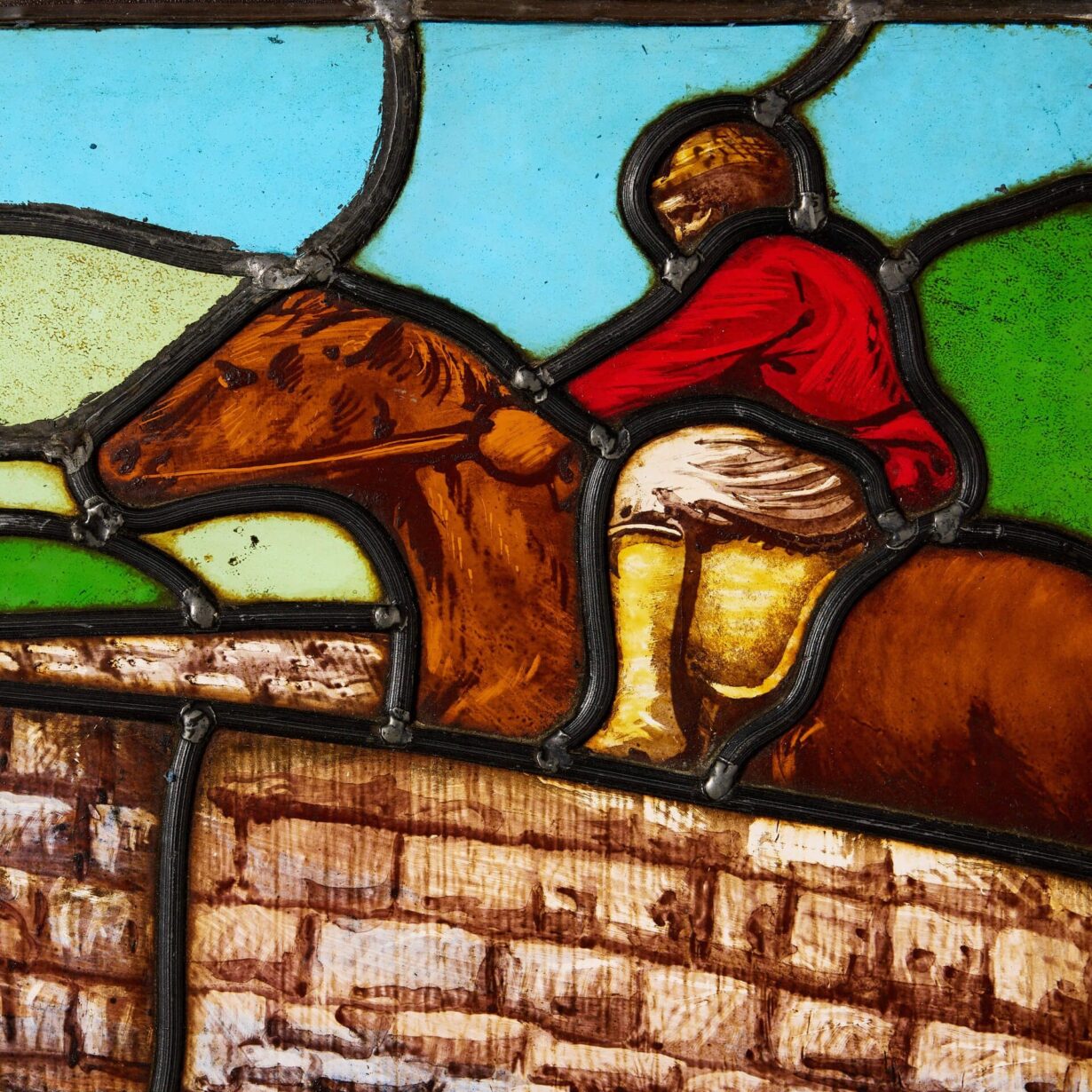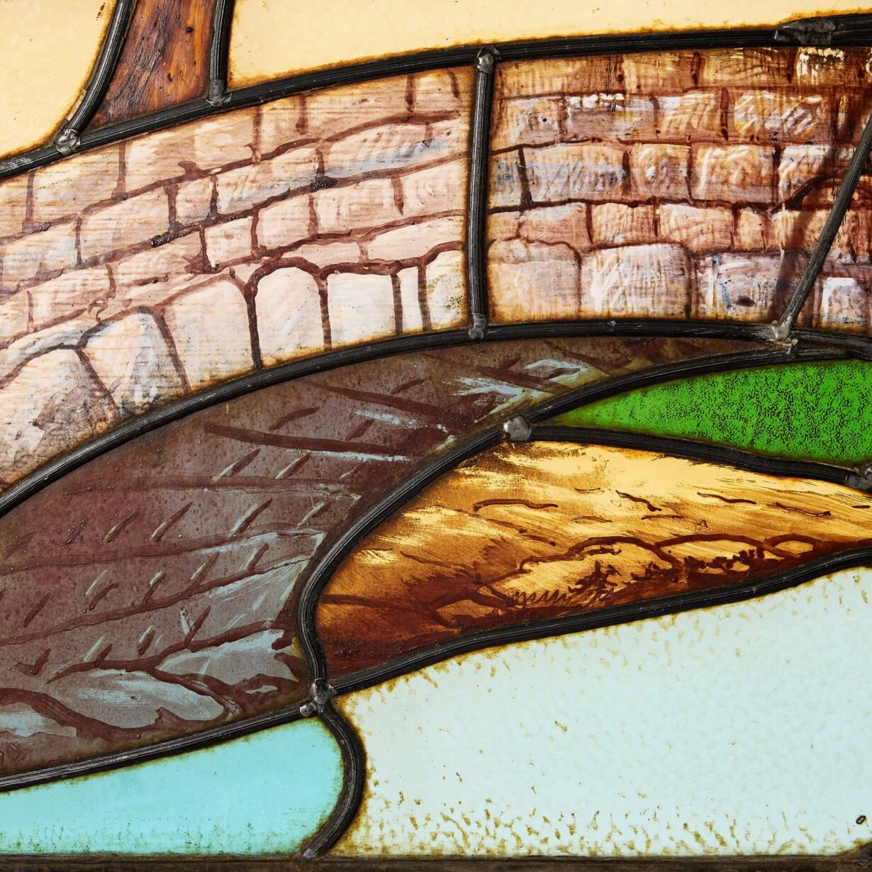 back to topA vibrant and colourful antique stained glass window depicting a horse and rider passing over a cobblestone bridge; one of a series of early 20th century stained glass panels we are selling depicting scenes in the English countryside.