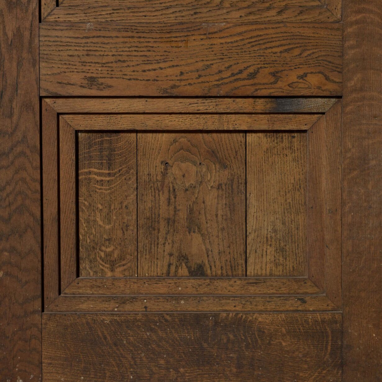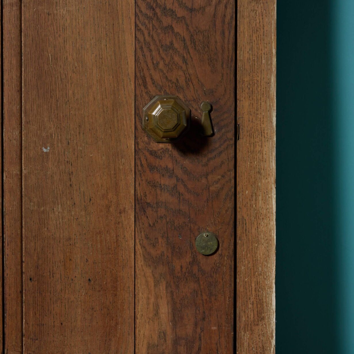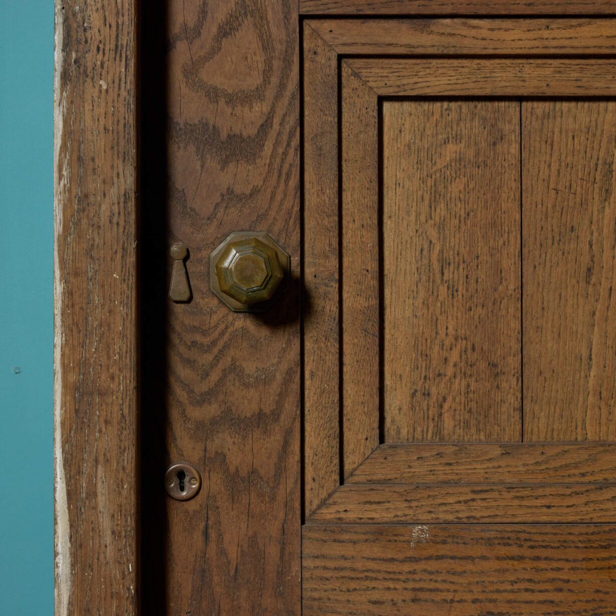 It is unweathered, having previously been situated in a sheltered location, and as such has a handsome oak colour to both sides that showcases the natural woodgrain. Below its sweeping arch is a tiny unglazed window, serving as a peephole, that only adds to this door’s unique character.