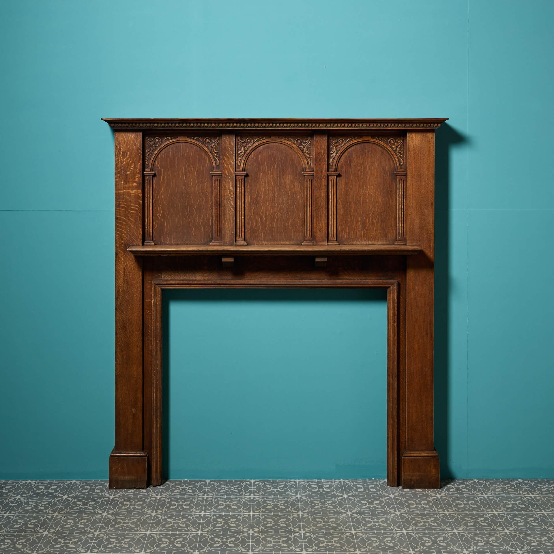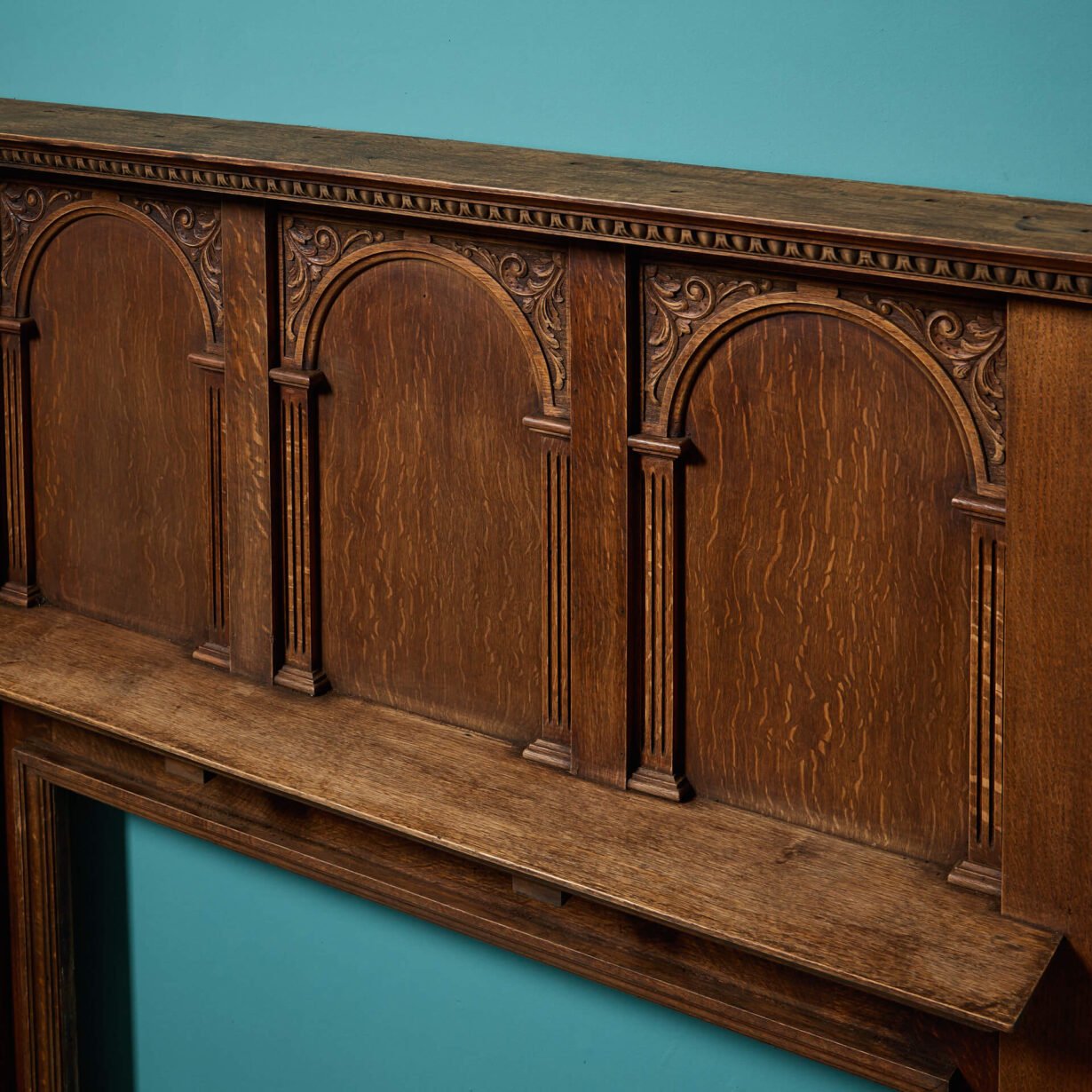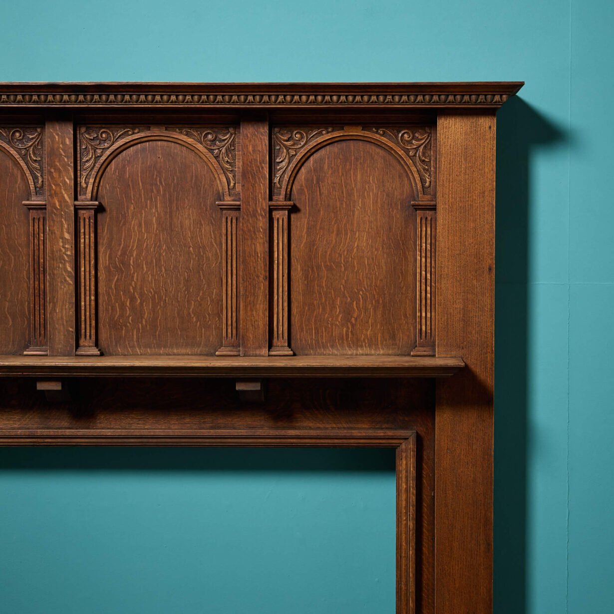 Above the mantle, a triptych of arched panels are recessed into the wood, seemingly ready to be dressed with house crests or heraldry. Each arch has delicately carved pilasters and sopraporta on each. Left blank, the lighter finish lends itself to more than just period properties.