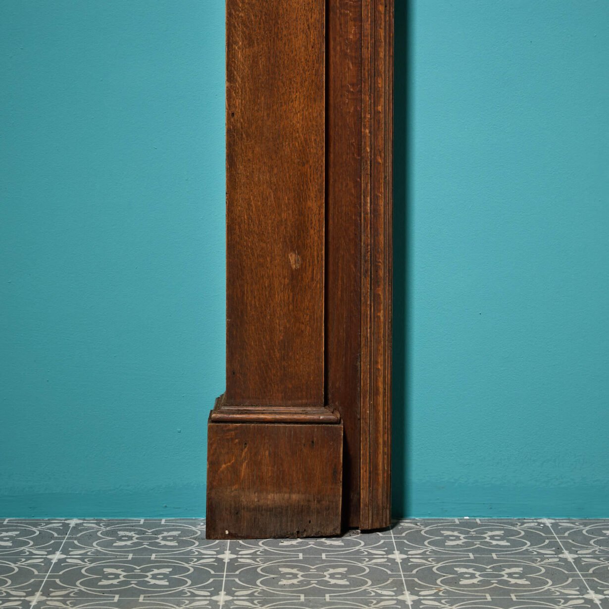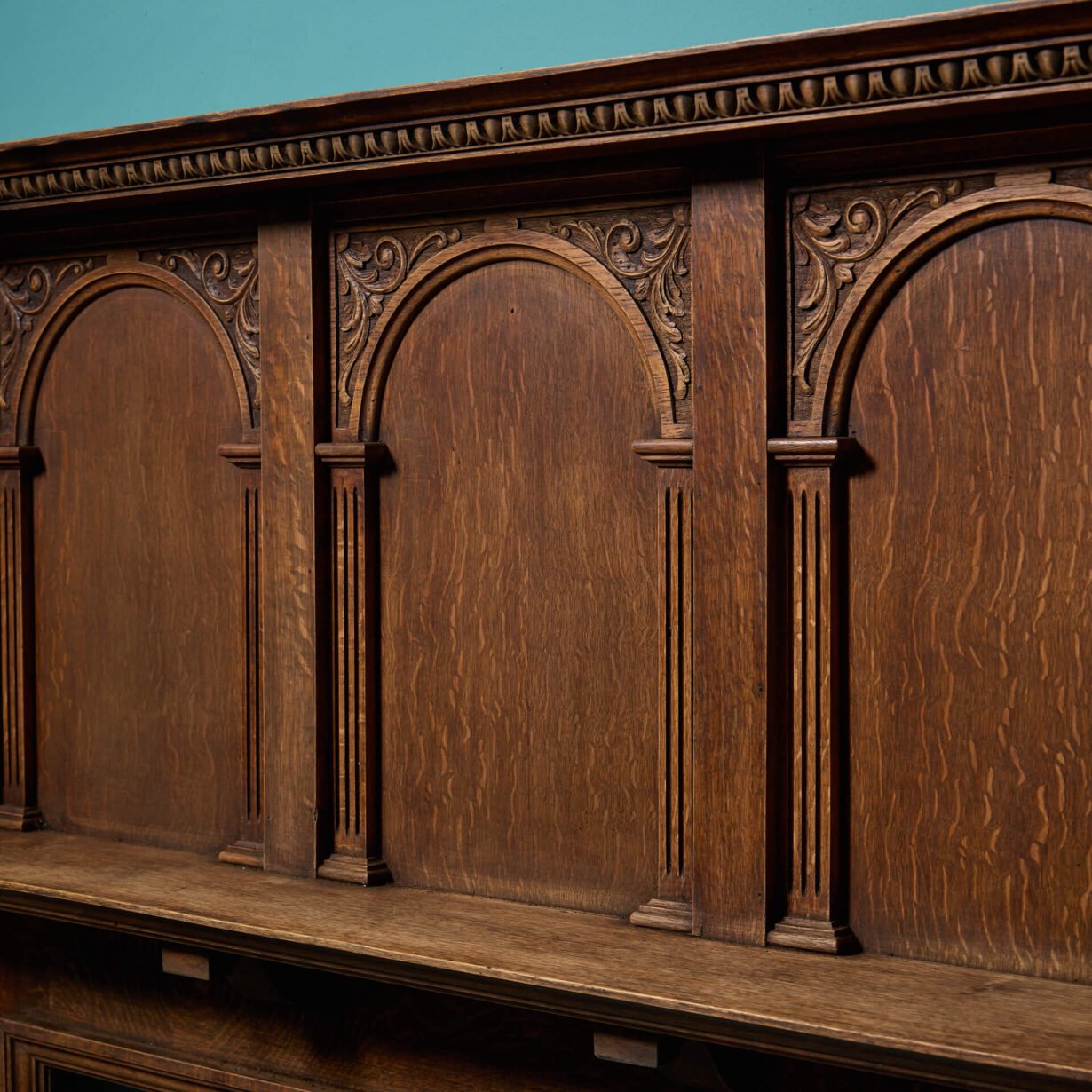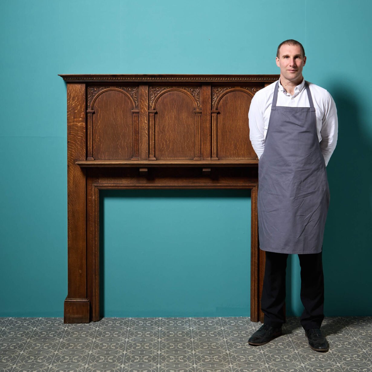 Above the mantle, a triptych of arched panels are recessed into the wood, seemingly ready to be dressed with house crests or heraldry. Each arch has delicately carved pilasters and sopraporta on each. Left blank, the lighter finish lends itself to more than just period properties.