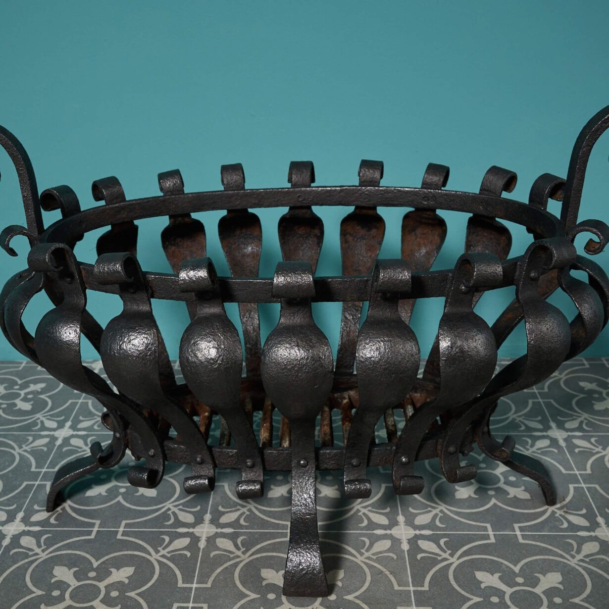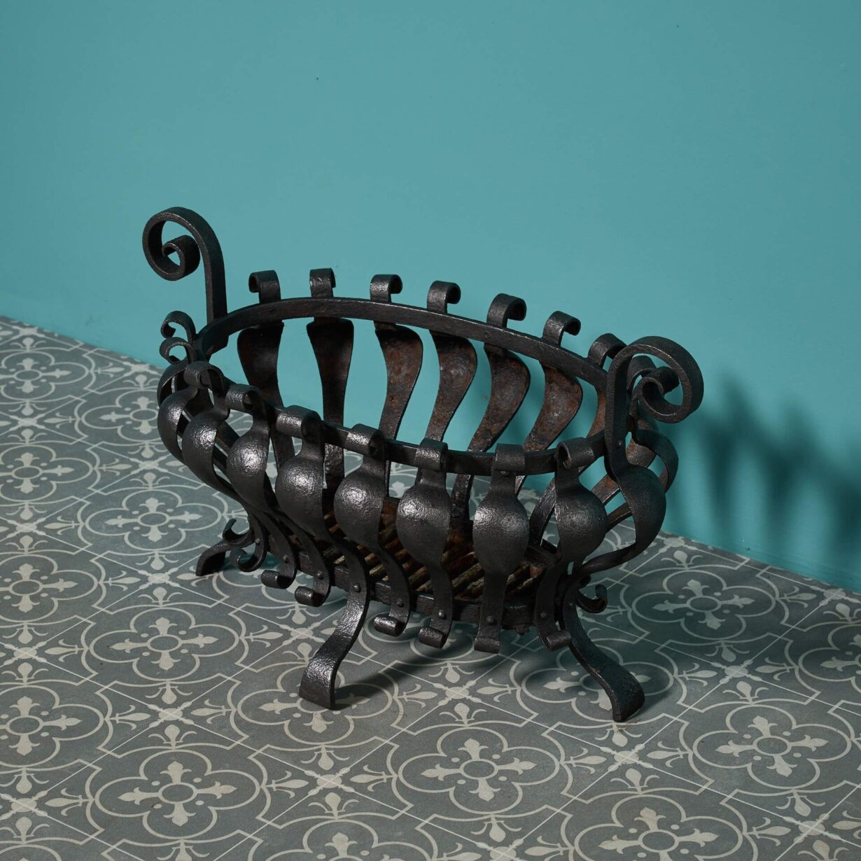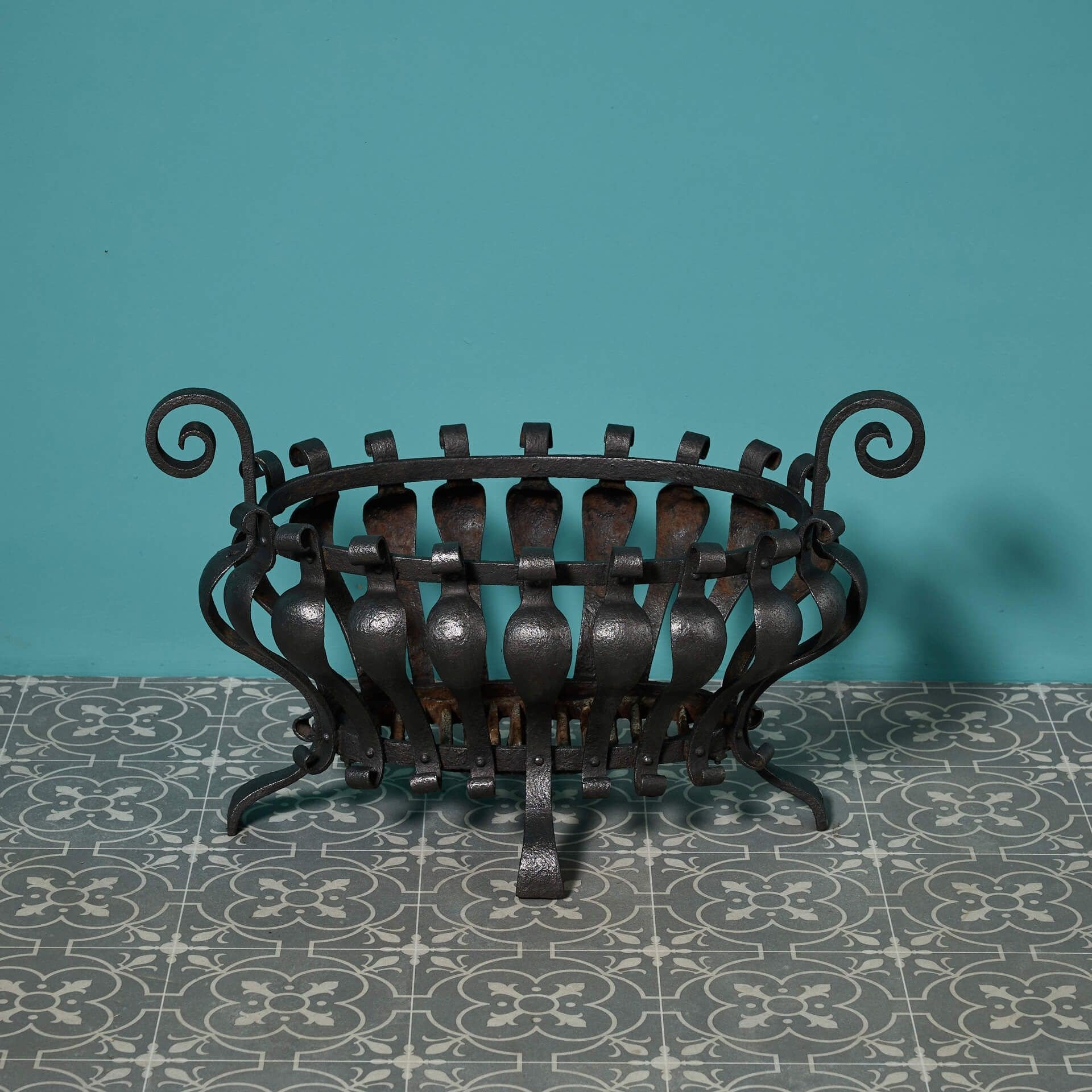 back to topA beautiful antique English oval scrolling fire basket, circa 1880. Crafted at the hand of a talented 19th century blacksmith, this wrought iron fire grate is a character addition to any fireplace with its bulbous form and timeless scrolls.