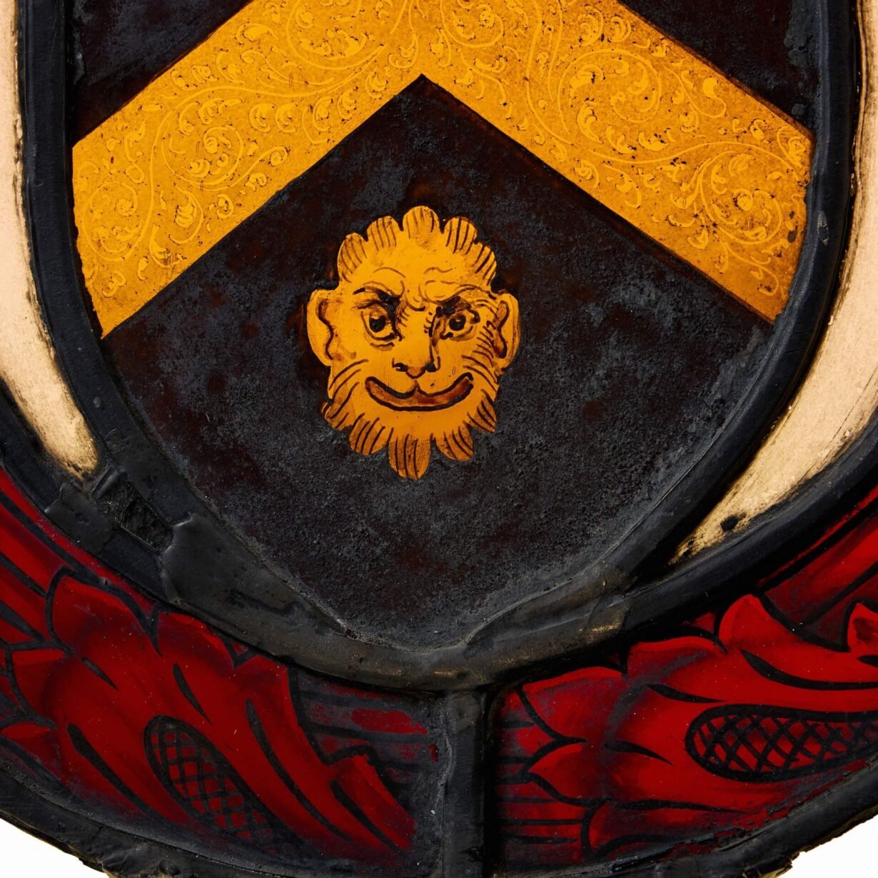 The layout is reminiscent of the House Wentworth of Elmsall, a coat of arms that dates back to 1066. The shield is a dark finish with a yellow chevron with floral patterns between three leopards. A lighter glass separates the shield from a red floral outer border.