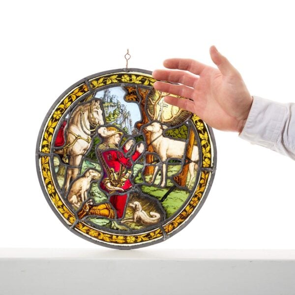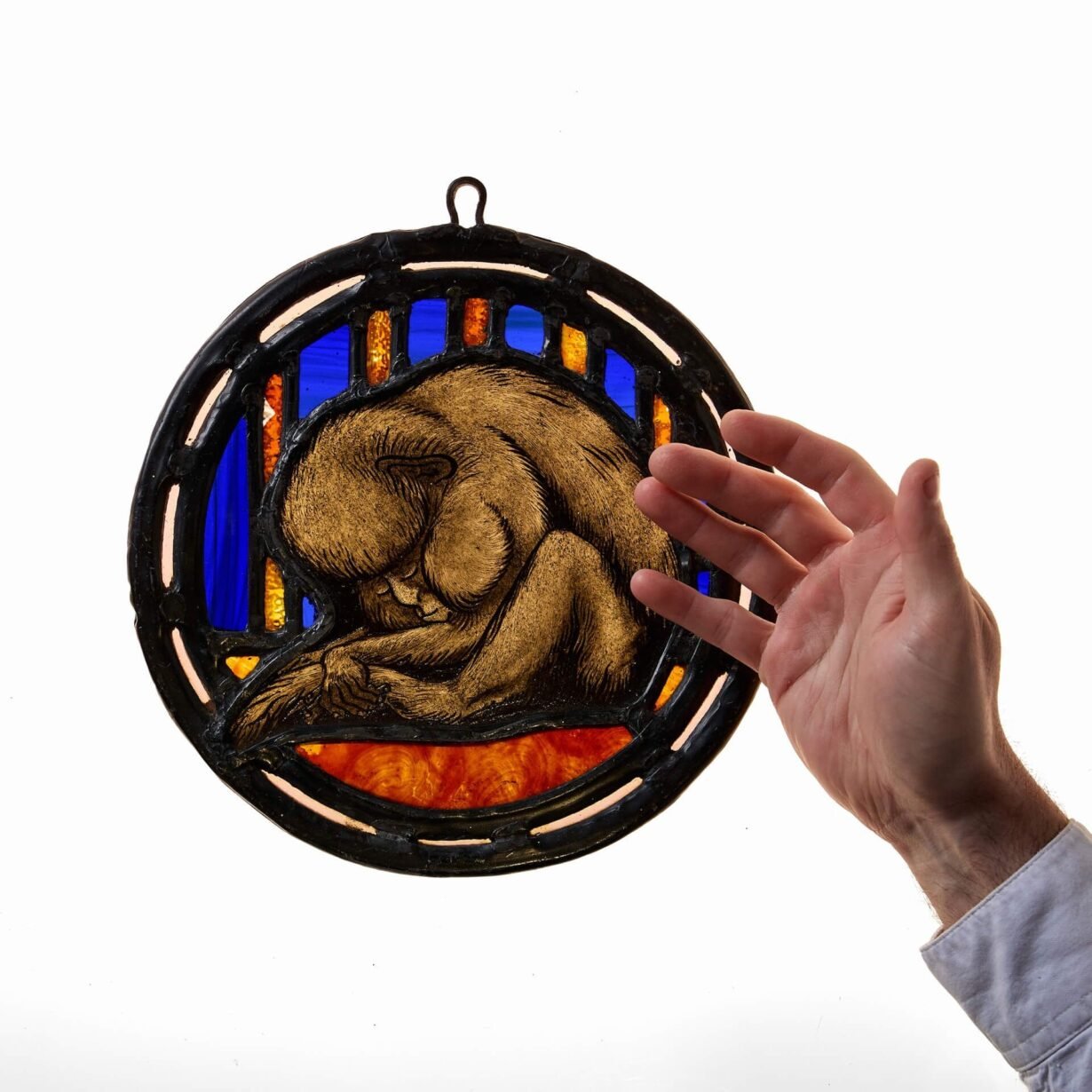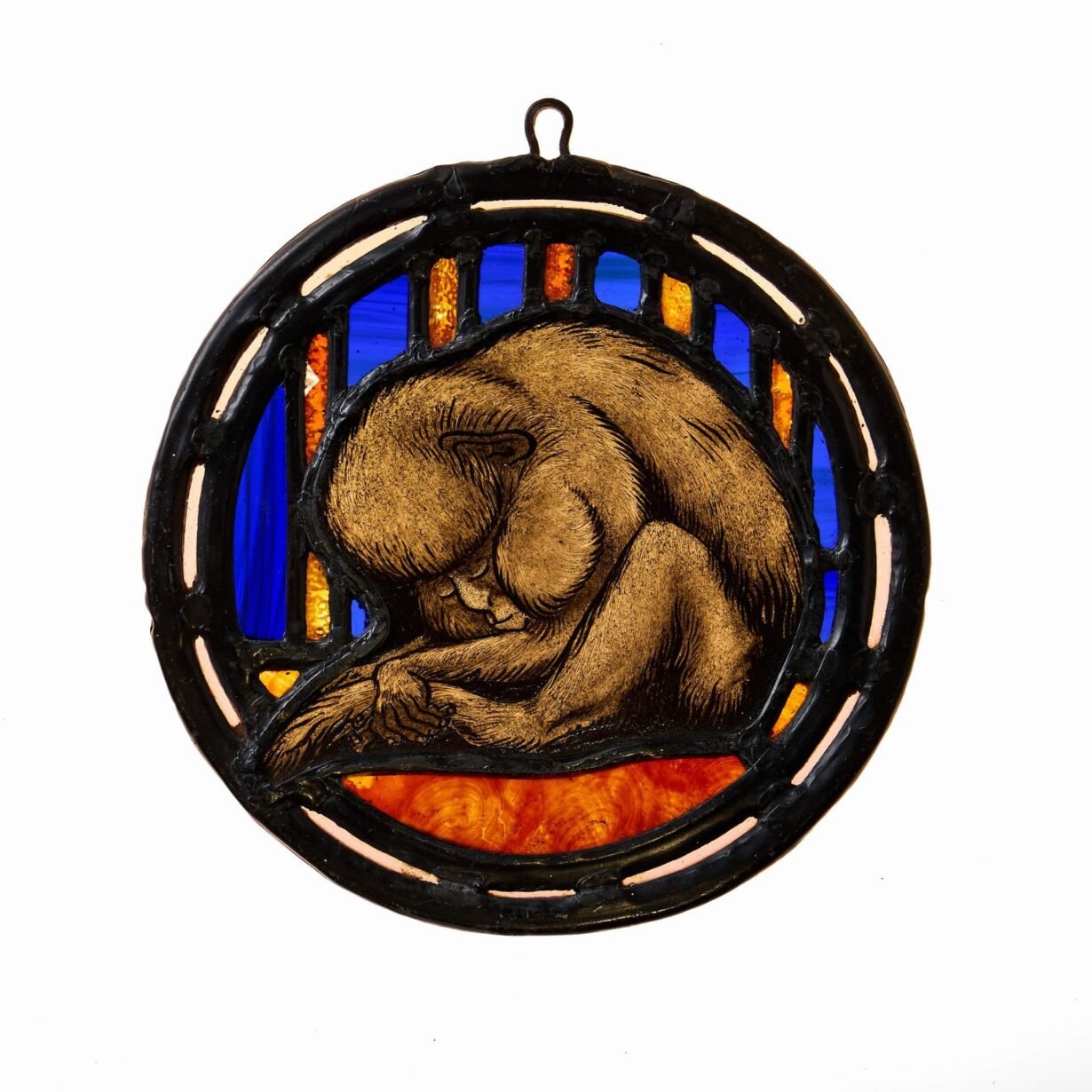 back to topAn antique English stained glass roundel depicting a sleeping monkey. This highly unusual piece is presented on blue and orange glass, set in a very thick lead.