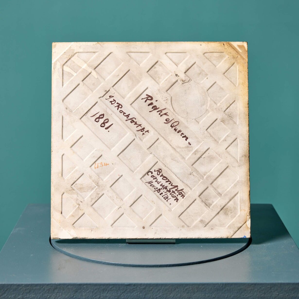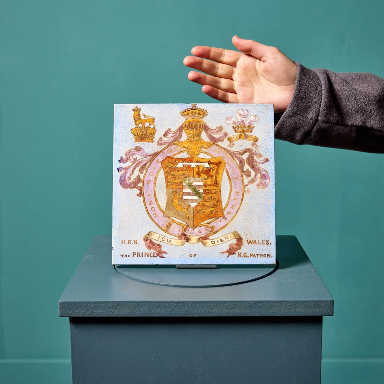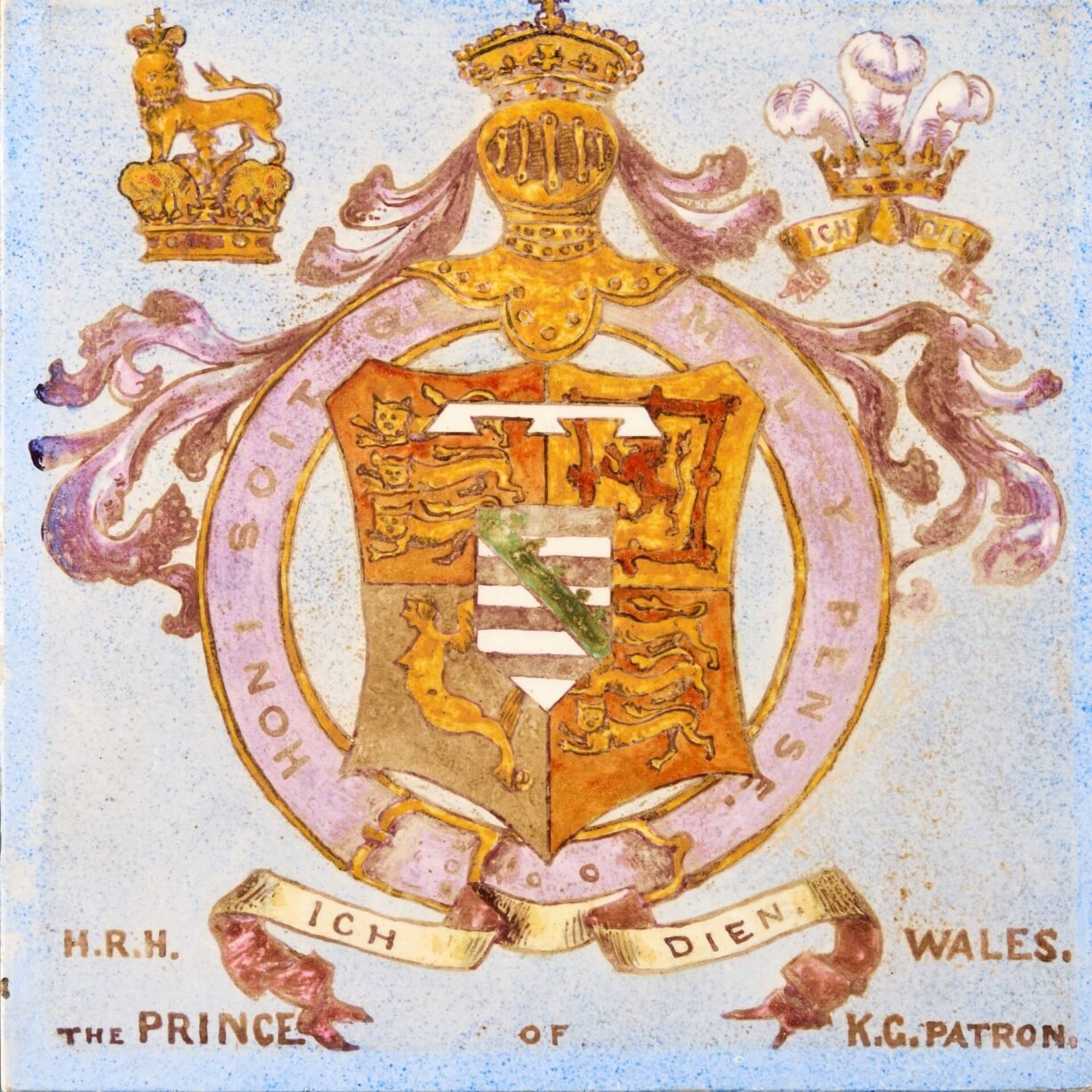 back to topA hand decorated antique English heraldic tile depicting the coat of arms of Albert Edward, Prince of Wales (later Edward VII), dating from 1881. This porcelain tile is one of 14 similar we are selling, removed from the now demolished library of the Victorian Brompton Consumption Hospital, London. It is dated and signed J. D. Rochfort to the reverse.