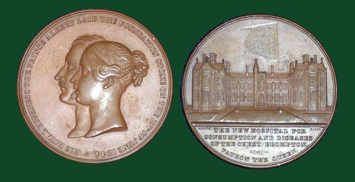 Queen Victoria, ‘The Patron’, ruled Great Britain and Ireland from 1837 – 1901. Brompton Consumption Hospital was founded in 1841 and built throughout the 1840s. An illustration (pictured) from the Royal Collection shows how the exterior of hospital looked circa 1845. A commemorative medallion from June 1844 (pictured) marking the establishment of the hospital states that the foundation stone was laid by Queen Victoria’s husband, Prince Albert.