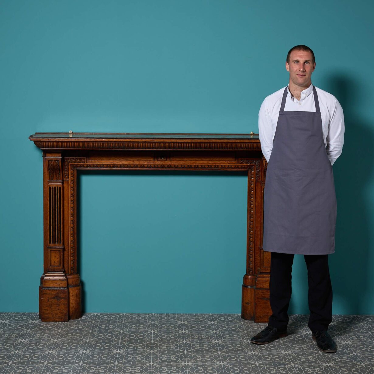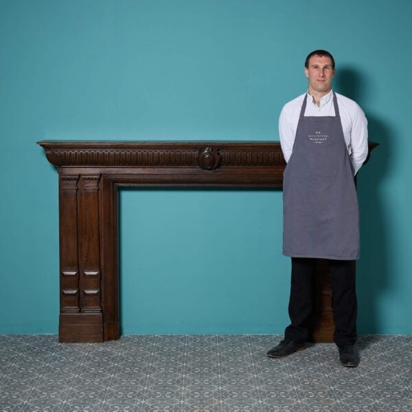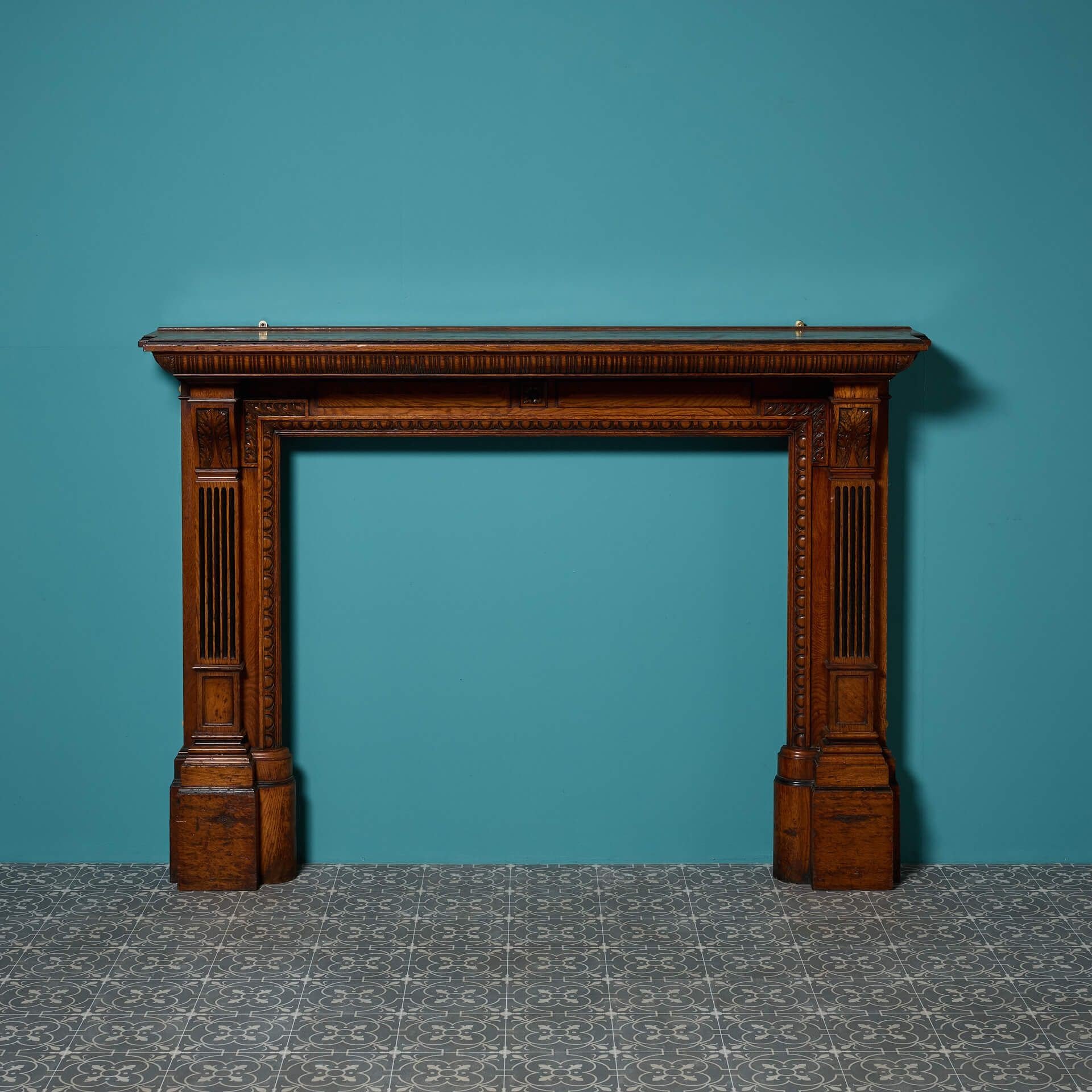back to topAn antique English Victorian oak fire surround presented in its original finish. This large, commanding piece is carved from high-quality cuts of oak, with exceptional woodgrain showing throughout.
