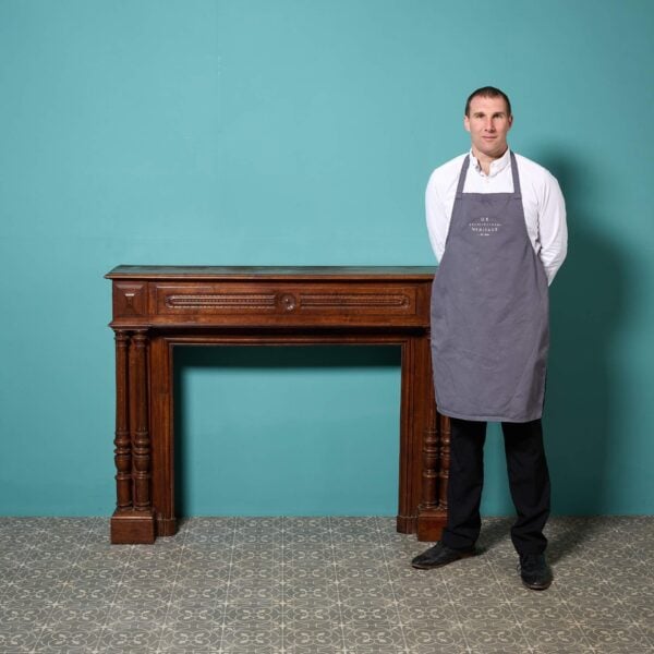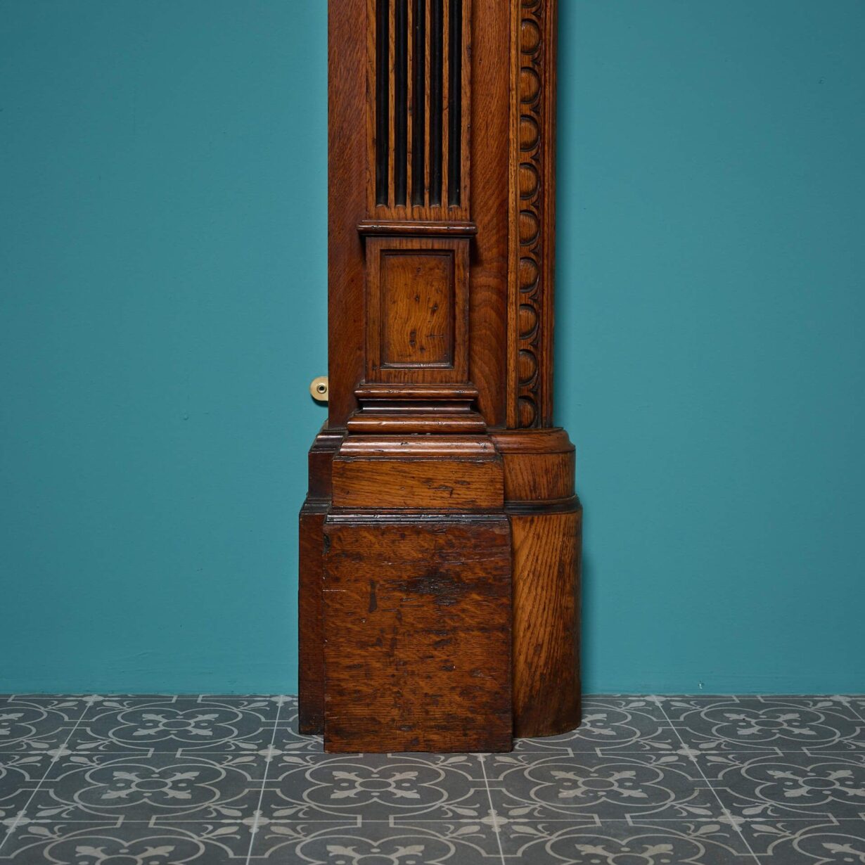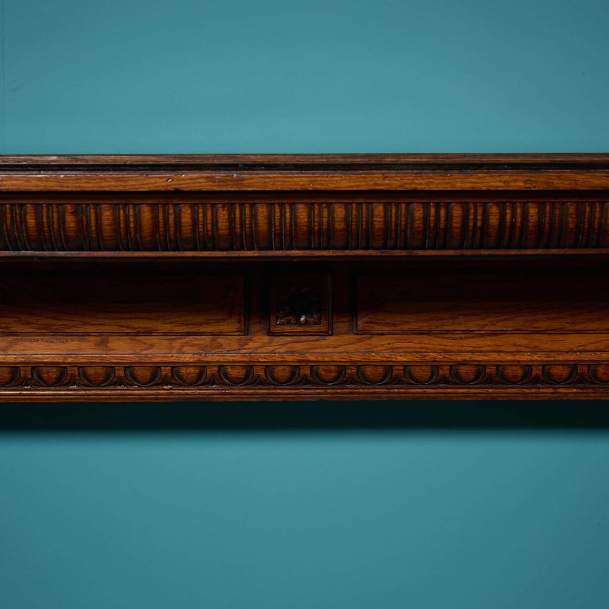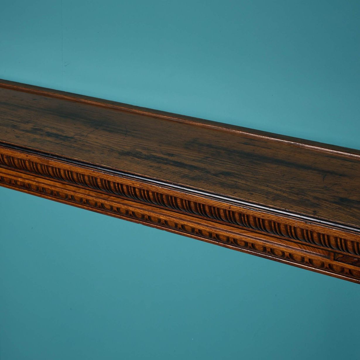 back to topAn antique English Victorian oak fire surround presented in its original finish. This large, commanding piece is carved from high-quality cuts of oak, with exceptional woodgrain showing throughout.