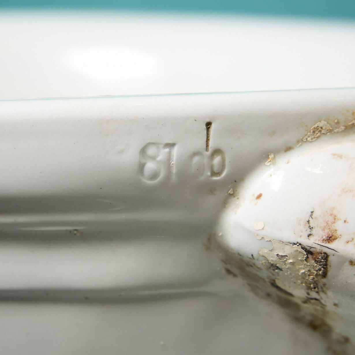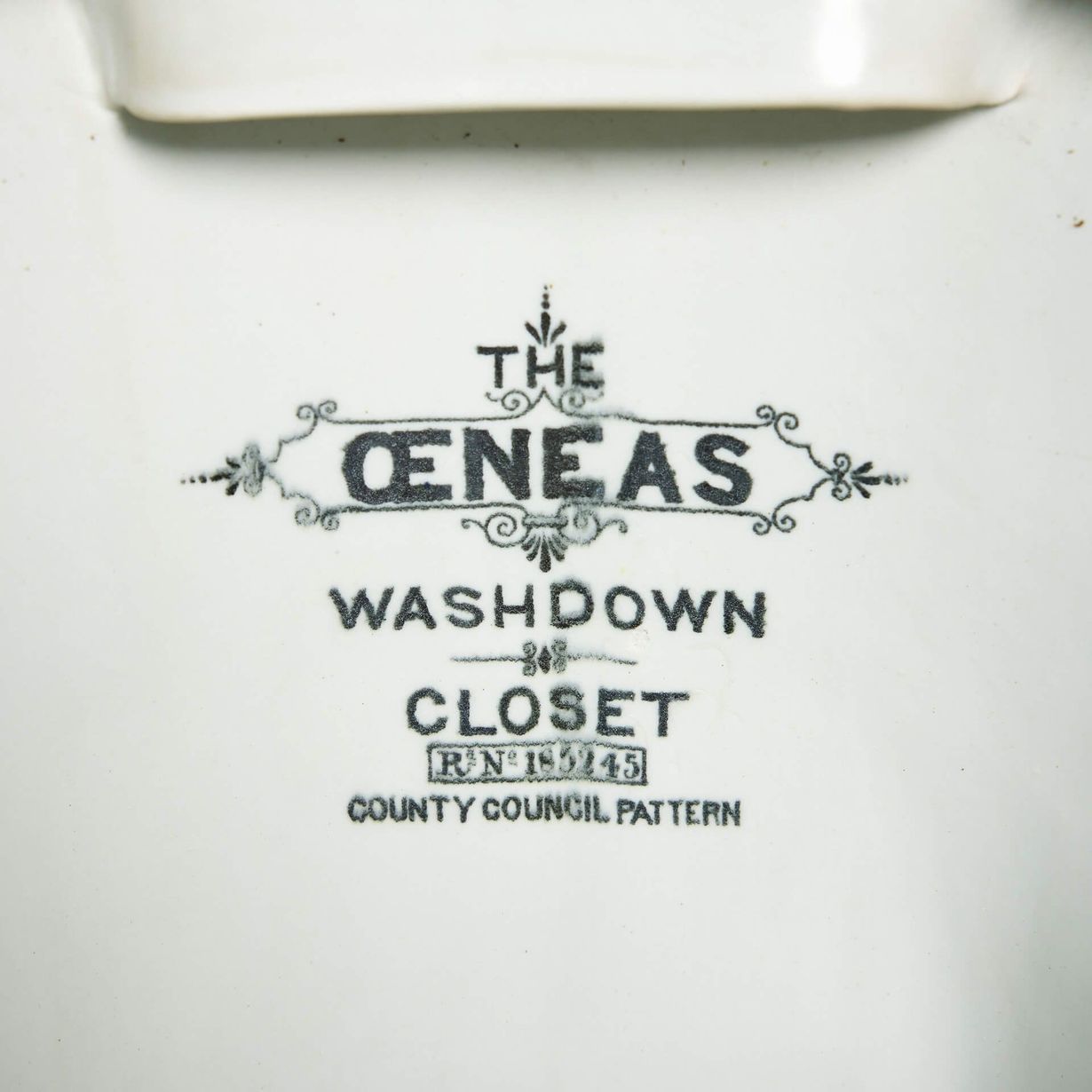 An ‘Oeneas’ antique English white glazed ceramic toilet with P trap waste. This model is suitable for use with a high-level cistern, making a stunning heritage feature of any bathroom.