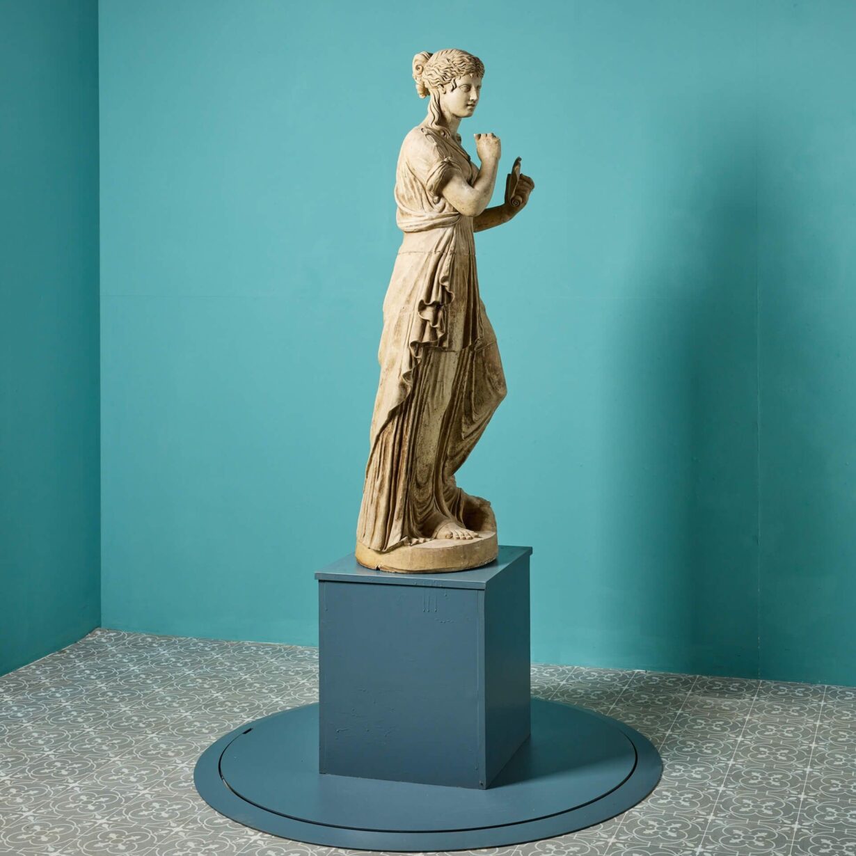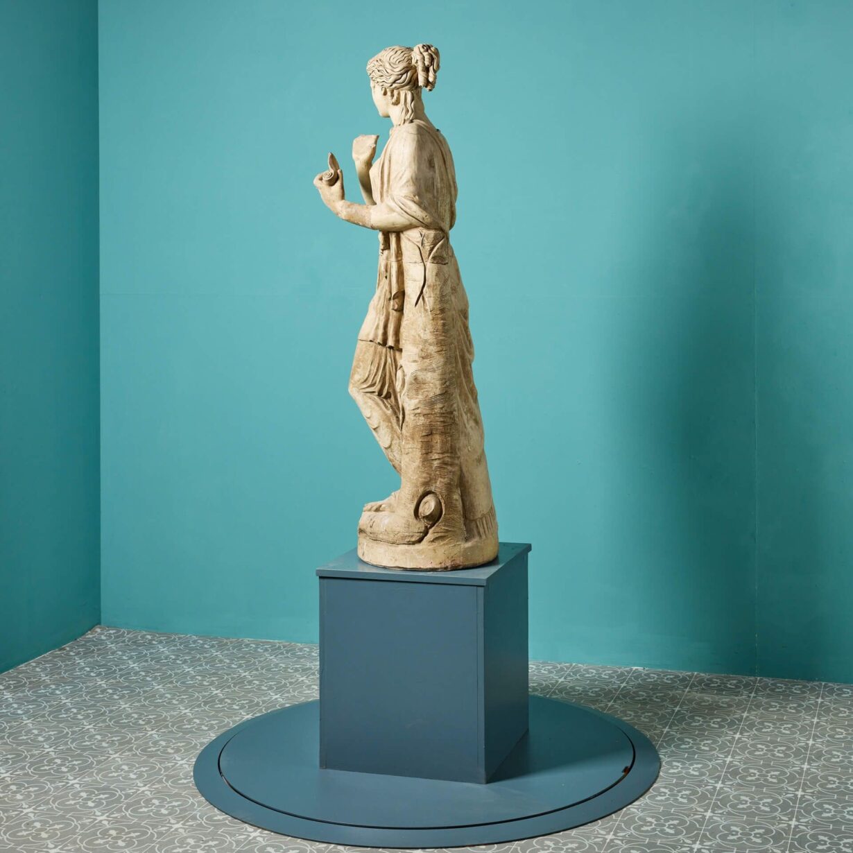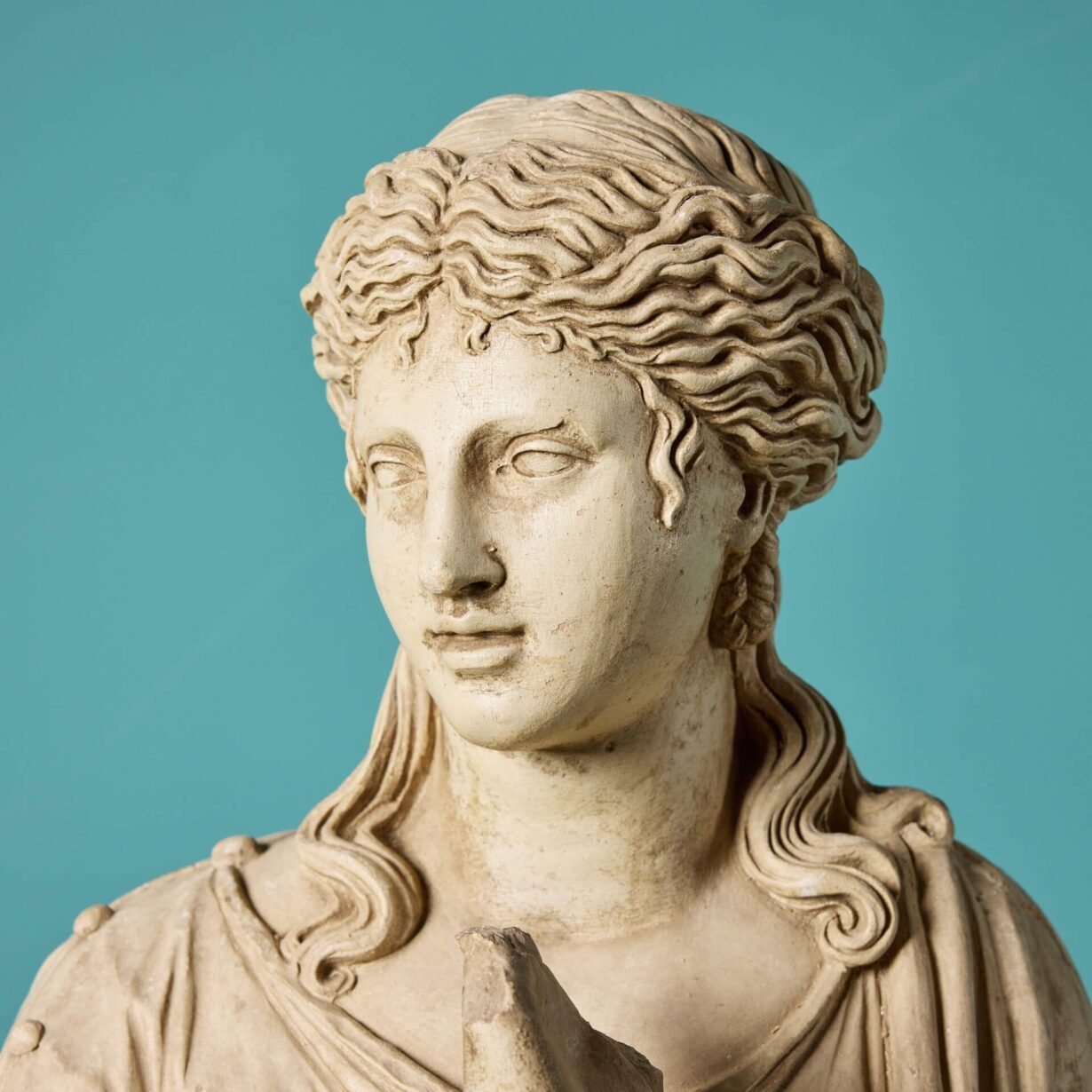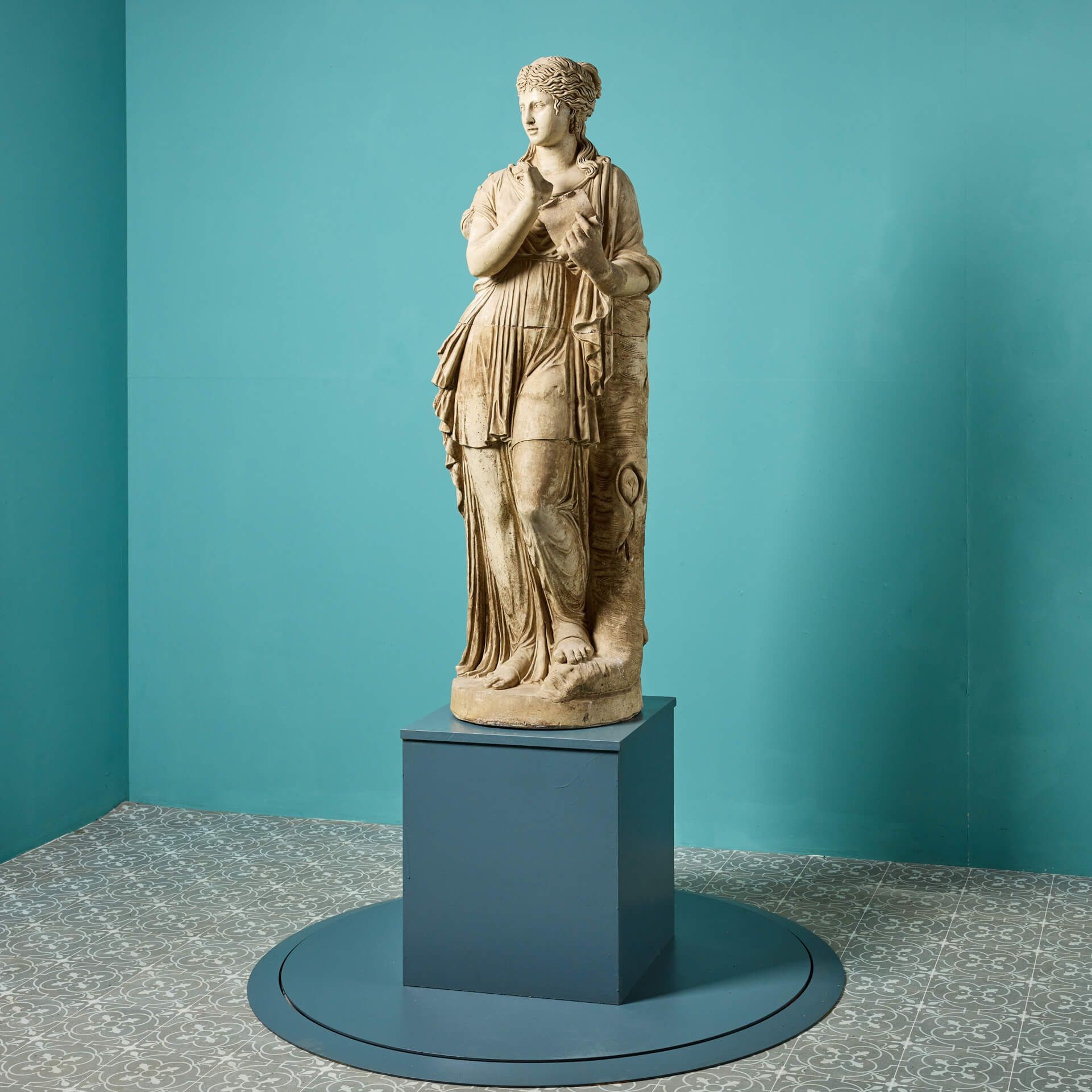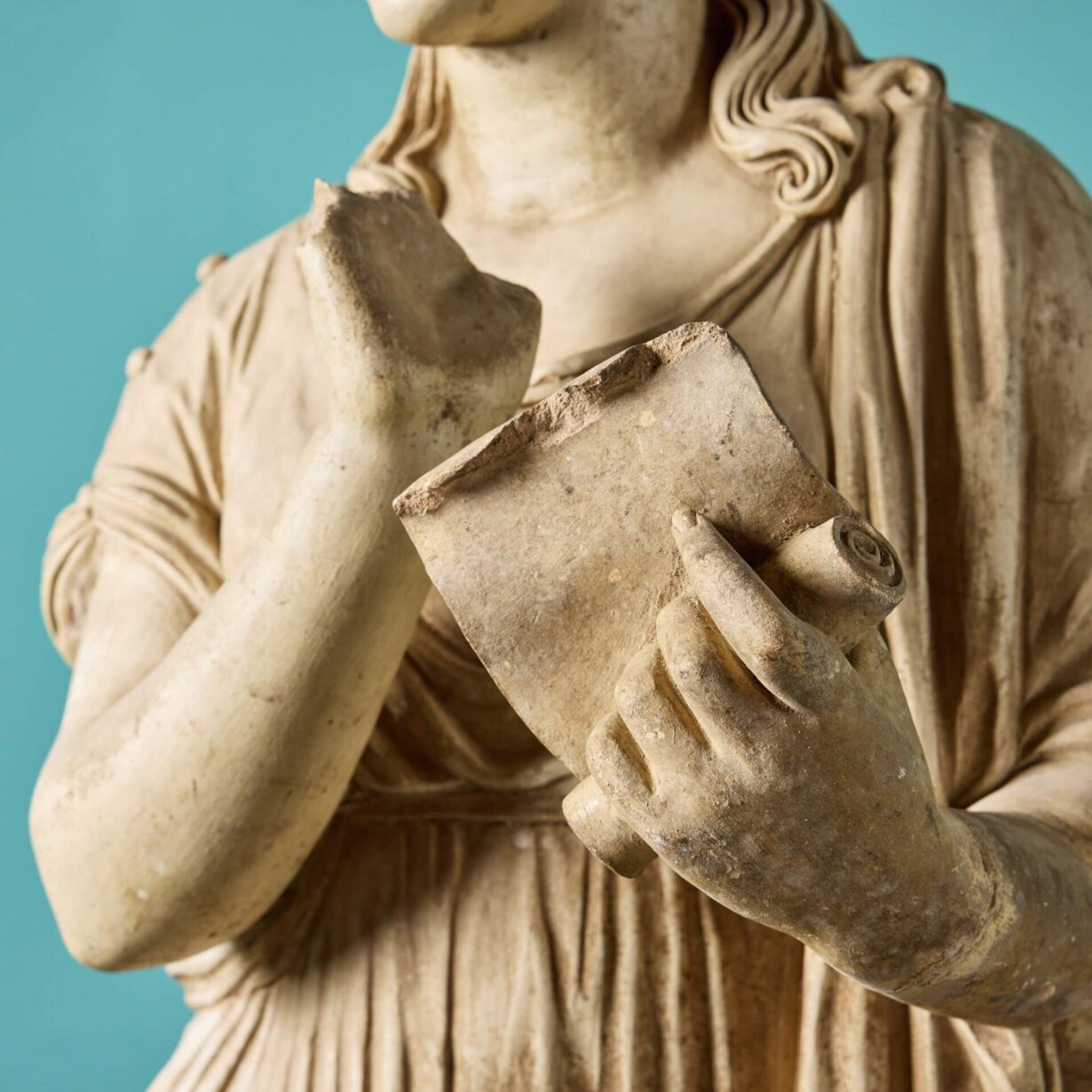 back to topA three-quarter lifesize French buff terracotta antique statue of Clio, one of the 9 Muses of Greek Mythology, dating from the early 20th century. Goddess of history, Clio leans on a tree stump and is swathed in sweeping fabric, holding an open scroll in her left hand as she is often depicted. Of good scale and design, this Clio muse statue brings beauty and elegance to any courtyard or interior setting.
