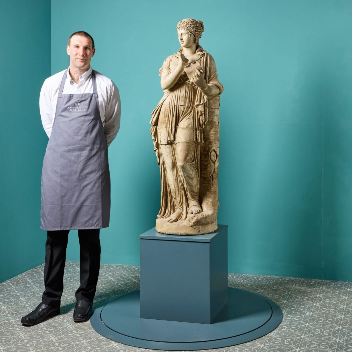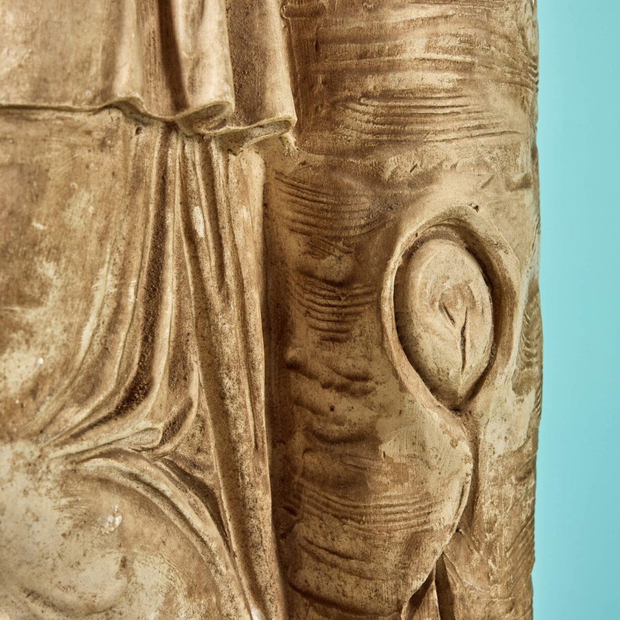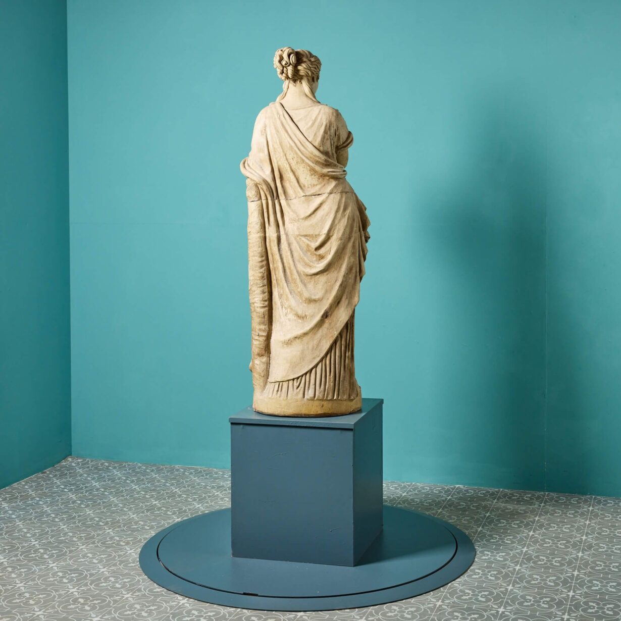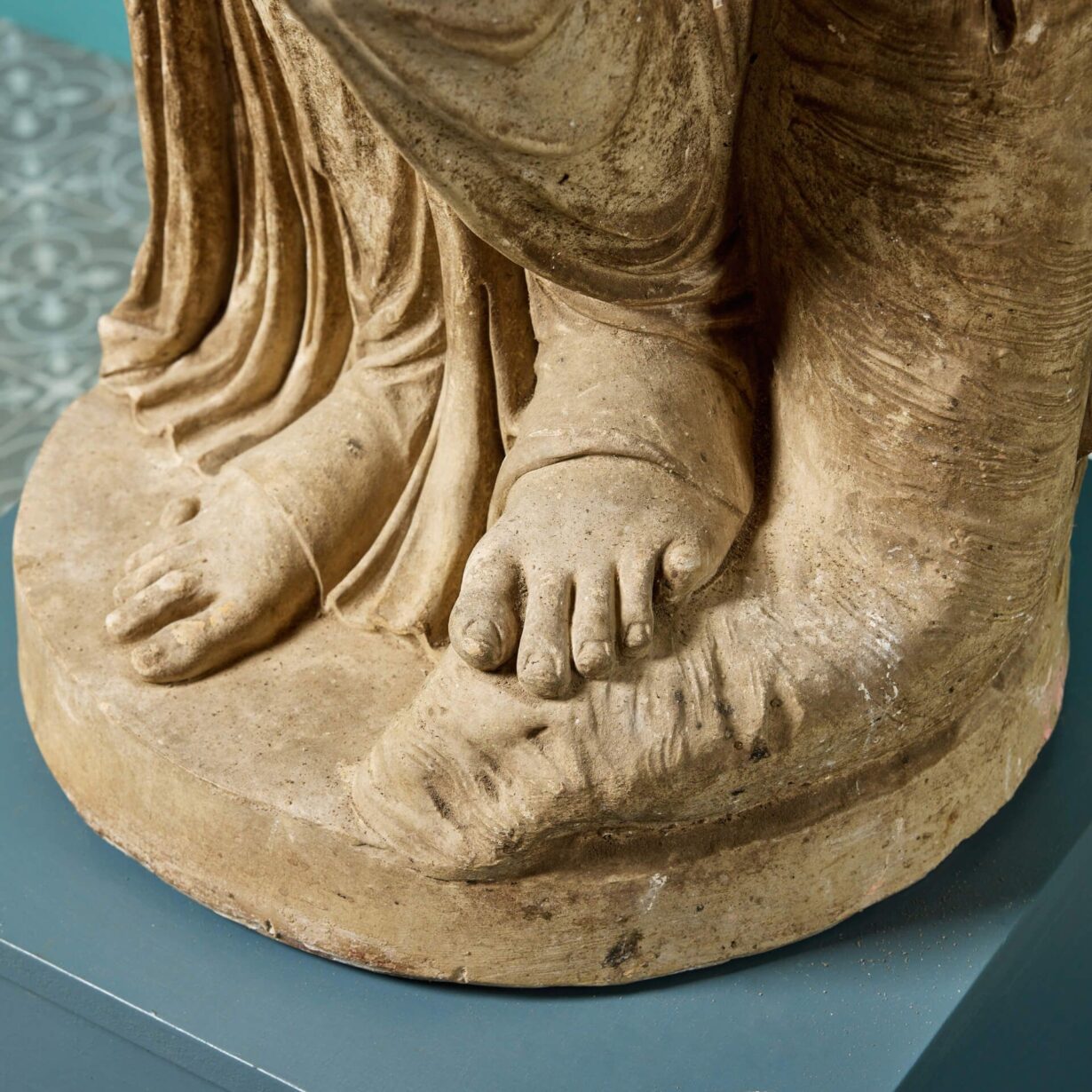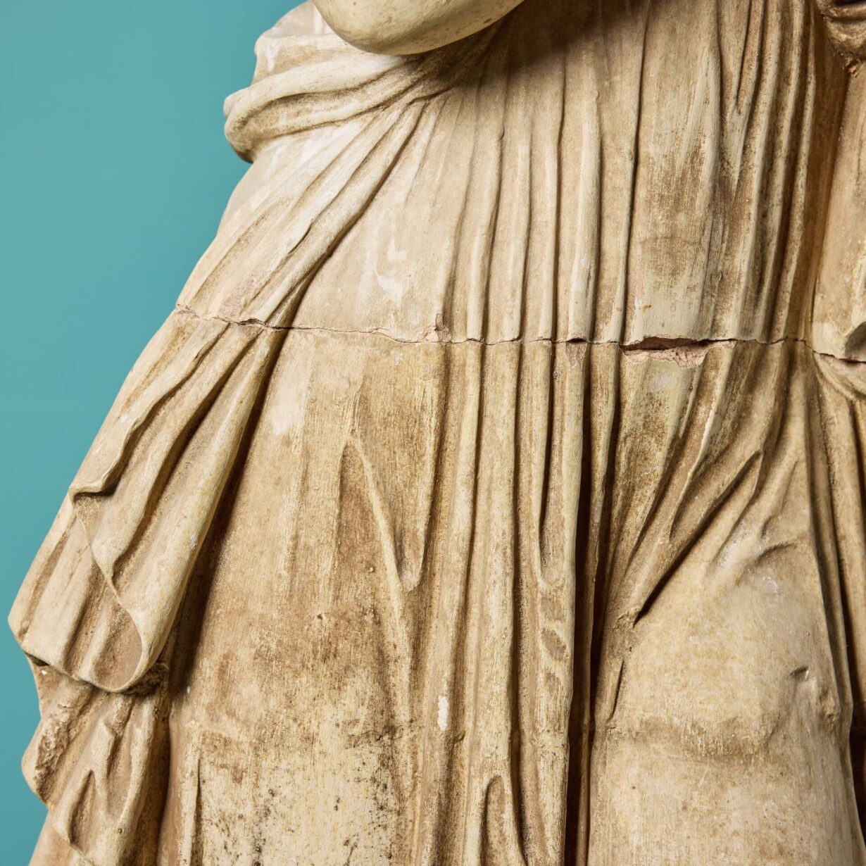 back to topA three-quarter lifesize French buff terracotta antique statue of Clio, one of the 9 Muses of Greek Mythology, dating from the early 20th century. Goddess of history, Clio leans on a tree stump and is swathed in sweeping fabric, holding an open scroll in her left hand as she is often depicted. Of good scale and design, this Clio muse statue brings beauty and elegance to any courtyard or interior setting.