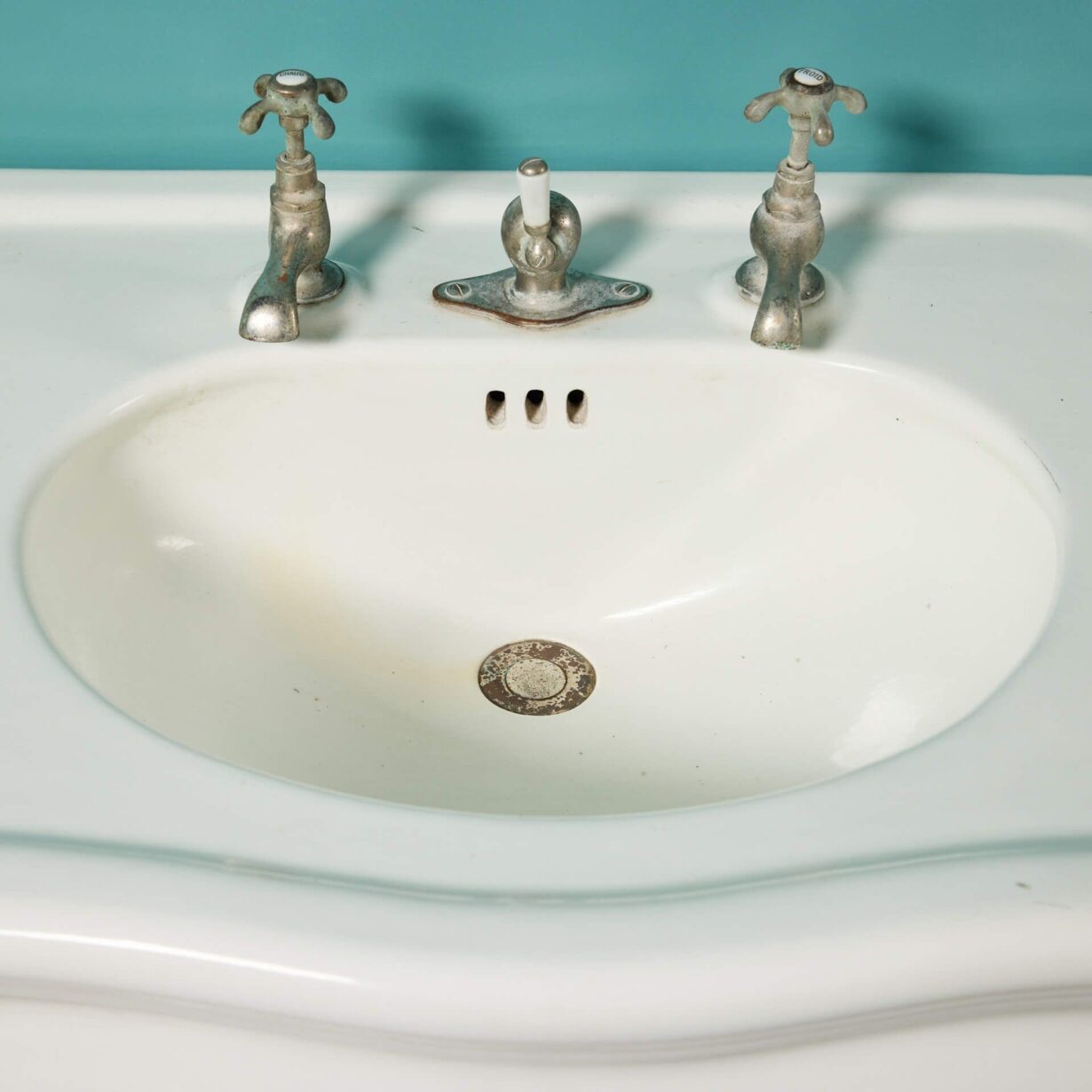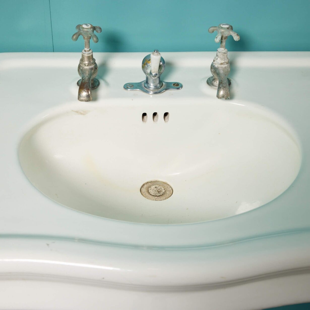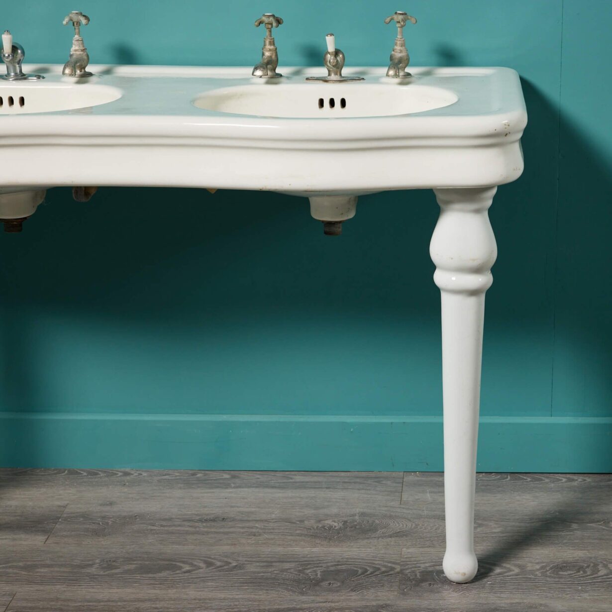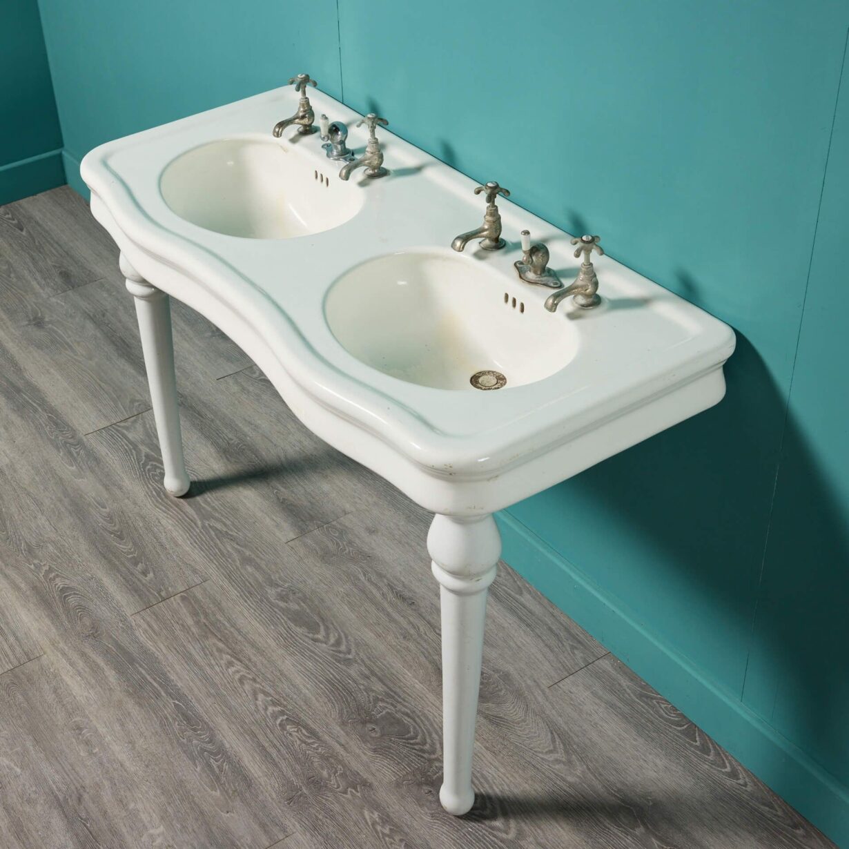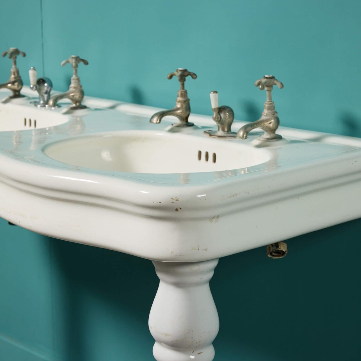 back to topAn early 20th century antique French double sink with porcelain legs. Supported by two sleek ceramic legs, this fashionable large scale sink displays elegance with its white glazed finish and curved shape; all while incorporating a range of styles including Louis, Edwardian, and Victorian. Dating to circa 1900, this antique is an elegant sink unit for a vintage bathroom or traditional couple’s ensuite.