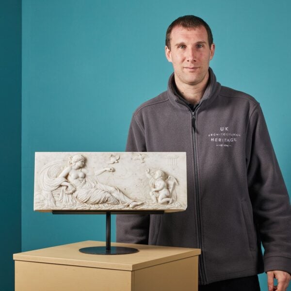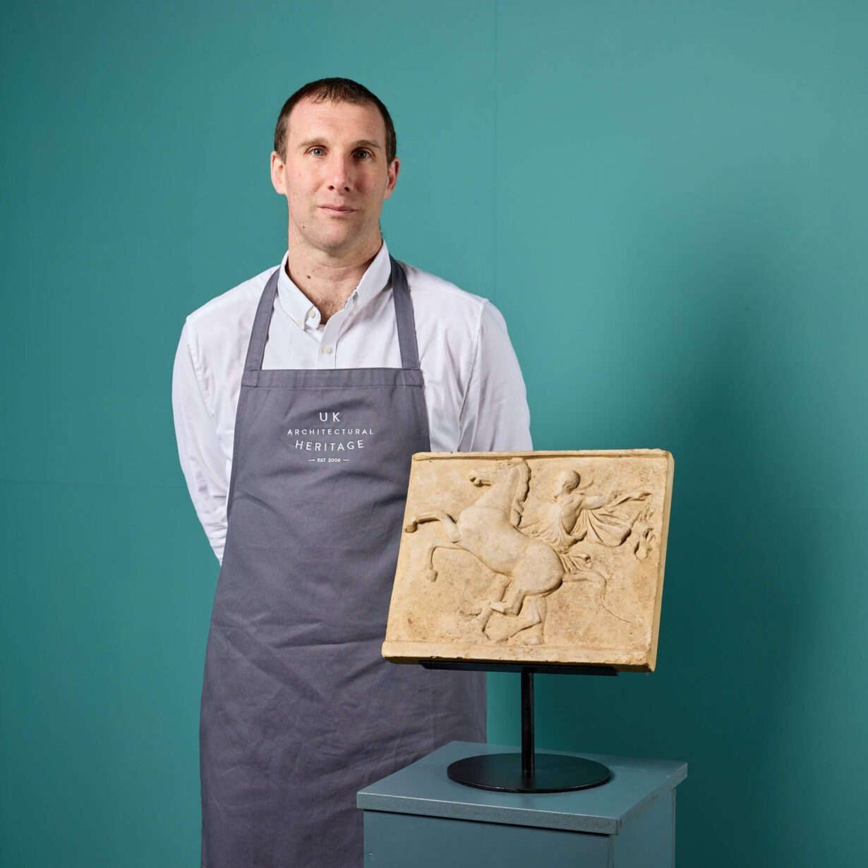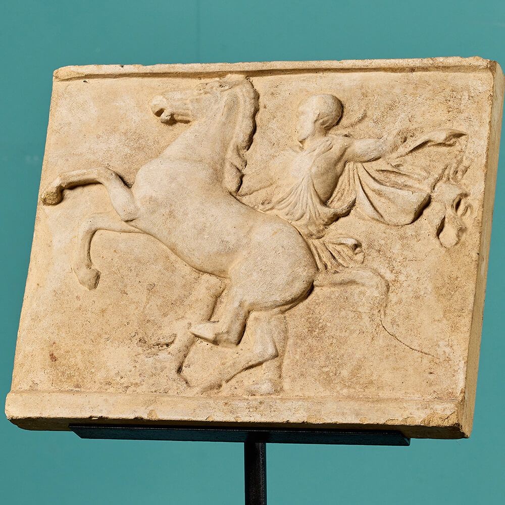 back to topAn antique terracotta plaque depicting a horse and rider in neoclassical and roman styles by the workshops of 19th century French ceramist, sculptor and architect, Émile Müller. Possibly after a similar design found at Hadrian’s Villa, Tivoli. Mounted on a bespoke steel stand, this antique plaque makes a beautiful display item for a collector’s cabinet or sideboard, showcasing its distinguished sculpting and golden terracotta colour.