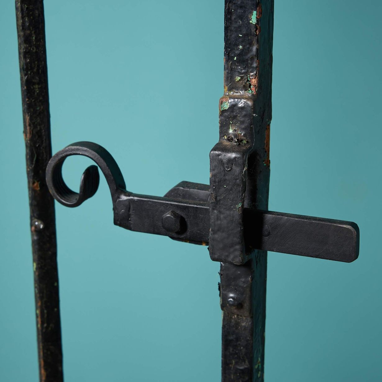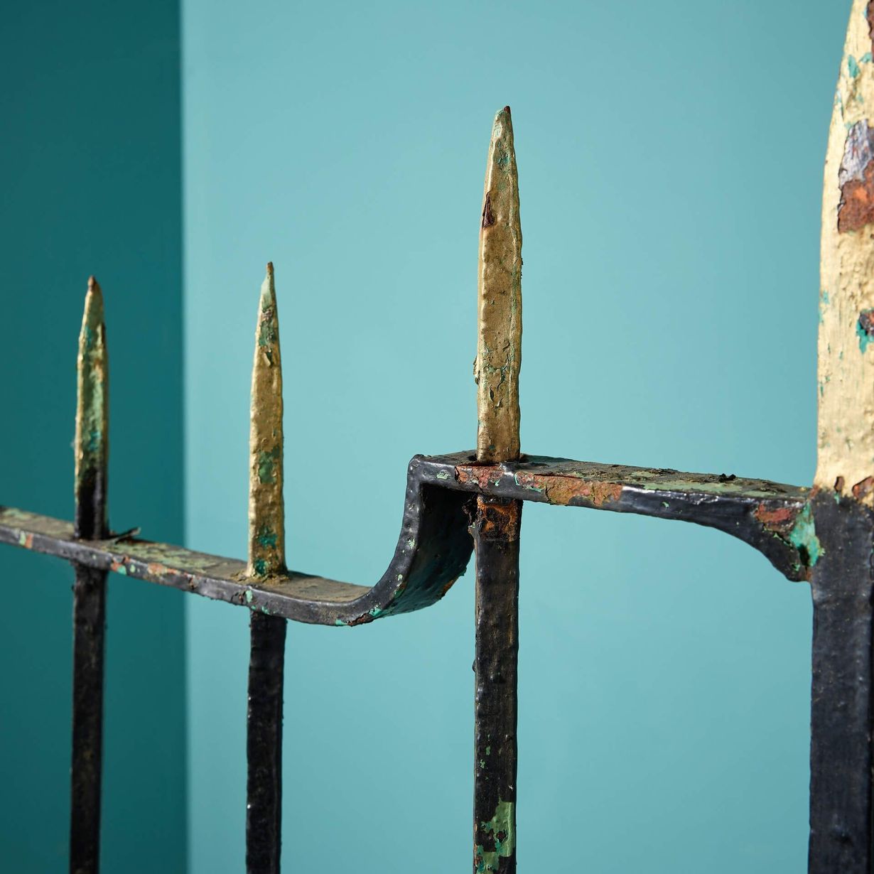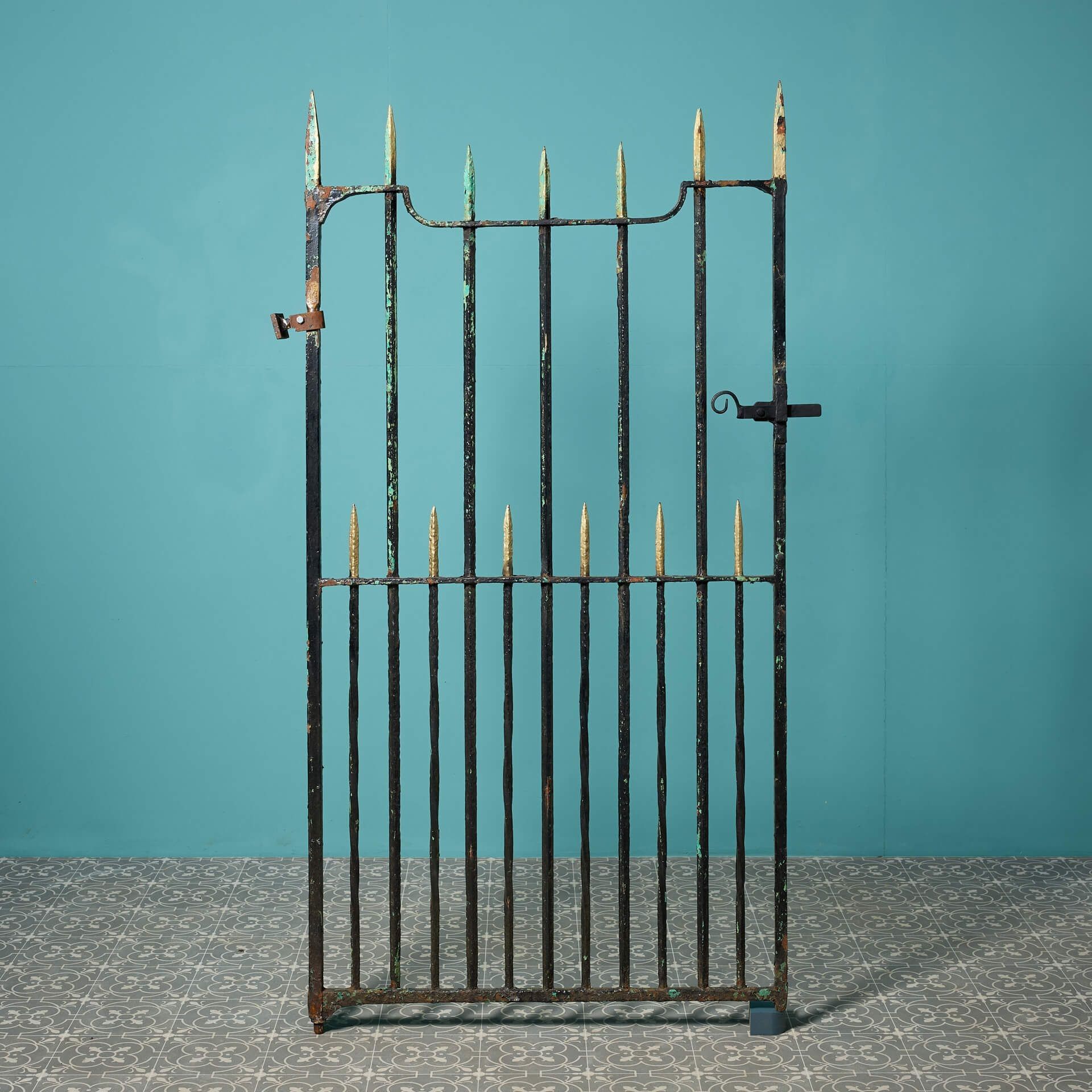 back to topAn antique Georgian era wrought iron garden gate; one of two similar we have for sale. Though made at the cusp of the 19th century, this iron side gate will sit beautifully in gardens traditional and contemporary alike with its simple vertical bar design and worn gold painted spikes.