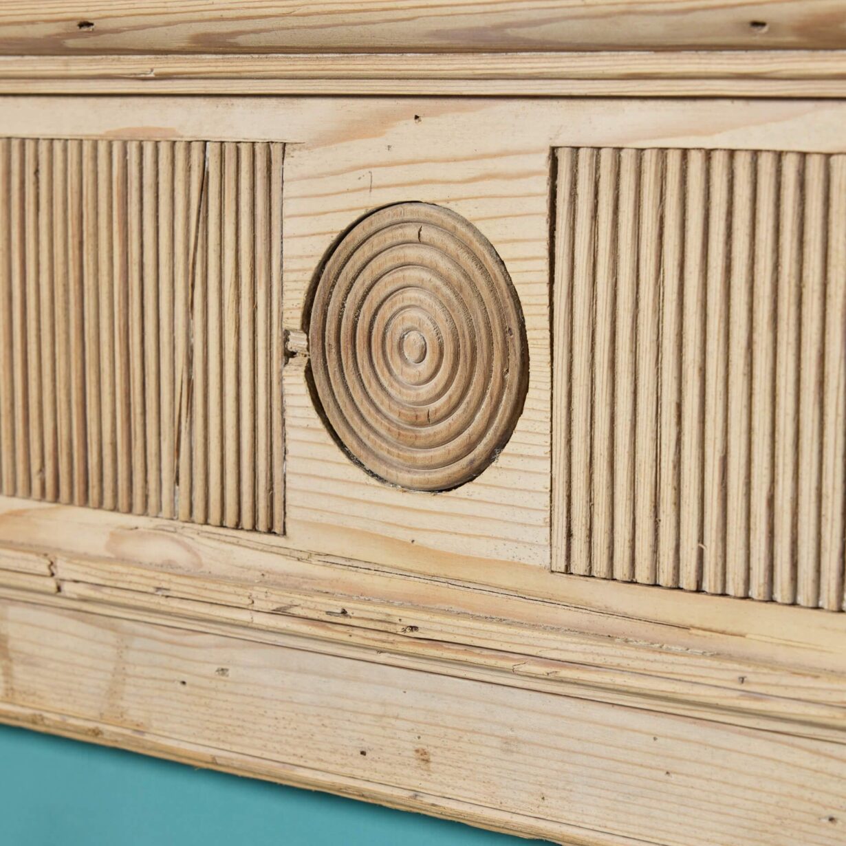 back to topAn 18th century antique Georgian pine fireplace with stripped finish, ready for paint, stain or wax. Dating from circa 1780, this fire surround has stood the test of time for more than 240 years, offering a glimpse into 18th century England! Features include five ‘bullseye’ style roundels to the frieze and end blocks between reeded details throughout.