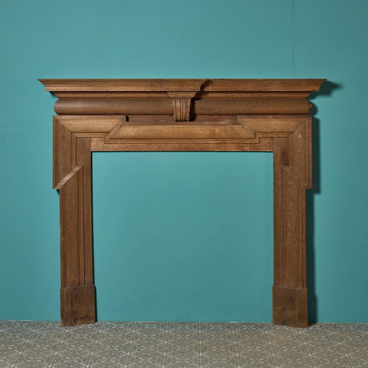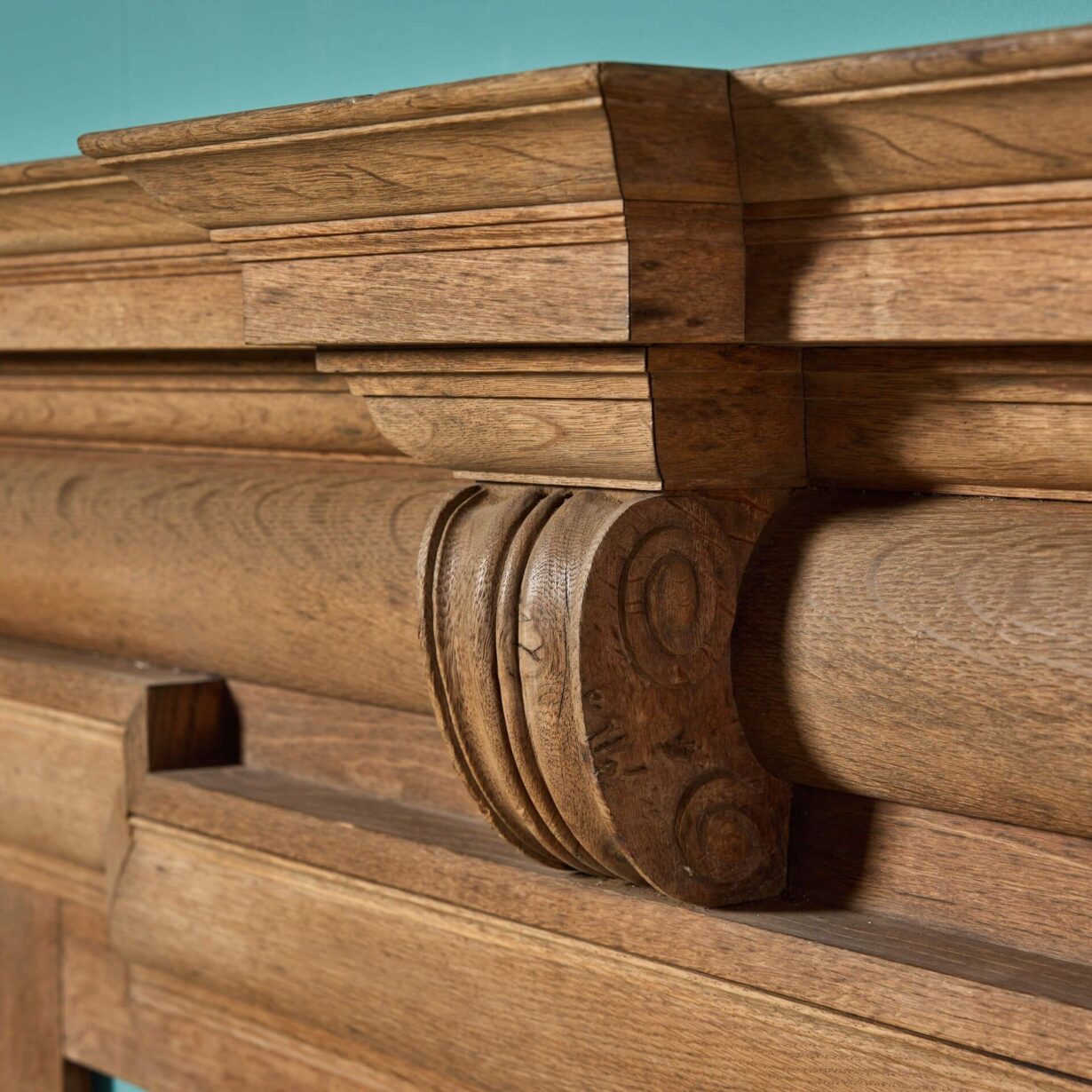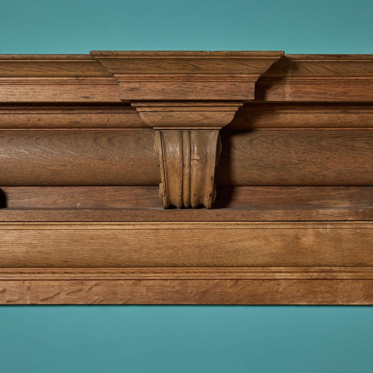 back to topThis handsome antique Georgian style oak wood fire surround is over 170 years old circa 1850. It is of large scale and has a beautiful natural oak finish, looking impressive in the dining or reception room of a Georgian townhouse or country home. Character features include striking dog leg jambs and a narrow barrel frieze detailed with an elaborate scroll bracket to the centre.