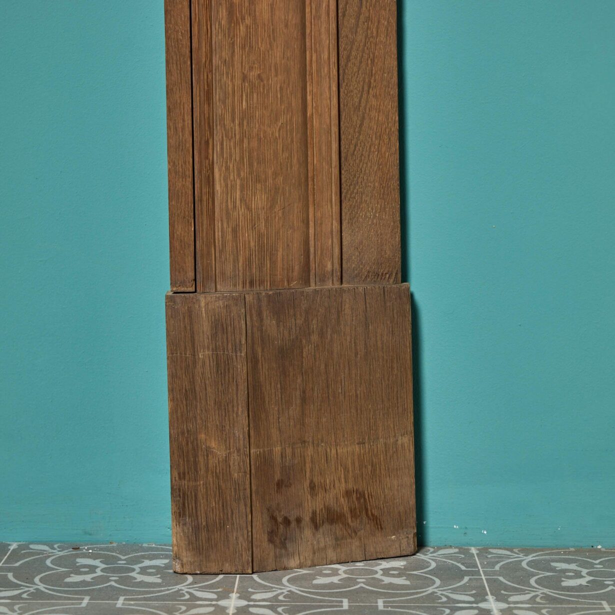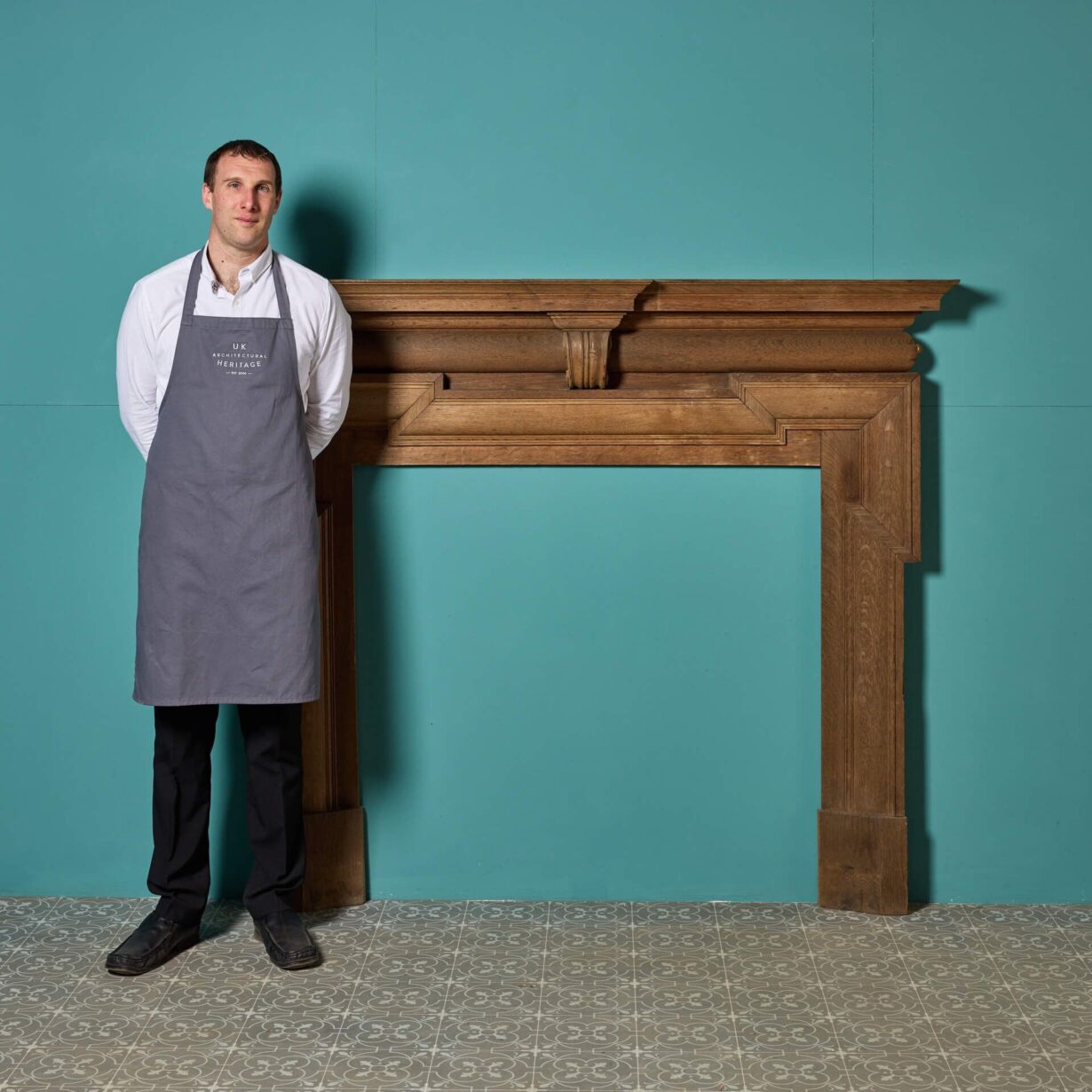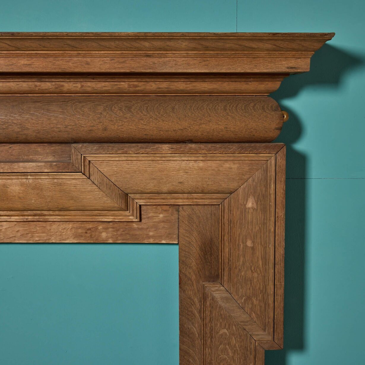 back to topThis handsome antique Georgian style oak wood fire surround is over 170 years old circa 1850. It is of large scale and has a beautiful natural oak finish, looking impressive in the dining or reception room of a Georgian townhouse or country home. Character features include striking dog leg jambs and a narrow barrel frieze detailed with an elaborate scroll bracket to the centre.