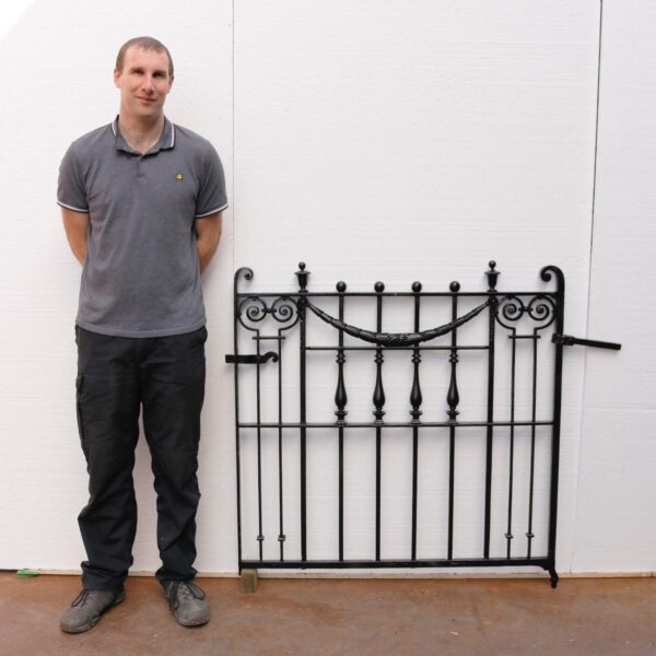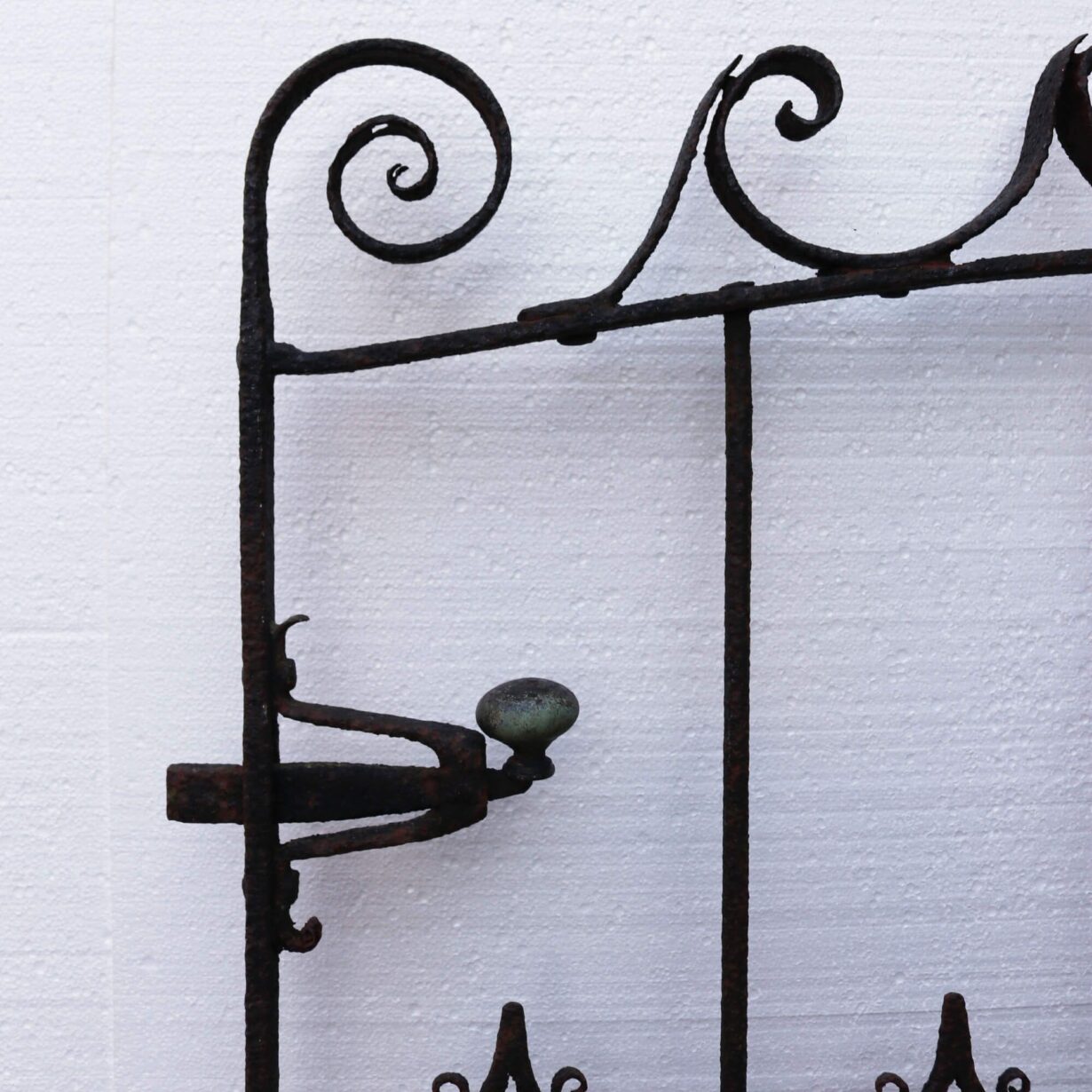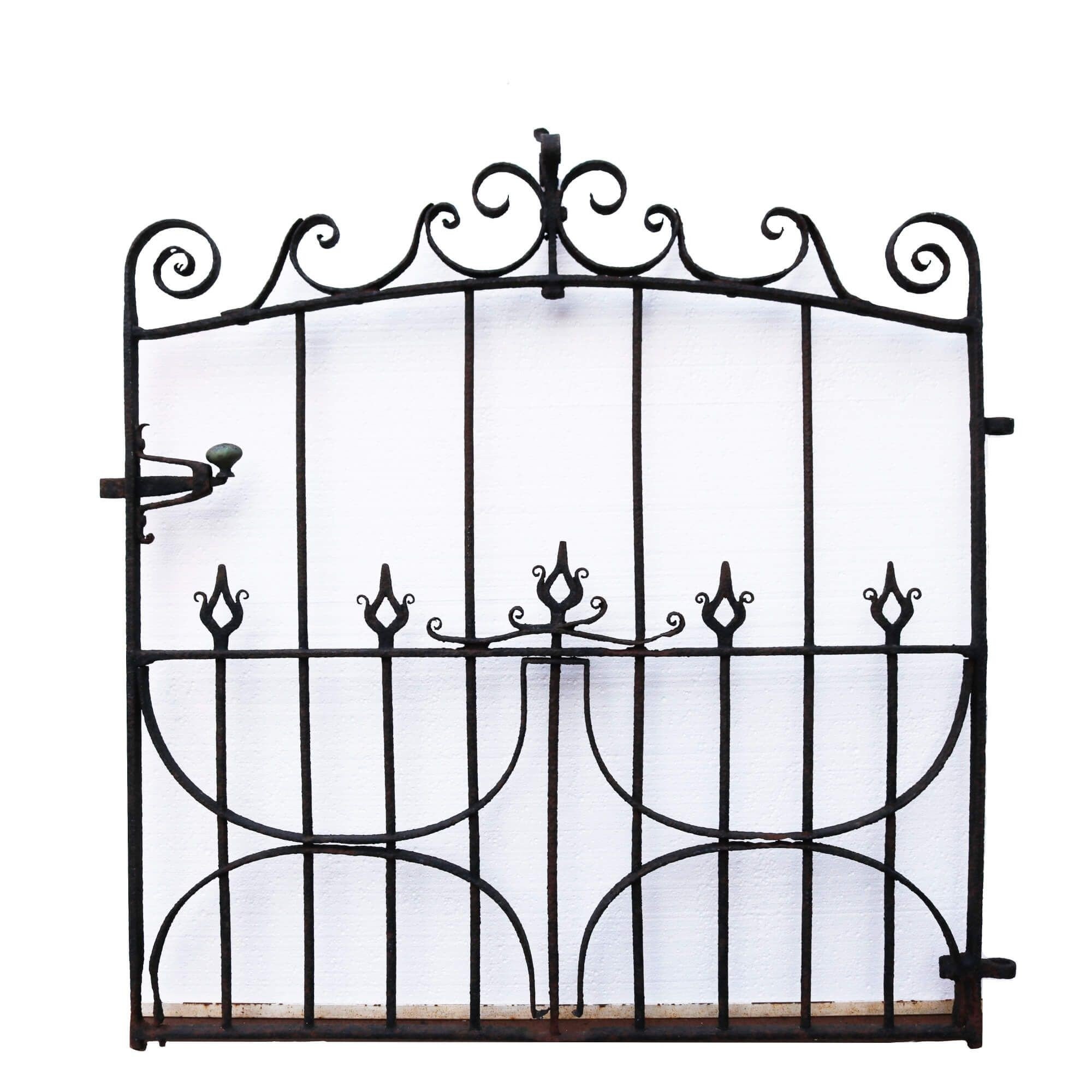 back to topThis early 19th century Georgian antique wrought iron pedestrian gate would bring an instant classic look to the front of a home, or garden. Its original working latch, and hinge eyes illustrate grand English craftsmanship. The unusual shapes, and scrolls have stood the test of time.