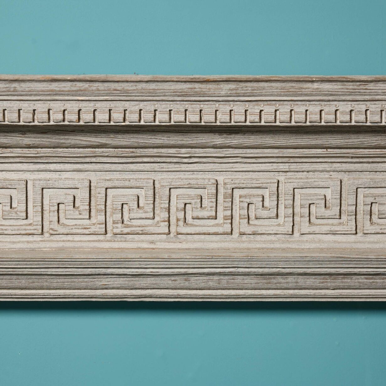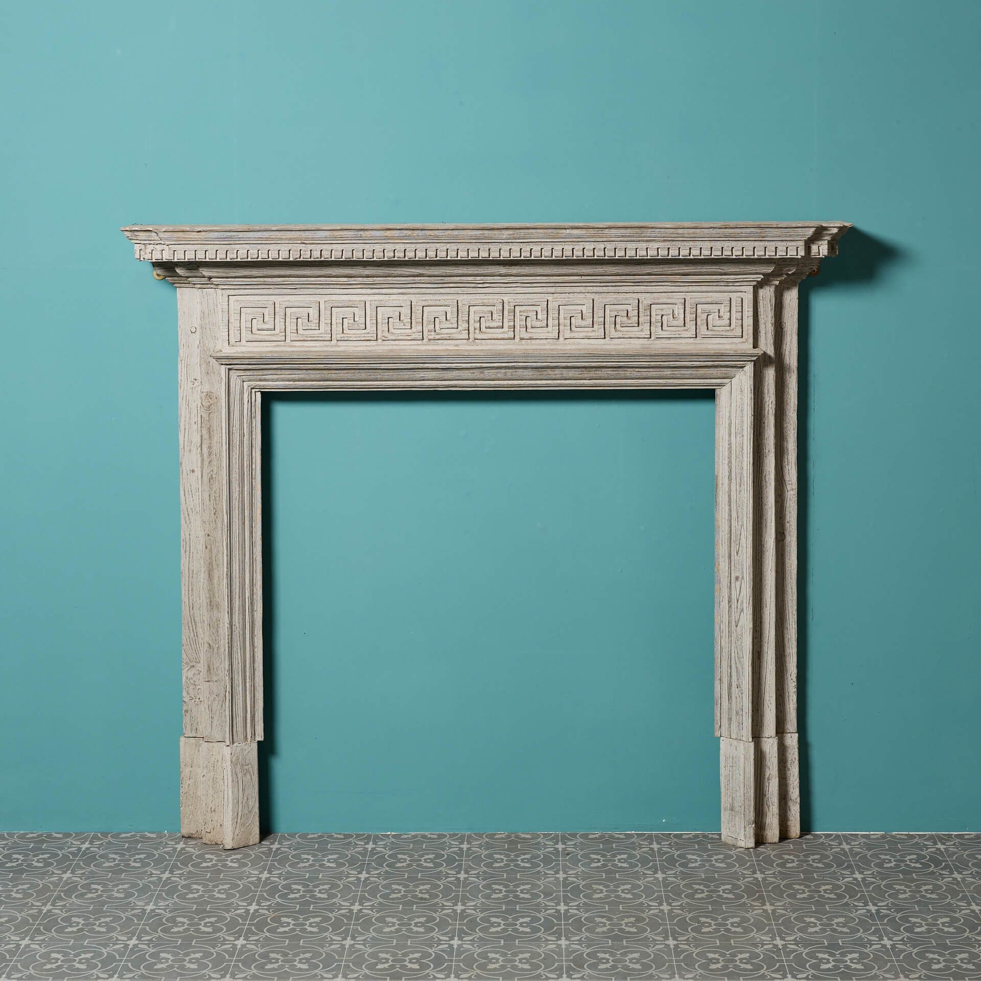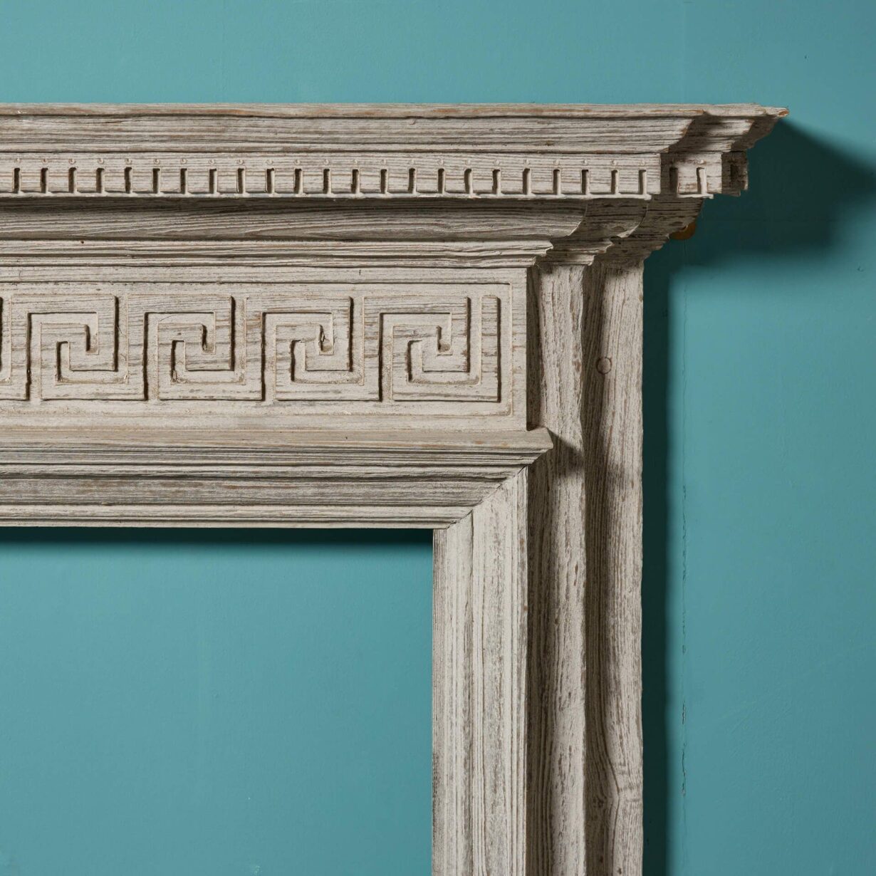back to topA mid-late 19th century English grey wash pine fireplace. This striking fire mantel dates from the 1870s and is stylishly decorated with repeating Greek key details across the frieze that create a stylish neoclassical look. It is finished in a grey wash and has been sandblasted to achieve a distressed look, becoming a timeless addition to interiors old and new. Dentals ornament the staggered shape of the mantel shelf, adding to its grandeur as the focal point of a room.