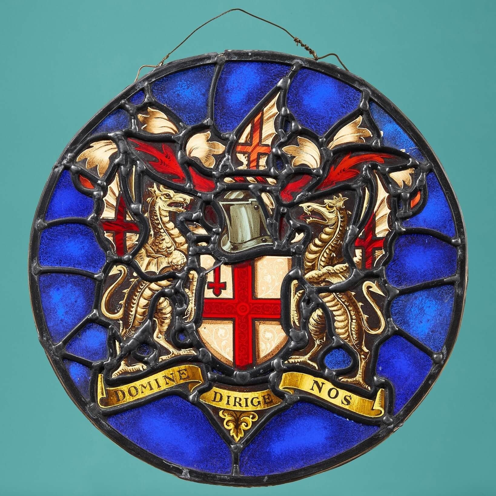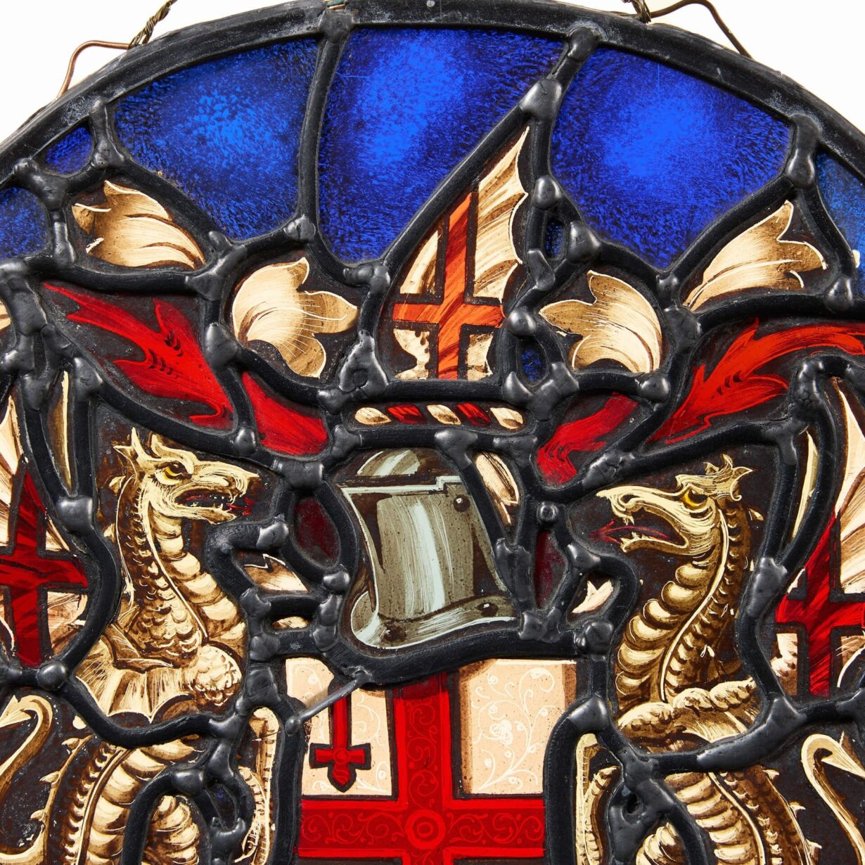 back to topAn antique heraldic late 19th century stained glass roundel depicting a stylised scene of St George’s cross.