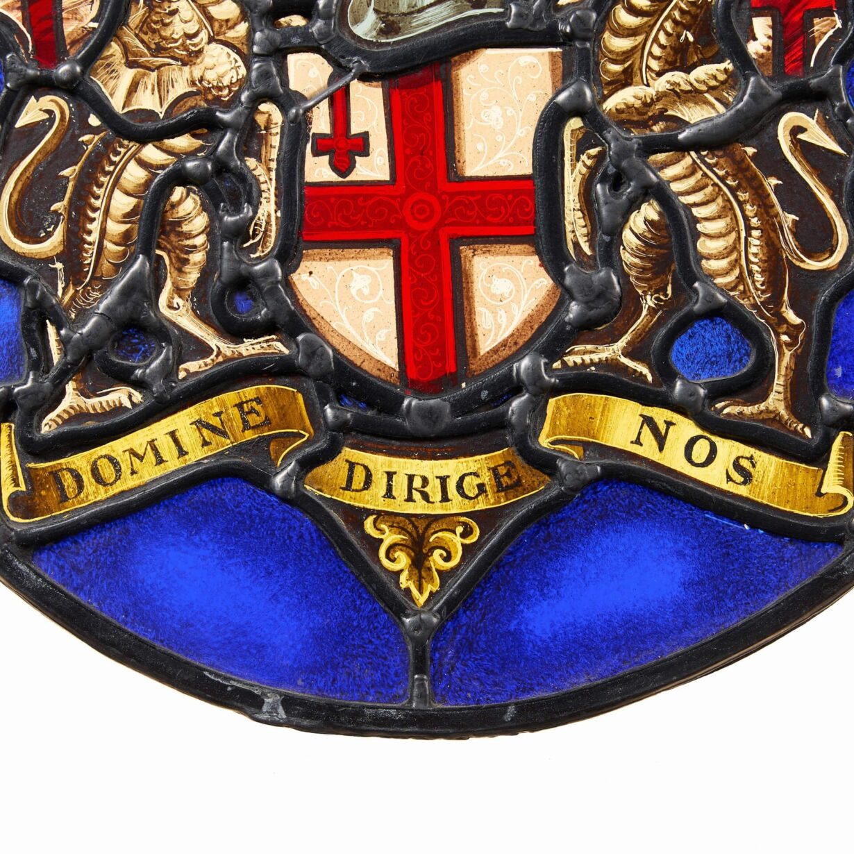 The design centres around two stylised dragons holding St George’s cross on a vivid blue background and the latin script ‘Domine Dirige NOS’, meaning ‘Lord guide us’ or ‘O Lord, direct us’.