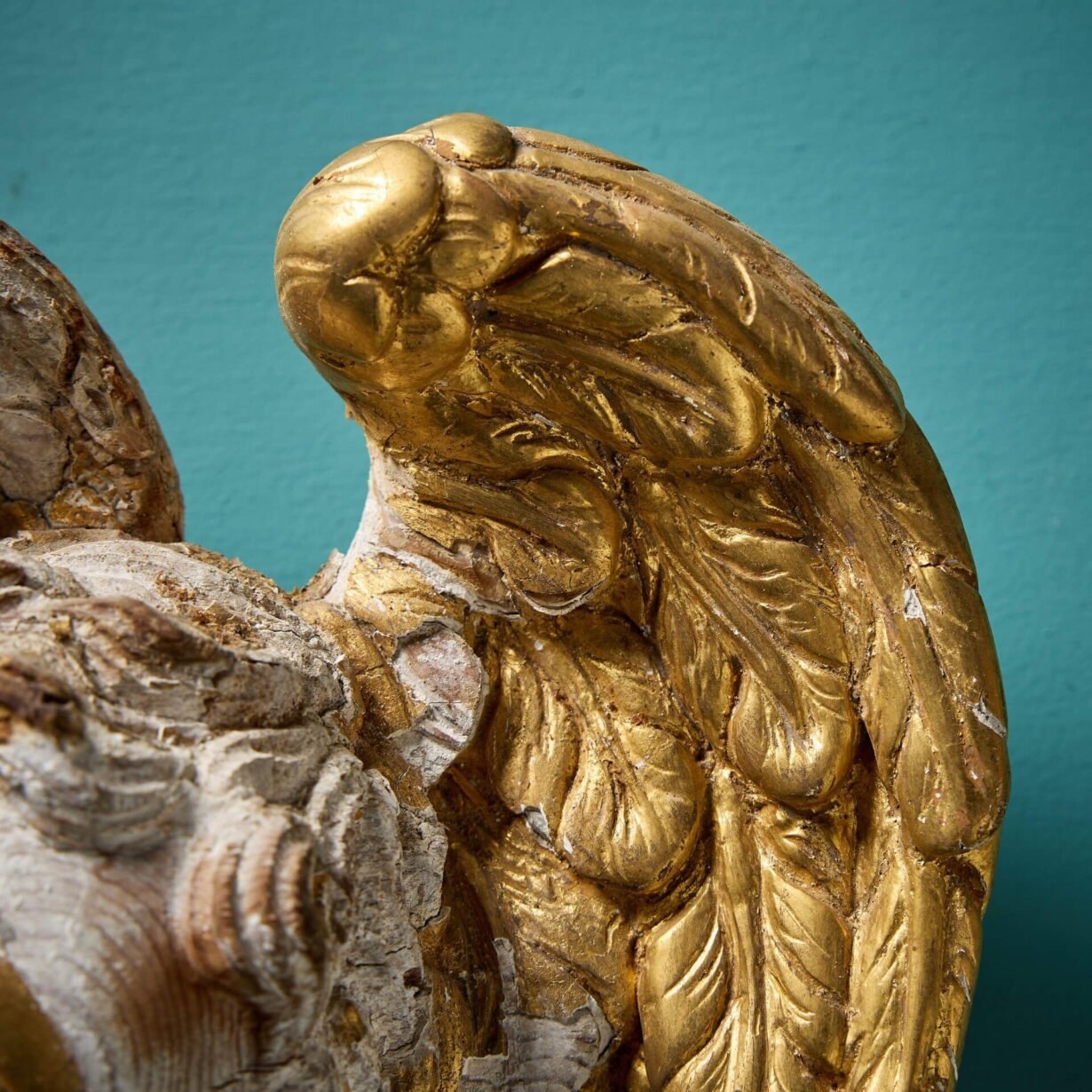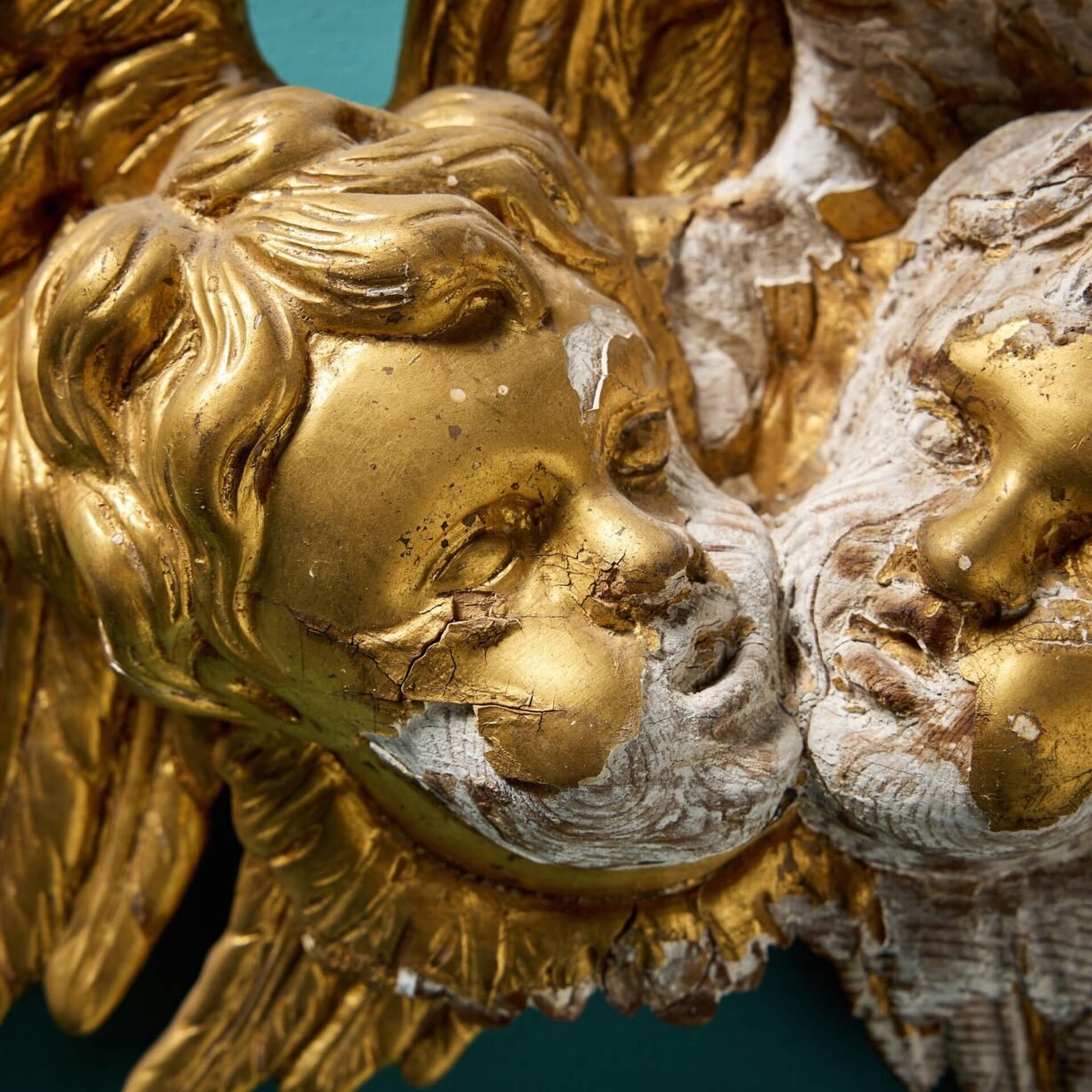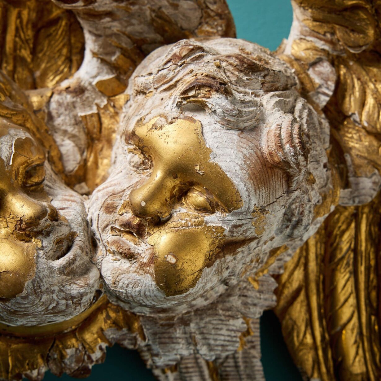back to topA charming carved and gilded antique putti pair, originating from late 18th / early 19th century Italy, perfect for hanging on an interior wall. Carved in pine and gesso, the piece depicts two cherub masks, each before a magnificent pair of angelic wings.