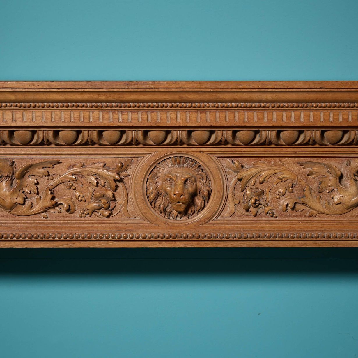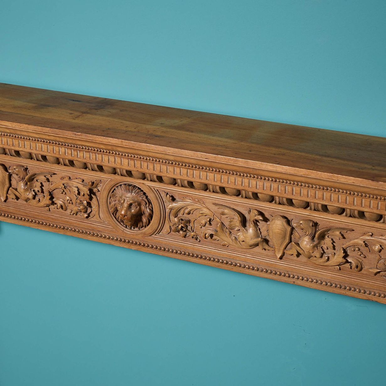 The walnut shelf and frieze section continue the flora and fauna themes. Finely carved putti look out from each corner of the mantle. More floral patterns weave into pairs of griffins facing inwards to blank shields. The whole piece is centred with an expertly carved lion’s head. Egg and dart moulding runs the length of the mantel, with delicate beading and vertical notches.