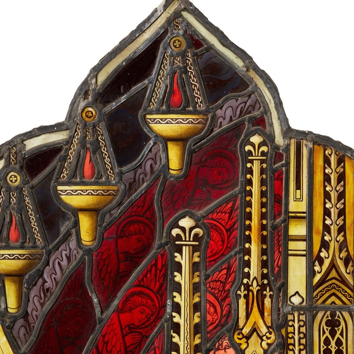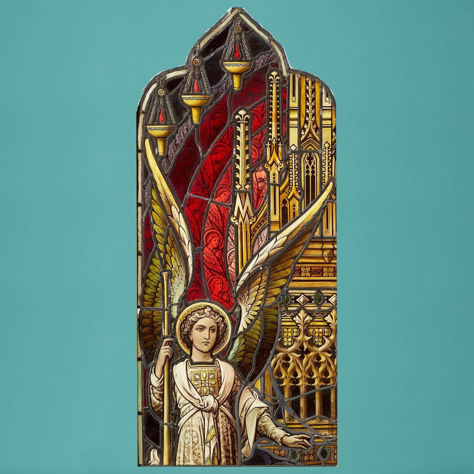 back to topAn antique lancet-arched stained glass window of an angel by Hardman & Co, Birmingham.