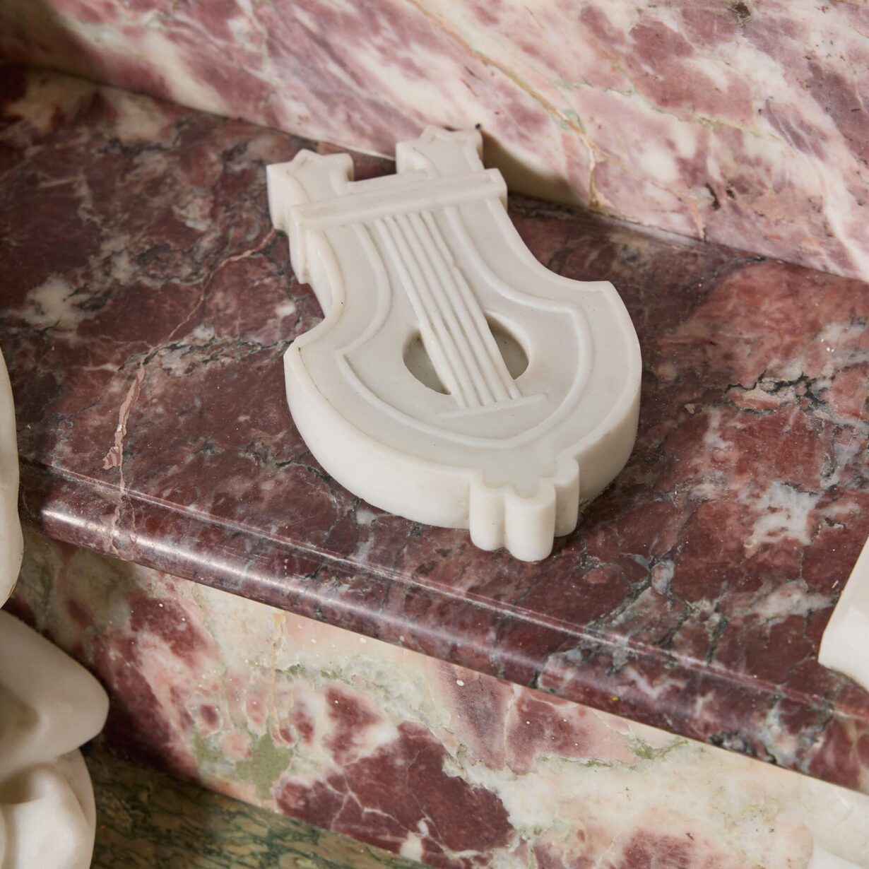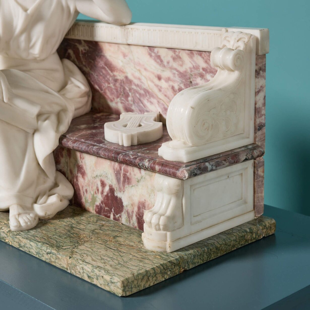 Crafted in campan green, violet breccia, and white statuary marble this sculpture shows Sappho, the Greek poet, classically dressed sitting on a Roman style bench.