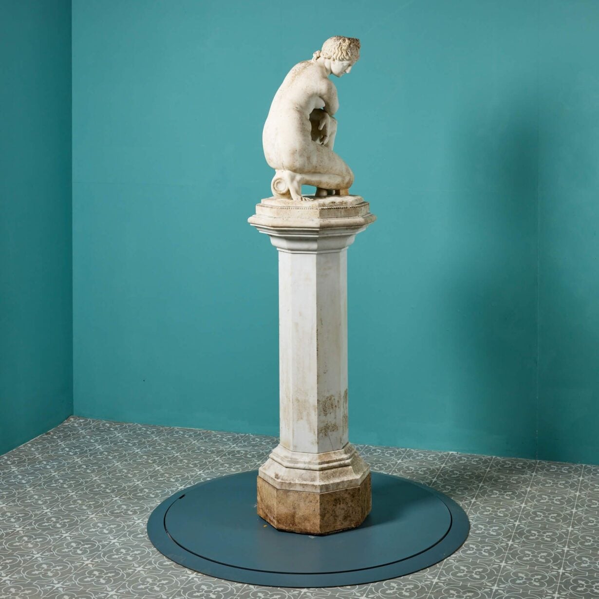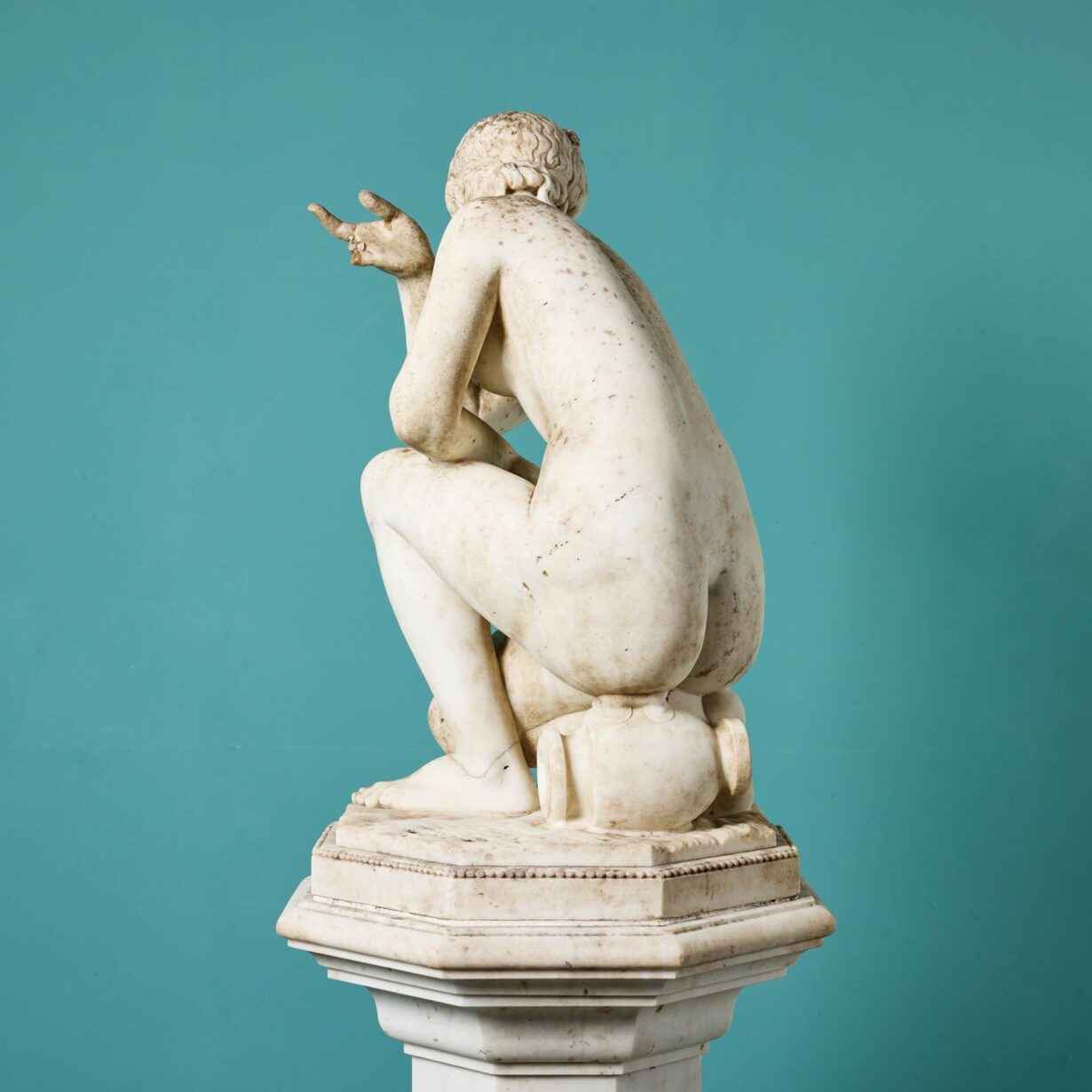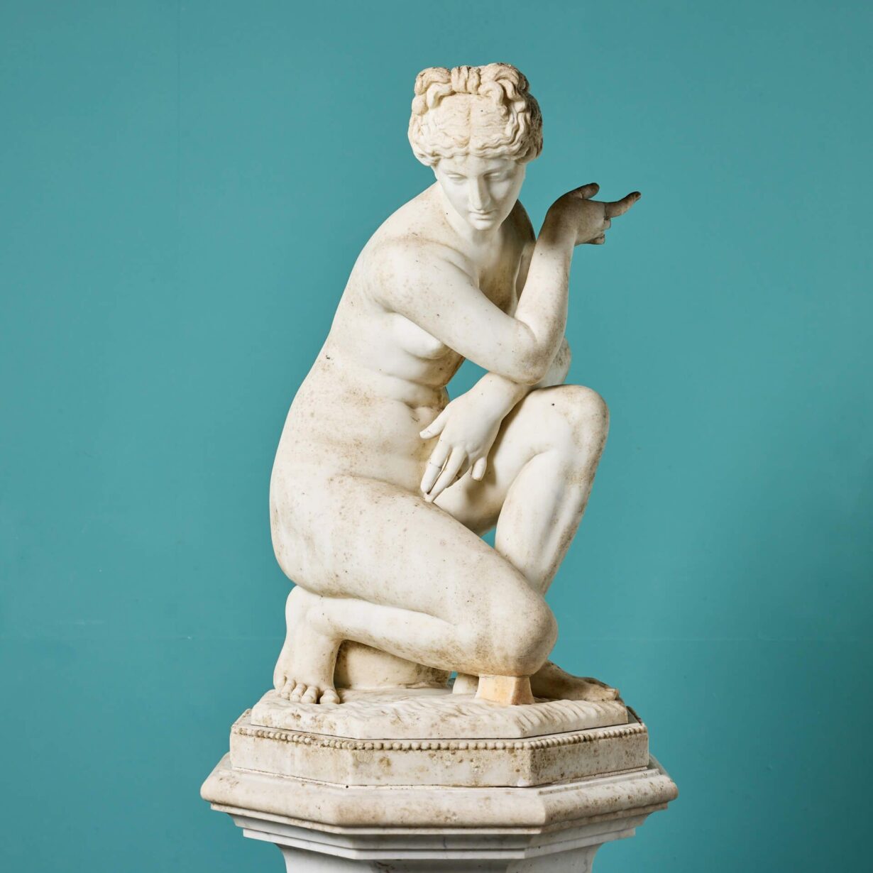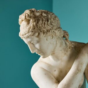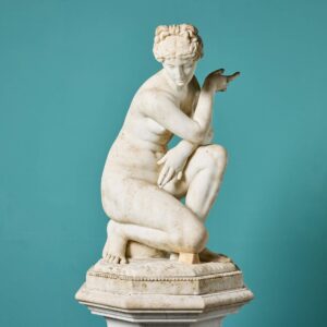 back to topA 19th century antique marble sculpture of Aphrodite also referred to as the ‘Crouching Venus’ on an octagonal pedestal. It is based on the antique Roman statue that forms part of the Royal Collection. This beautiful example once formed part of a private collection in Oxfordshire where it was a focal point within a traditional English country garden.