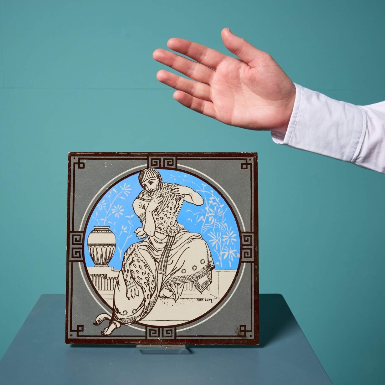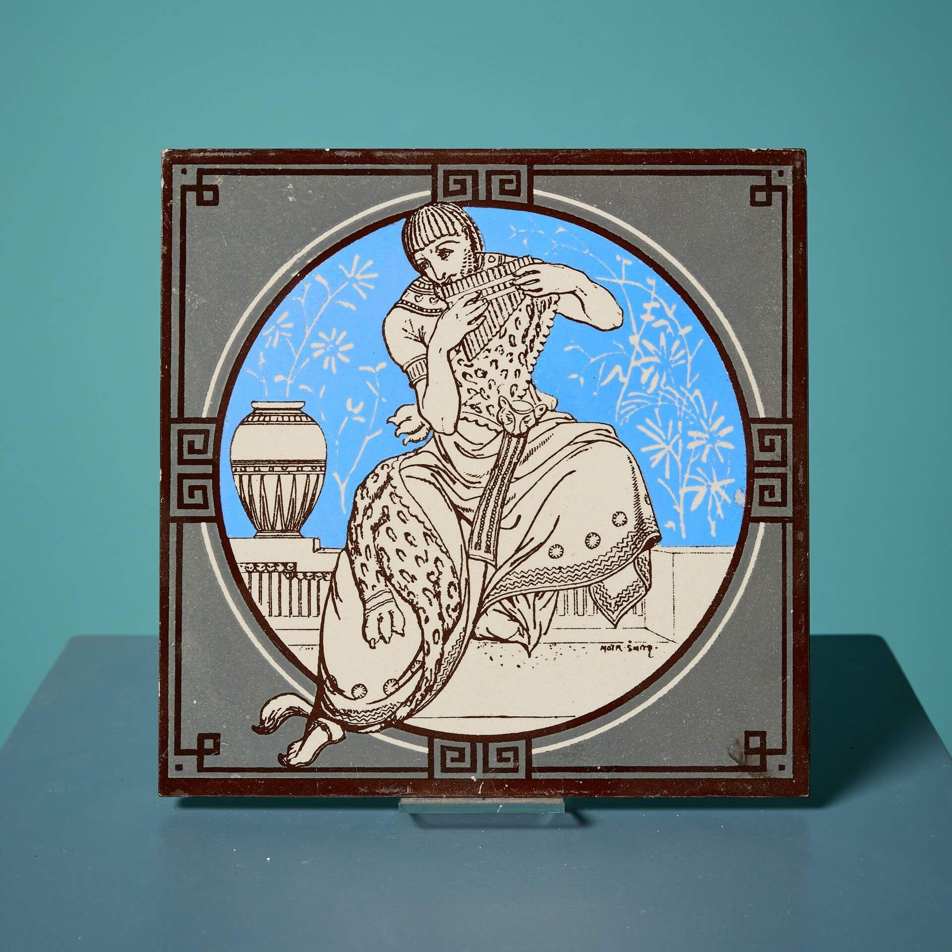 This 8 inch tile depicts a man in noble dress playing a panpipe, in a striking neoclassical style on a bright blue background.