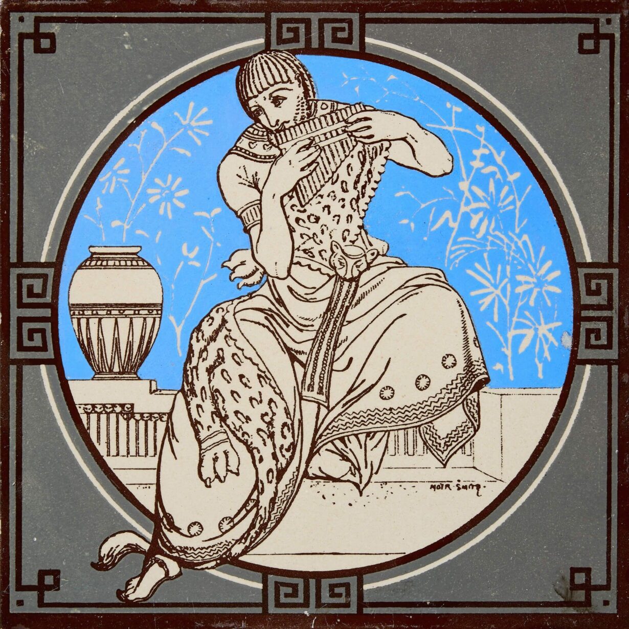 back to topAn antique Minton tile from the series ‘Classical Figures with Musical Instruments’ designed by the artist John Moyr Smith.