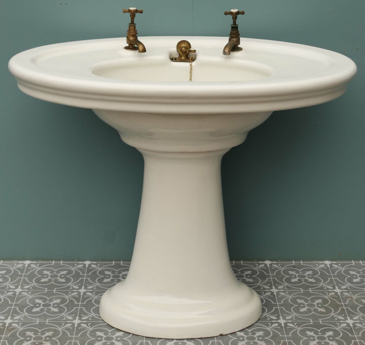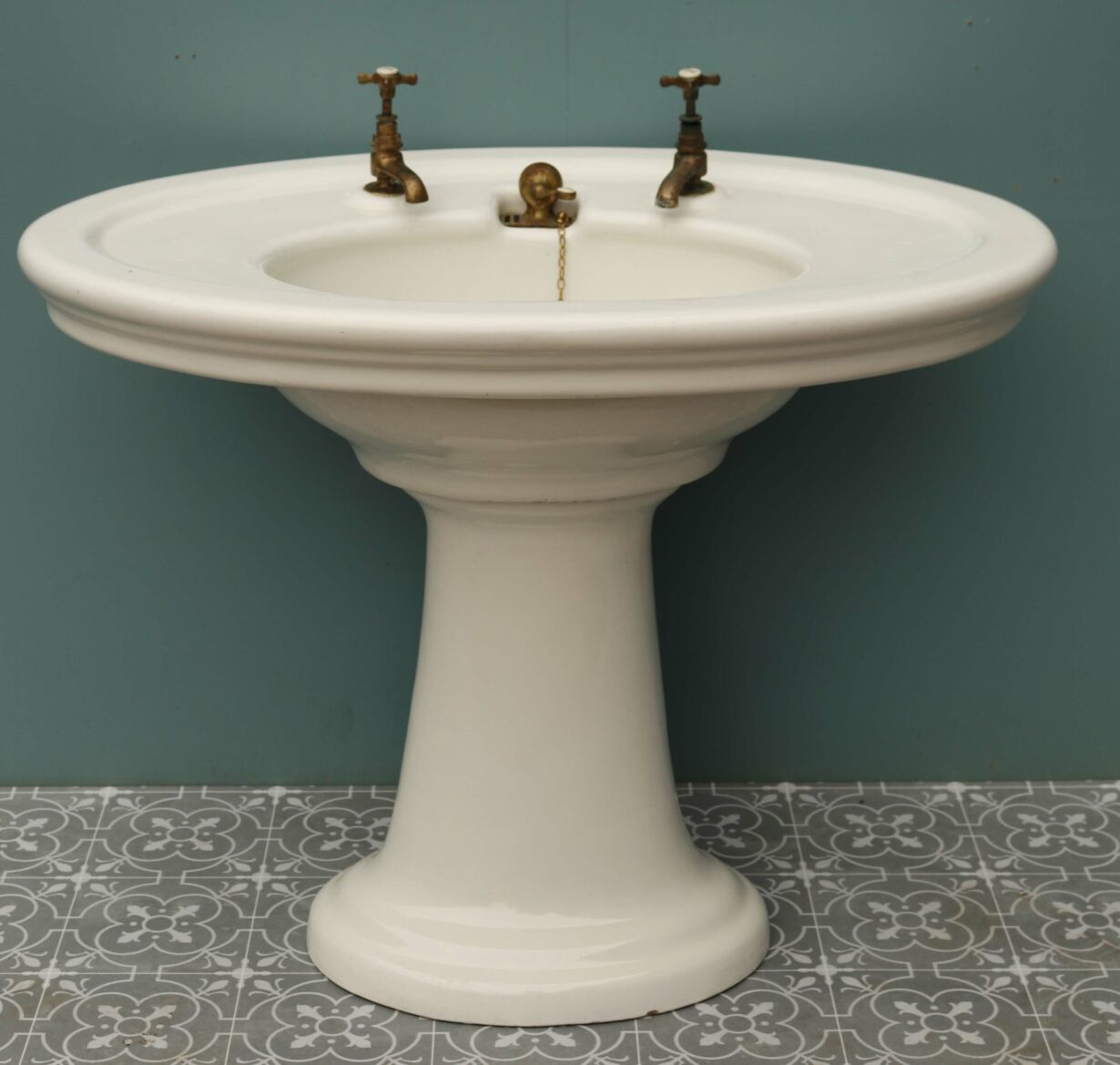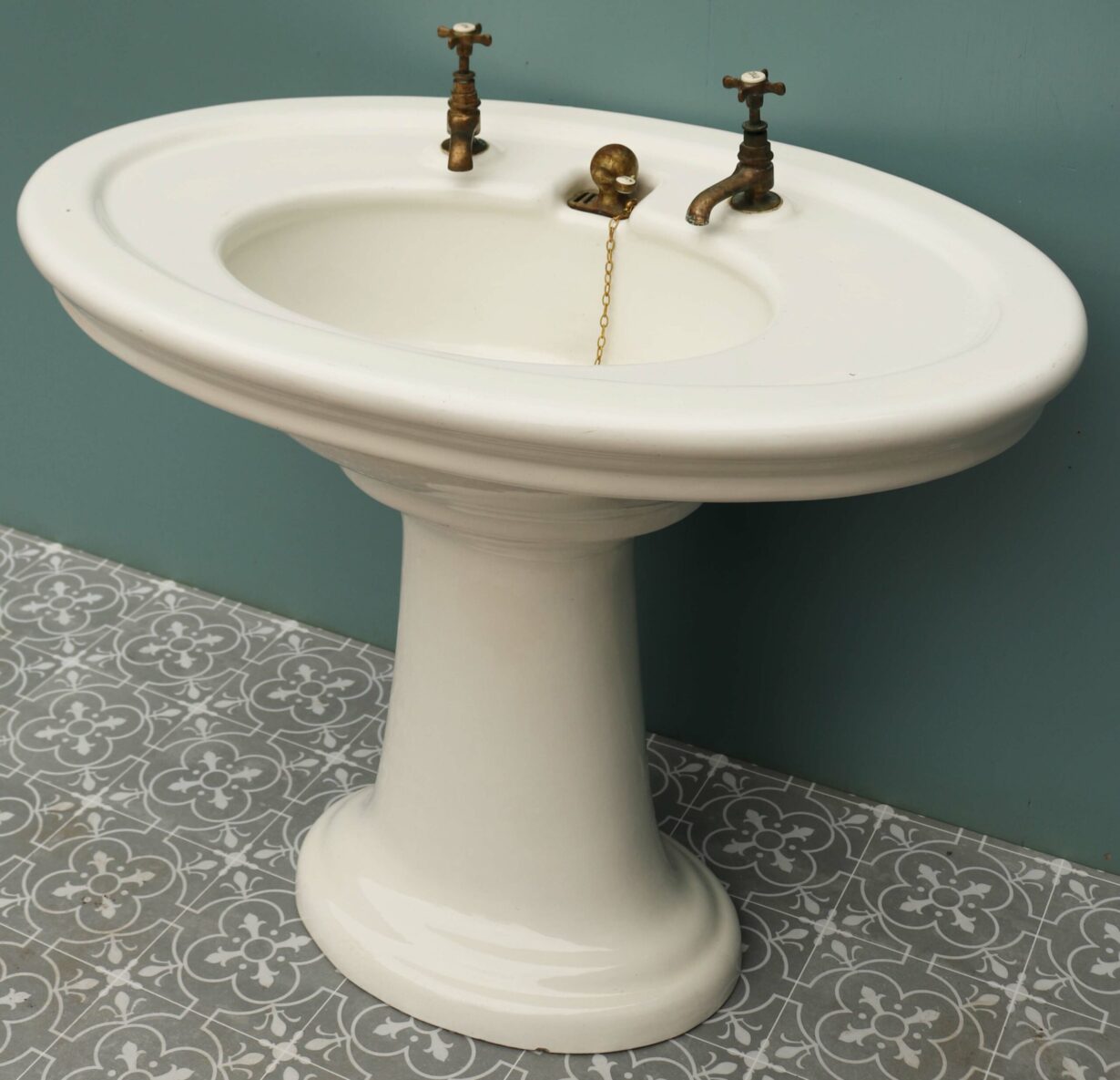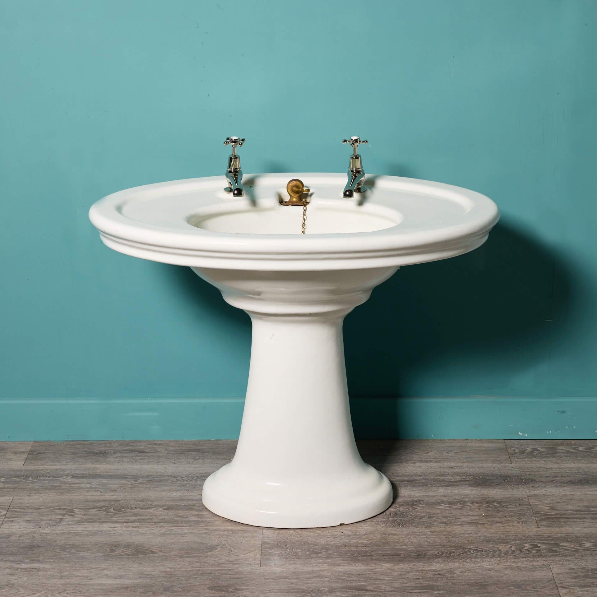 back to topAn elegant antique oval shaped pedestal sink originating from England. This quaint 1920s stoneware sink is of an impressive scale. The pleasing basin, thickly cast pedestal and wide rim make this unusual freestanding sink perfect for a main bathroom of period and contemporary properties alike.